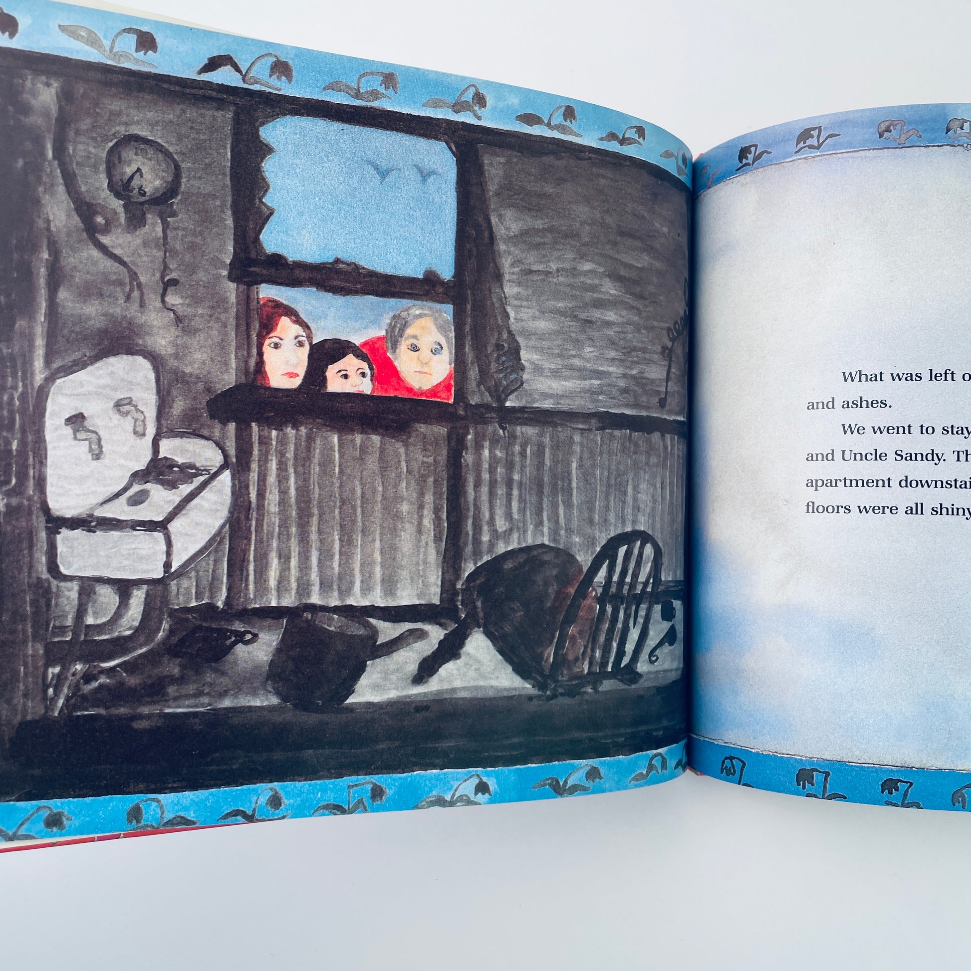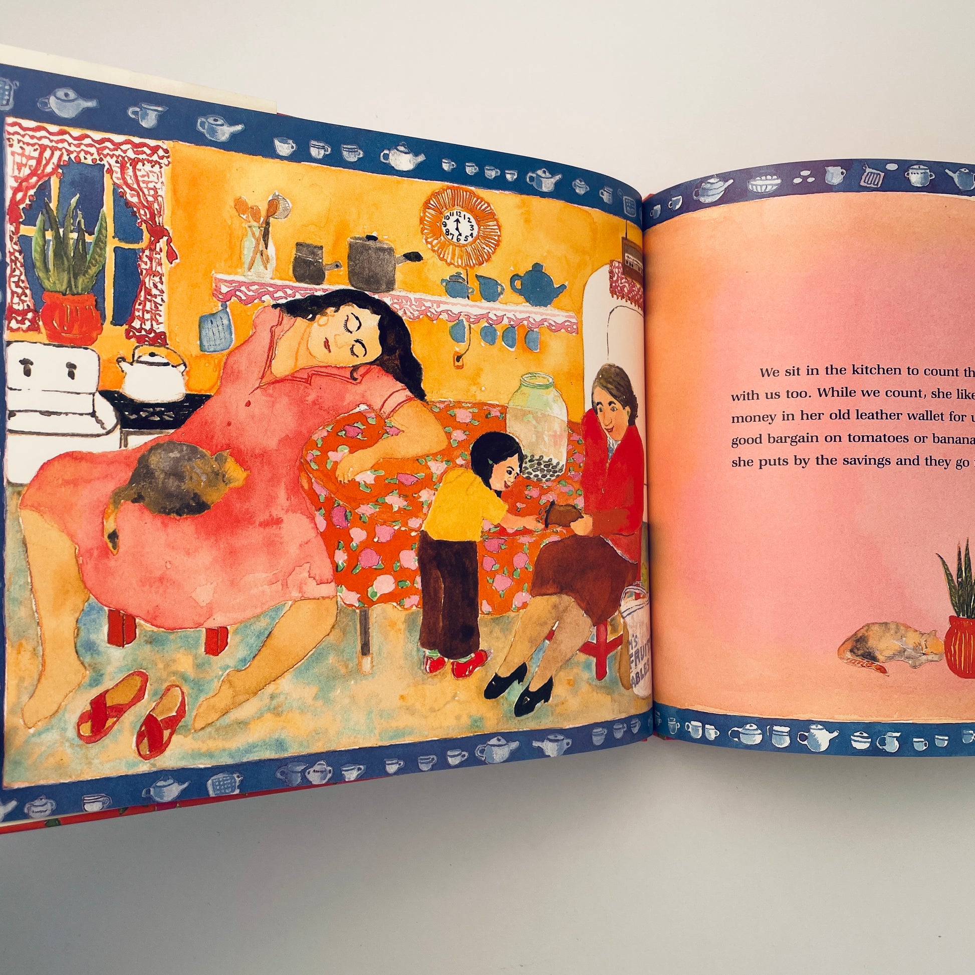 There hasn't been a comfortable place to sit in the apartment since a fire in their previous apartment burned everything to "charcoal and ashes." Friends and neighbors brought furniture to their new apartment downstairs, but no one brought anything big or soft or comfortable. Finally the jar is full, the coins are rolled, and in the book's crowning moment, mother, daughter, and Grandma search four different furniture stores, and after carefully trying several chairs, like Goldilocks, they find the chair they've been dreaming of at last.
