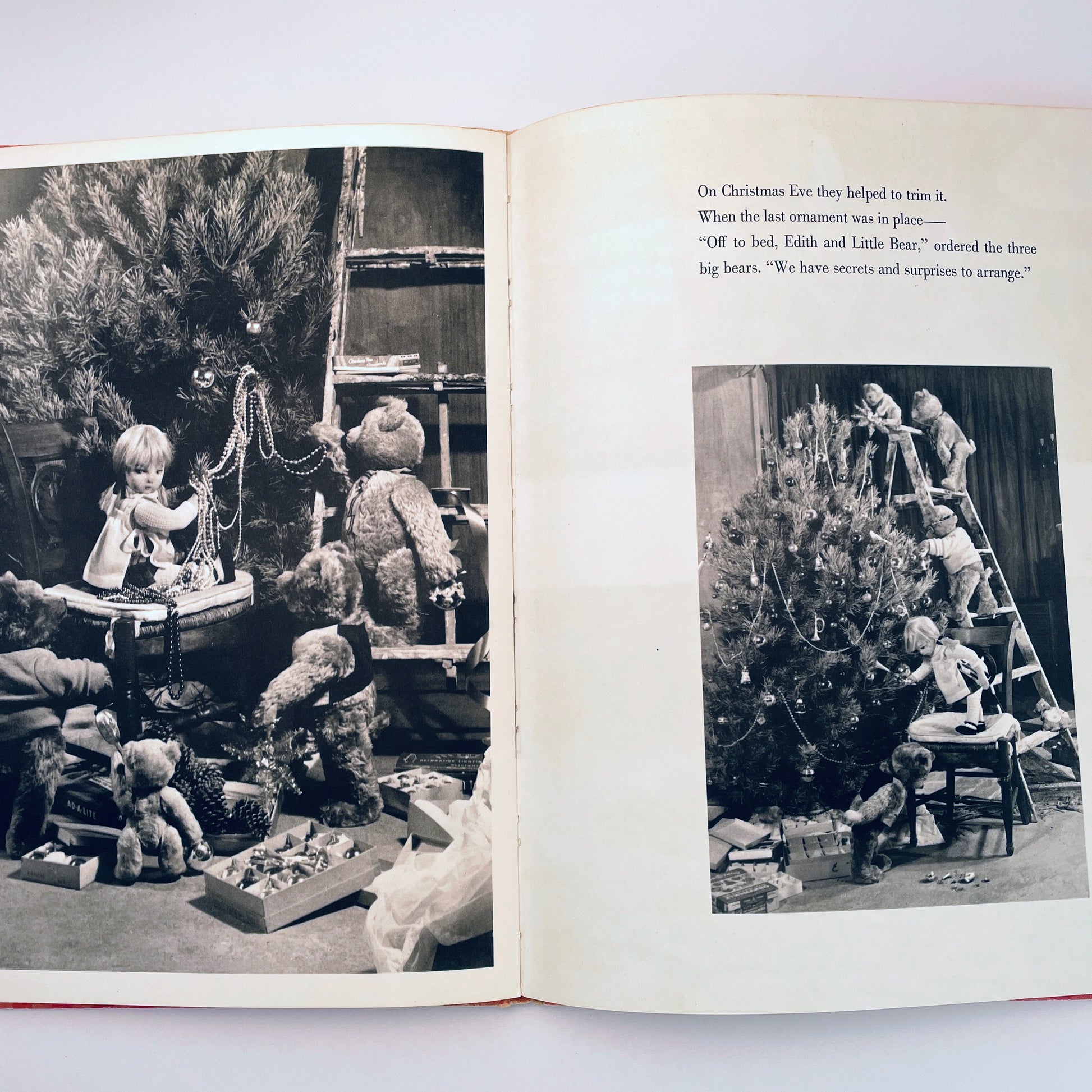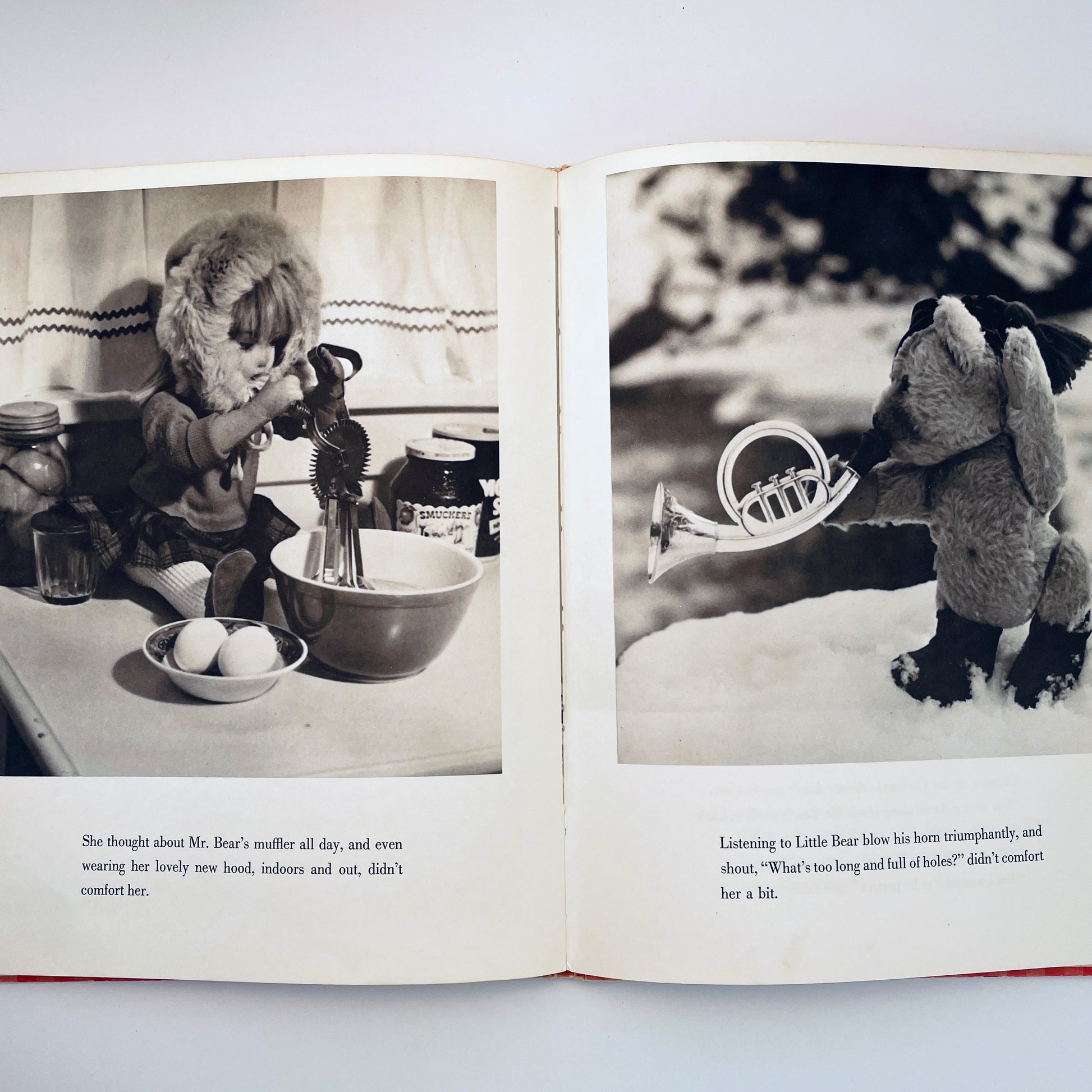 Edith ("The Lonely Doll") struggles with the choice of a Christmas gift for Mr. Bear, finally realizing that something made by hand would be far better than something bought in a store. A knitted muffler seemed a perfect choice, especially since Edith, Mr. Bear and Little Bear are planning to spend the holidays with cousins Charles Bear and Albert Bear in the snowy hills of upstate New York. Edith knits whenever Mr. Bear isn’t watching, hiding her project in a woven basket without realizing how much yarn she’s been using. When the presents are opened on Christmas morning, Mr. Bear's gift is long enough for three bears! Edith is miserable about it, until she finds the perfect solution. She cuts the muffler into gifts for both Mr. Bear and his two cousins, and the day ends very happily.