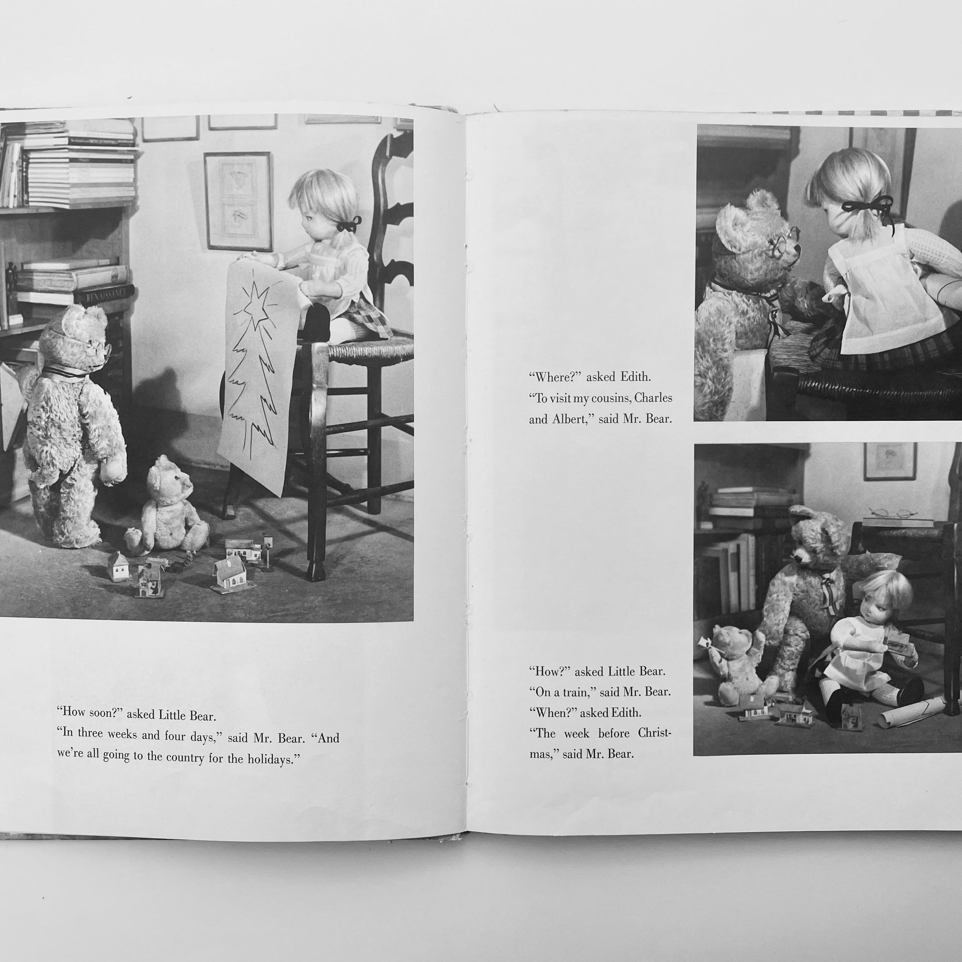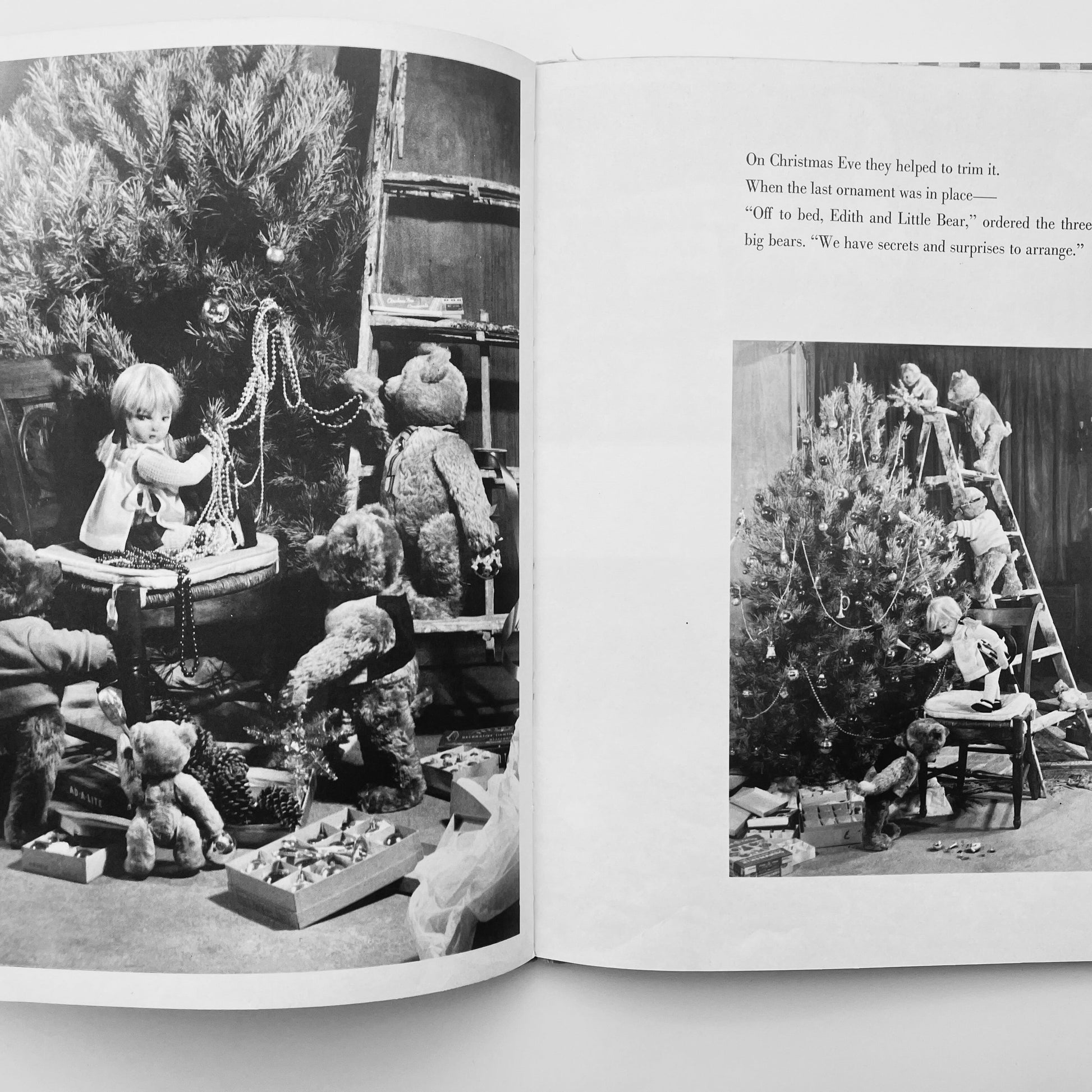 Edith ("The Lonely Doll") struggles with the choice of a Christmas gift for Mr. Bear, finally realizing that something made by hand would be far better than something bought in a store. A knitted muffler seemed a perfect choice, especially since Edith, Mr. Bear and Little Bear are planning to spend the holidays with cousins Charles Bear and Albert Bear in the snowy hills of upstate New York. Edith knits whenever Mr. Bear isn’t watching, hiding her project in a woven basket without realizing how much yarn she’s been using. When the presents are opened on Christmas morning, Mr. Bear's gift is long enough for three bears! Edith is miserable about it, until she finds the perfect solution. She cuts the muffler into gifts for both Mr. Bear and his two cousins, and the day ends very happily.