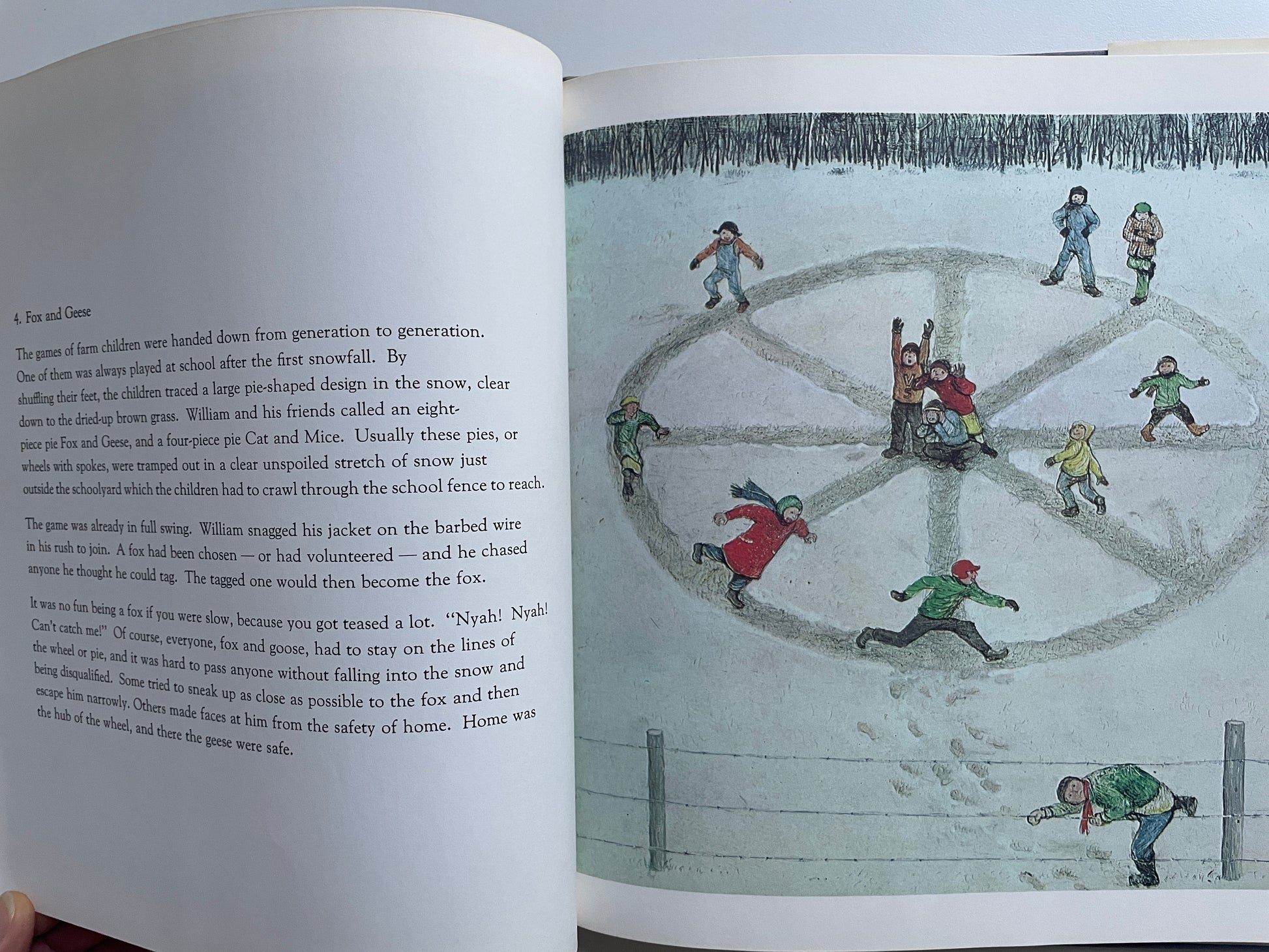 But William and his friends also played games. They cleared and flooded their own hockey rinks and played with sticks and shin-pads they had made themselves. The flat prairie land was perfect for such games as as Fox and Geese. The huge drifts that built up around bushes, as the wind blew the snow across the vast prairie wastes, were so deep apartments several stories high could be tunneled through them. And when there was no one to play with, William could skate alone down miles of bog ditches.