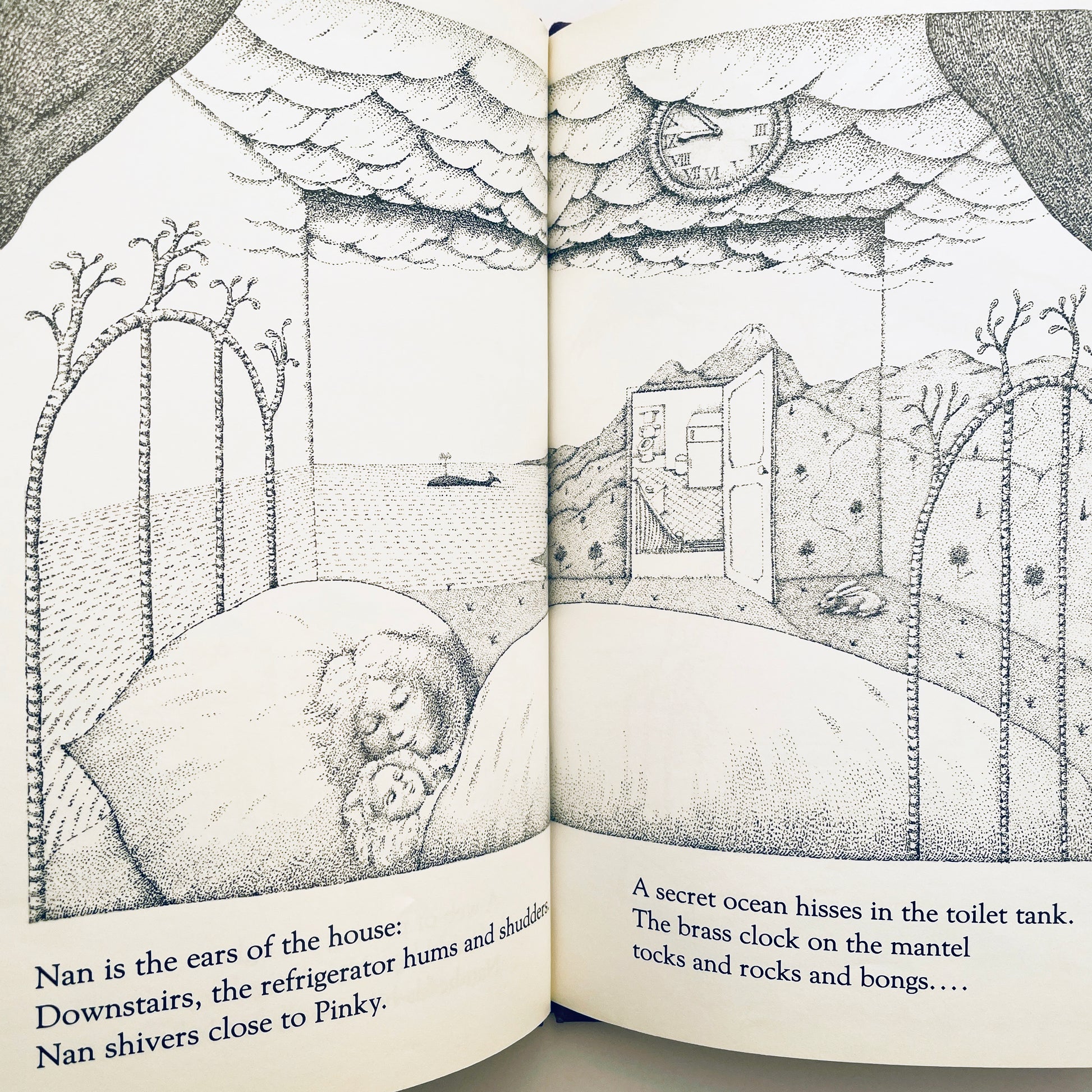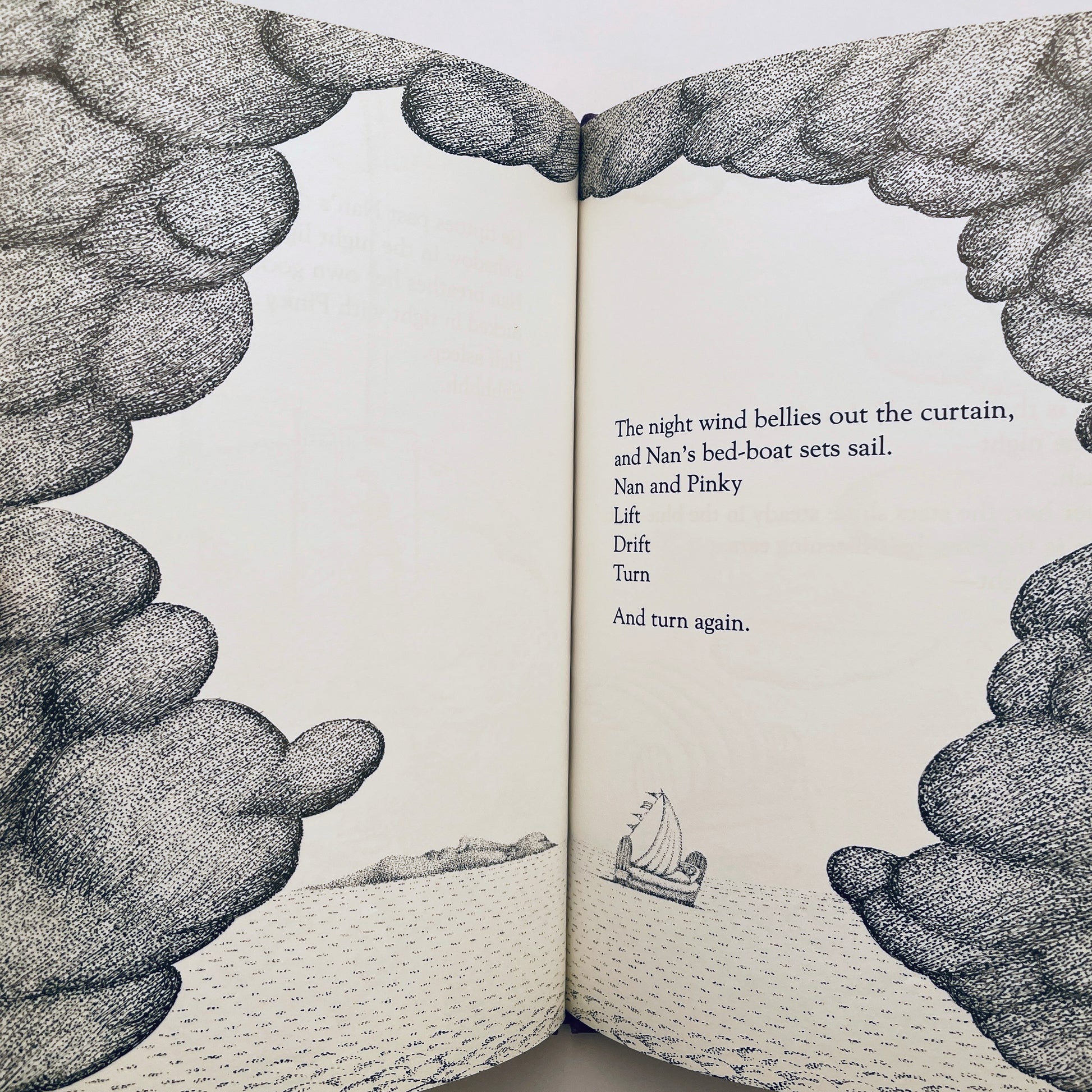In a pleasantly gentle nighttime book, Nan is awake after her brothers and parents go to sleep. She sees car lights and hides from them. She hears the water in the toilet tank, and imagines it an ocean upon which she will eventually float away into dreamland on her bed boat. Nan's ordinary bedroom is gradually transformed into a dream landscape of trees filled with images of time and doorways that lead to the soothing ocean of sleep. A book to read over and over to a young child on the way to bed.