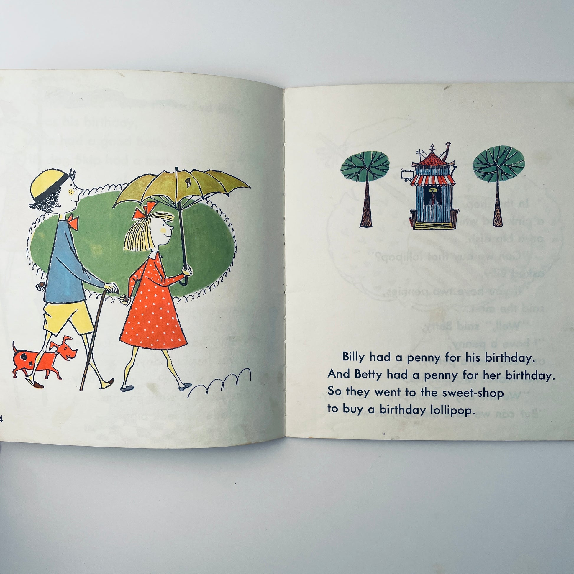 Billy and his younger friend Betty both have birthdays and eat themselves sick and to sleep on sweets. This is a Words Your Children Use Book specially adapted for Stage One readers. Very rare and collectible book.