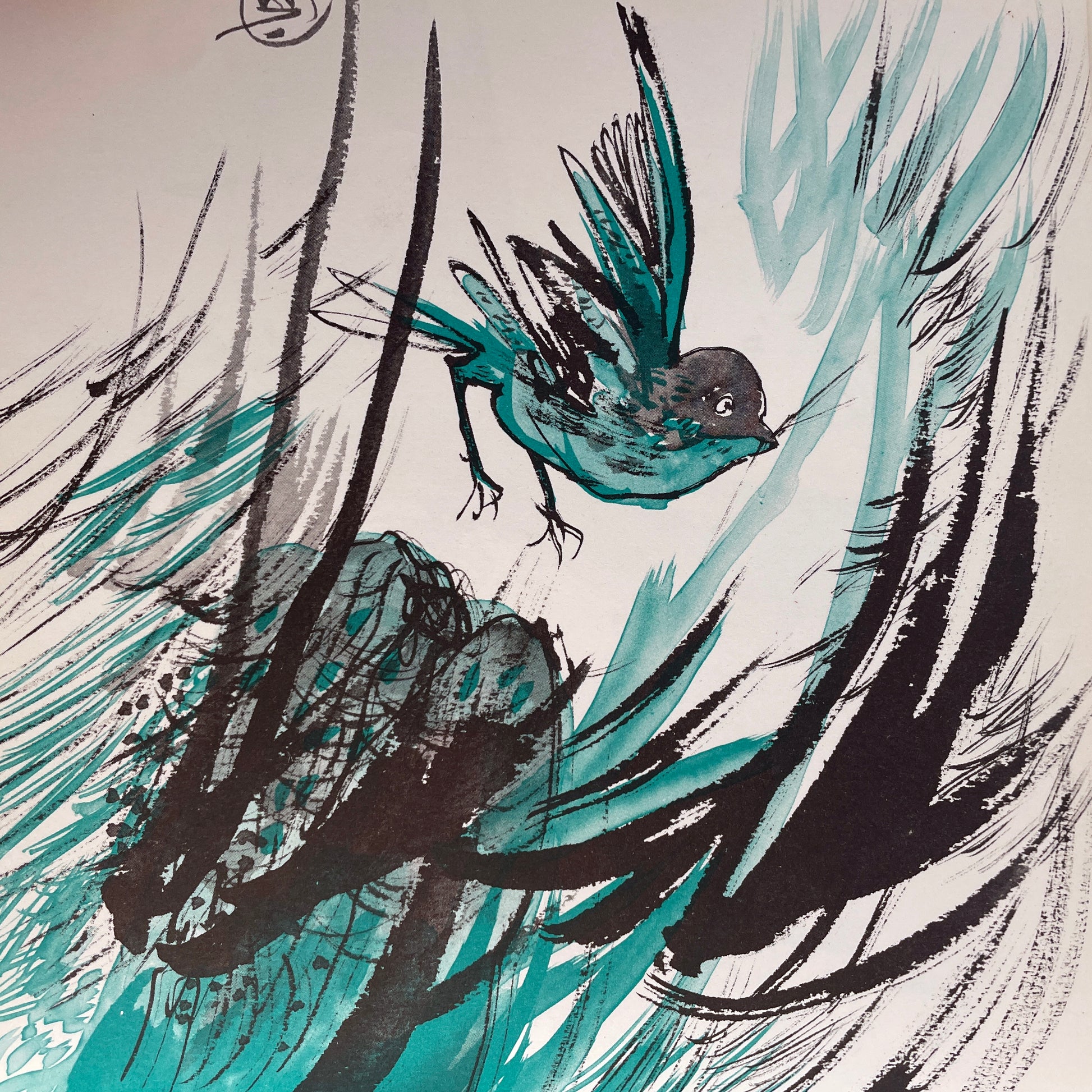 A collection of haiku poetry that includes original Japanese calligraphy, the transliterated versions, the English translations, and brush and line illustrations. The poems delve into the beauty and details of the natural world, with a particular focus on the sounds of birds and frogs, as well as the ethereal glow of moonlight.