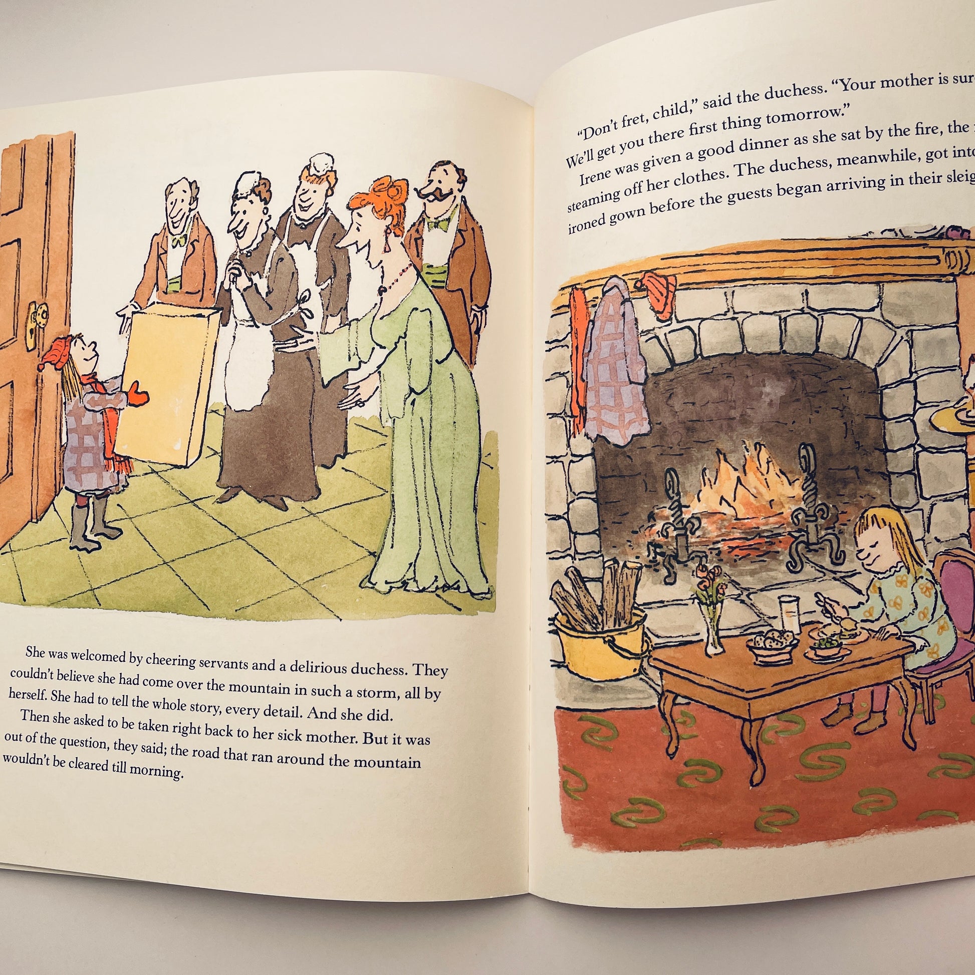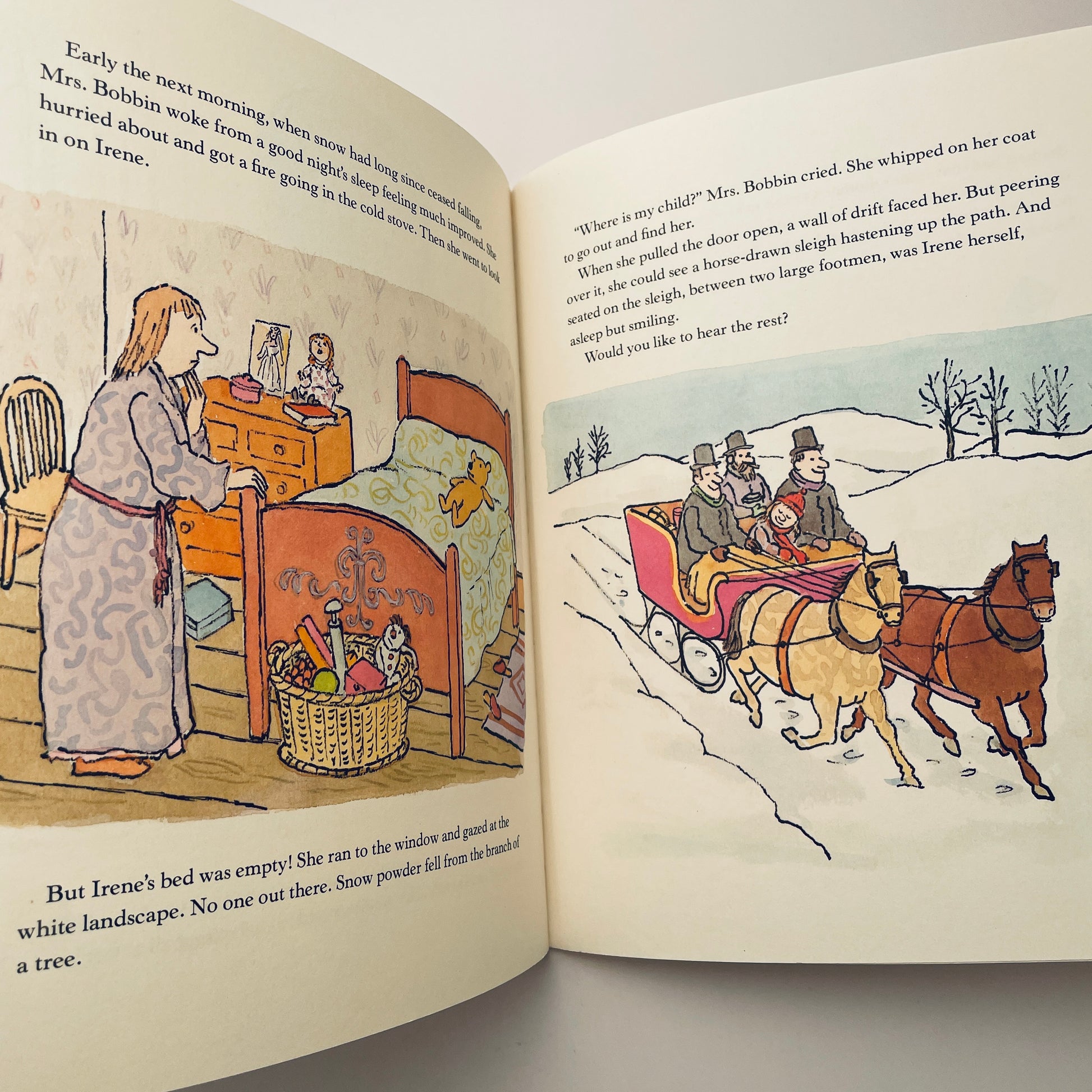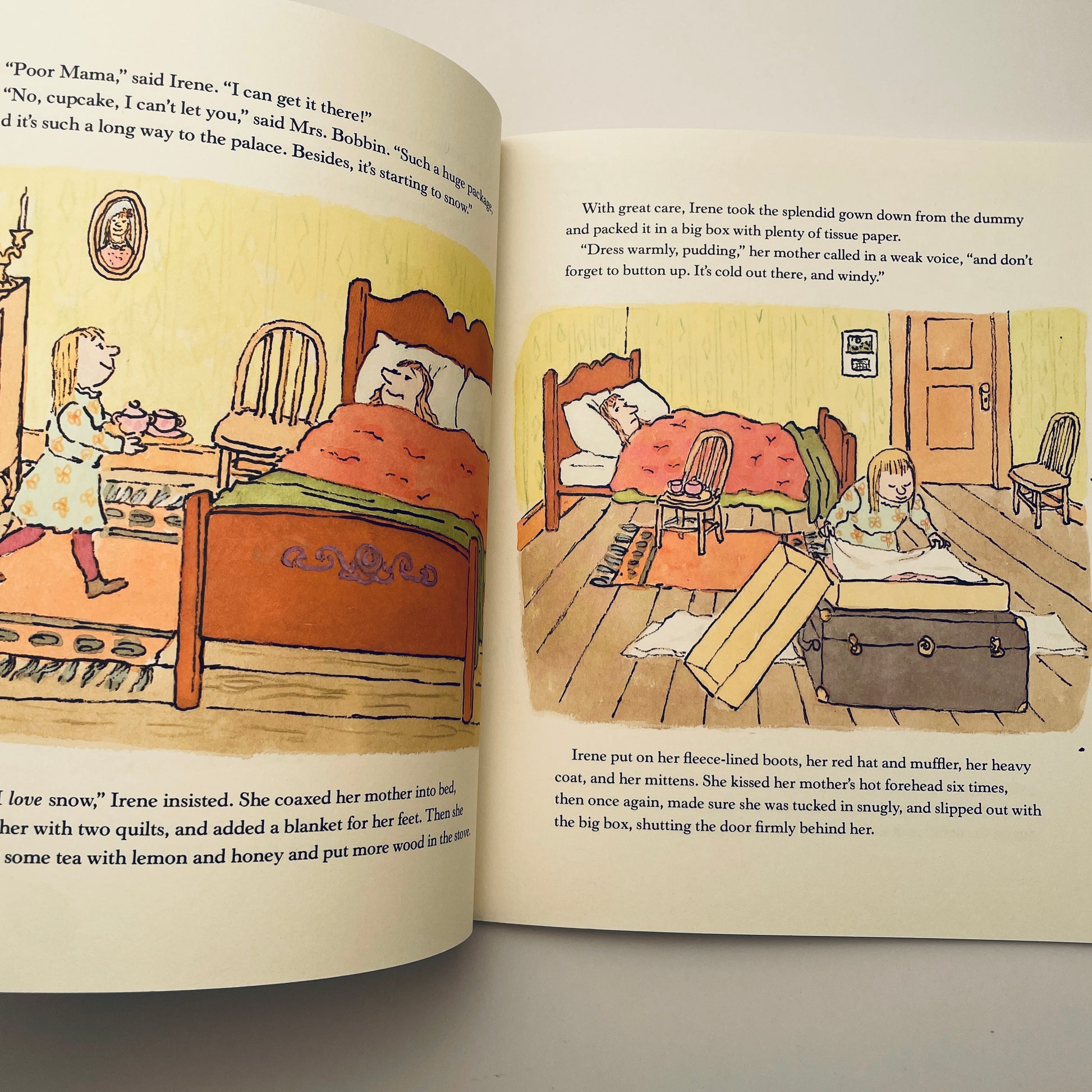 Brave Irene is Irene Bobbin, the dressmaker's daughter. Her mother, Mrs. Bobbin, isn't feeling so well and can't possibly deliver the beautiful ball gown she's made for the duchess to wear that very evening. So plucky Irene volunteers to get the gown to the palace on time, in spite of the fierce snowstorm that's brewing–quite an errand for a little girl.