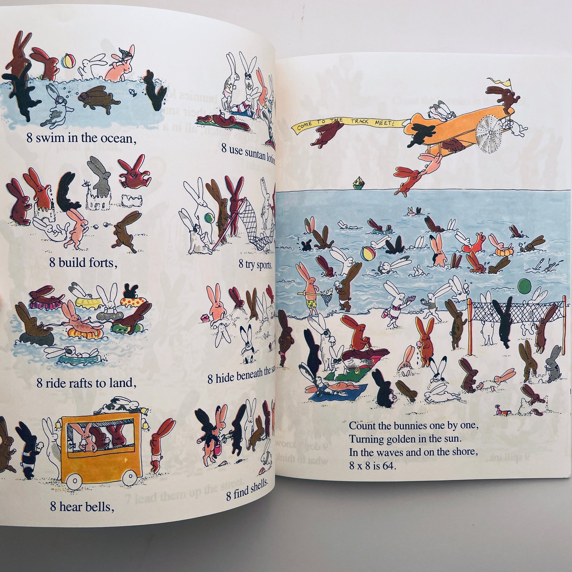 Busy bunnies demonstrate that the numbers from one to twelve multiplied by themselves is really a form of addition.