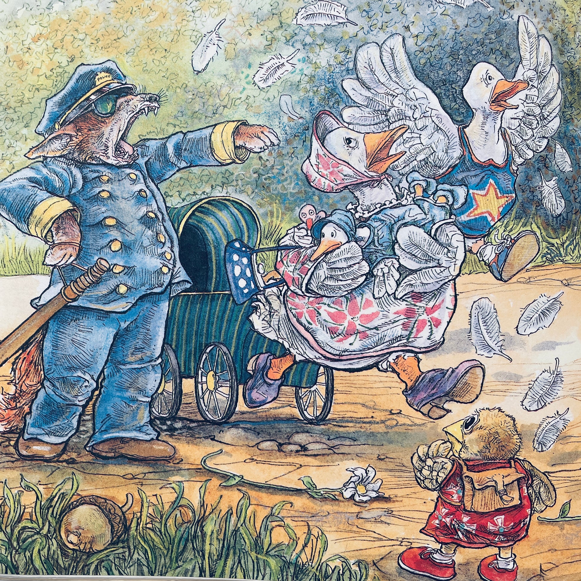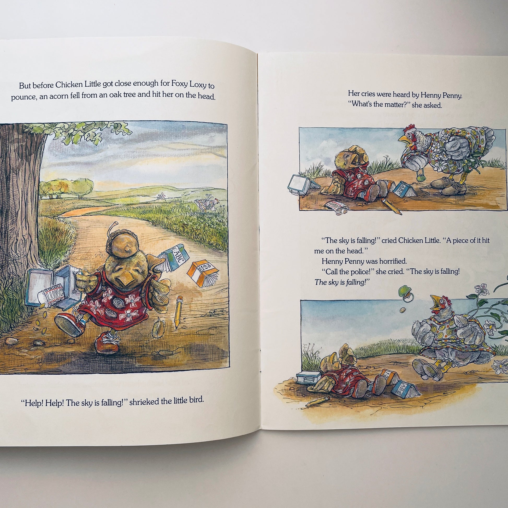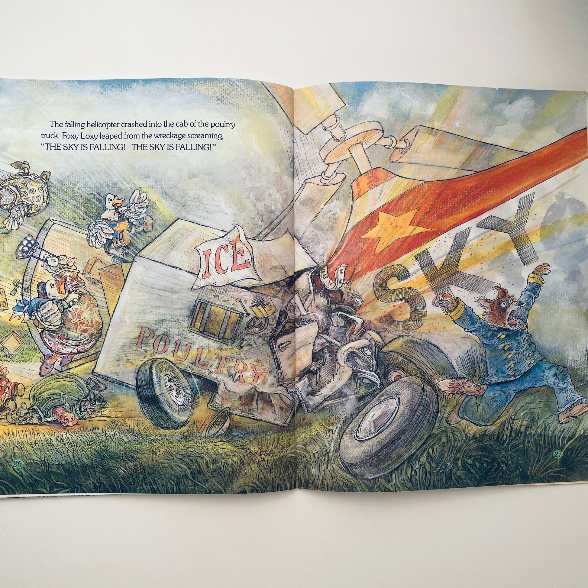 "The sky is failing! The sky is failing!" Chicken Little and her feathered friends are all aflutter when she gets a mysterious bump on the head. Steven Kellogg's hilarious retelling and irresistible illustrations bring fresh delight to this timeless classic of chain reaction panic.