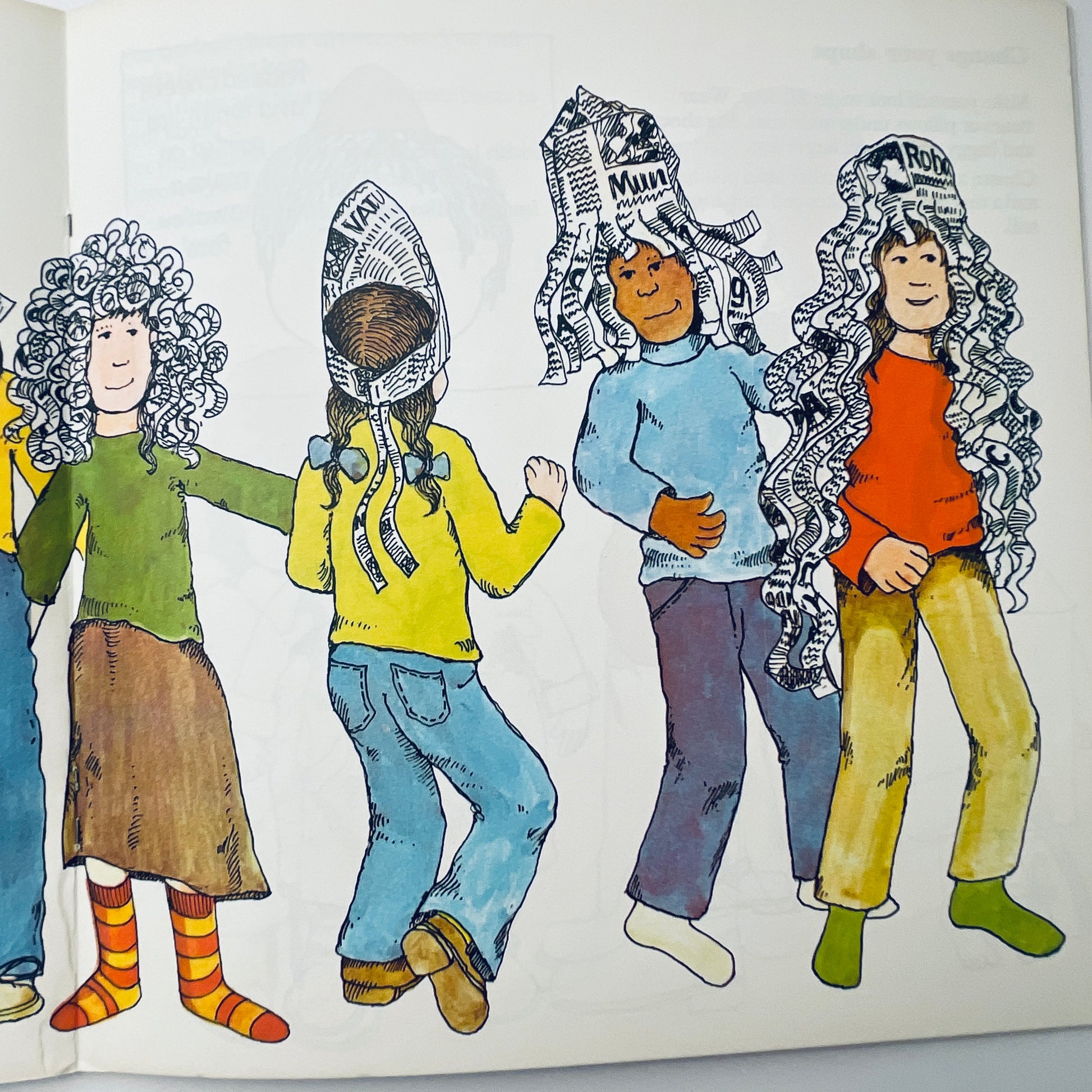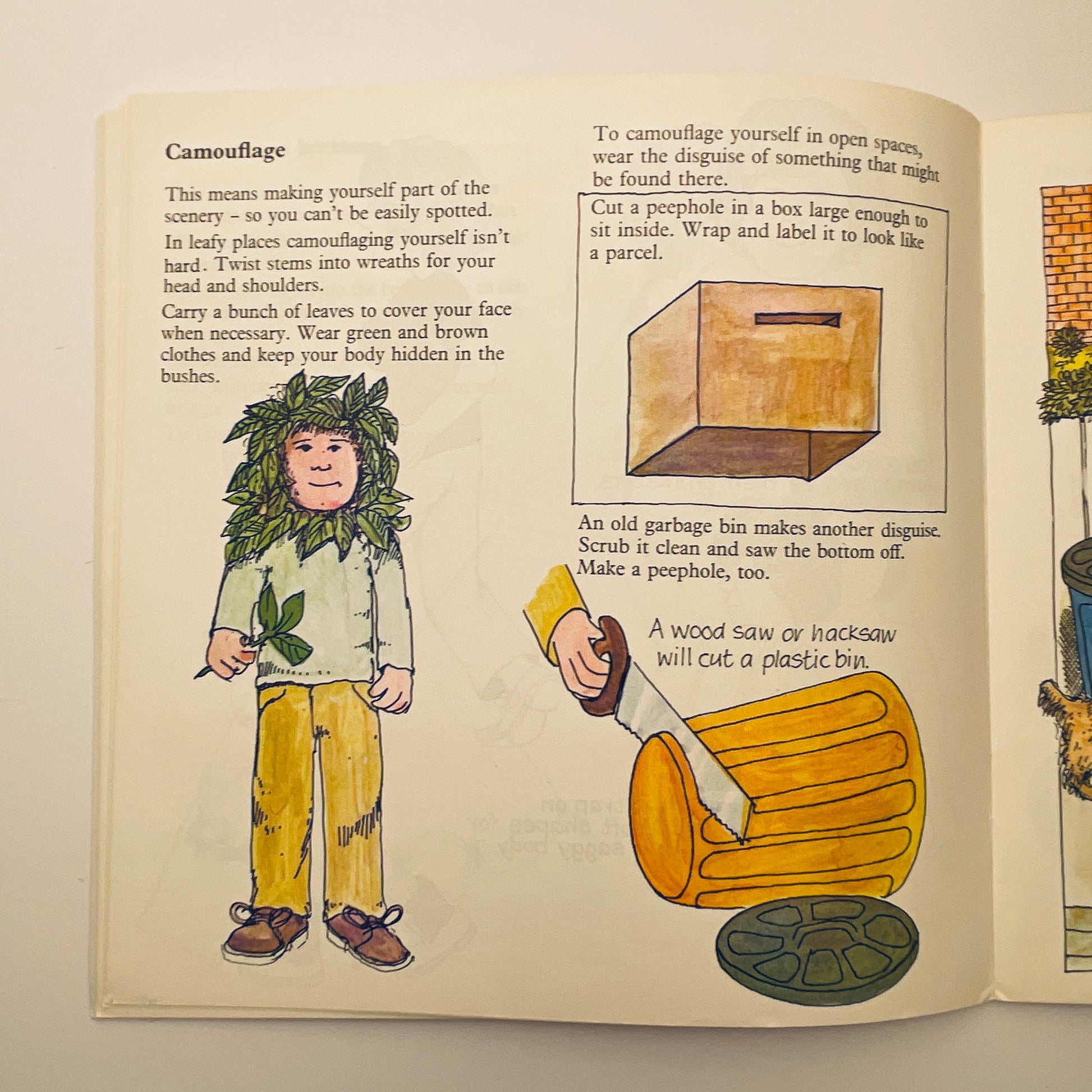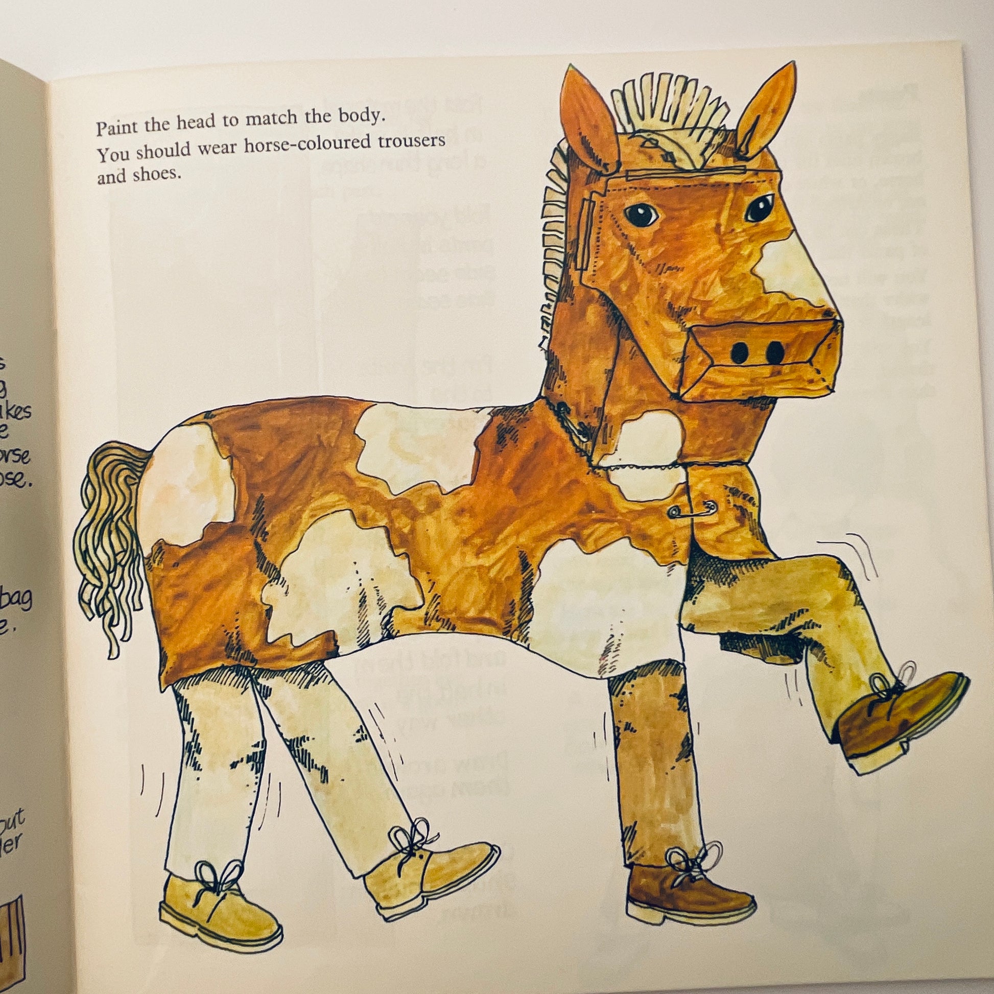 People put things on themselves for many strange reasons – not only to keep warm and dry, but to make themselves feel better or different from anyone else. Here is a collection of cover-ups to suit all kinds of days. You can be a pantomime horse, or paint yourself all over, or wear a pair of horns, or make a coat from a blanket or sew a swirling tablecloth cloak.