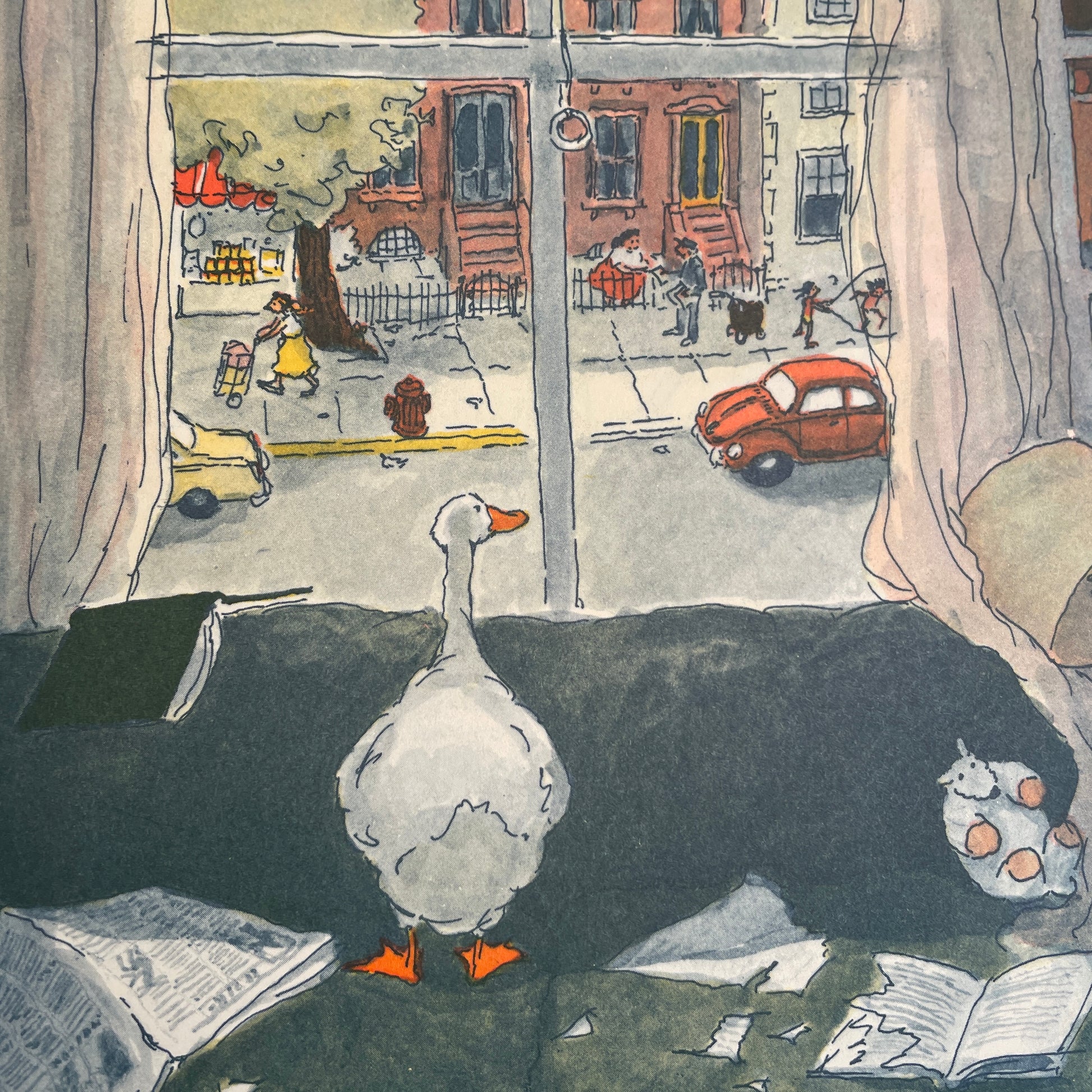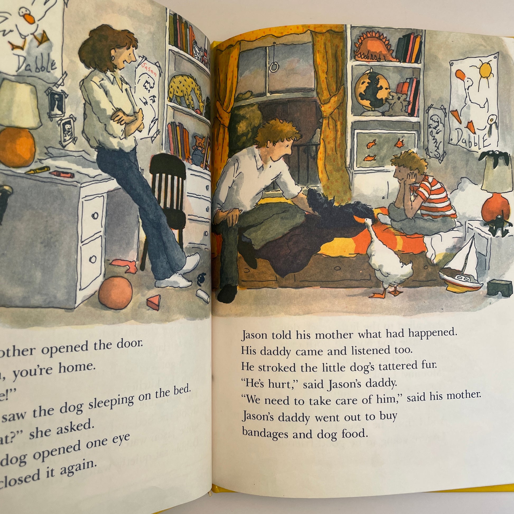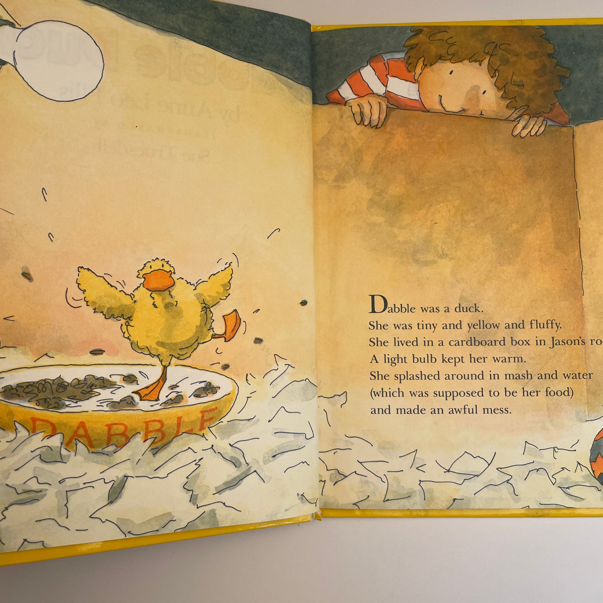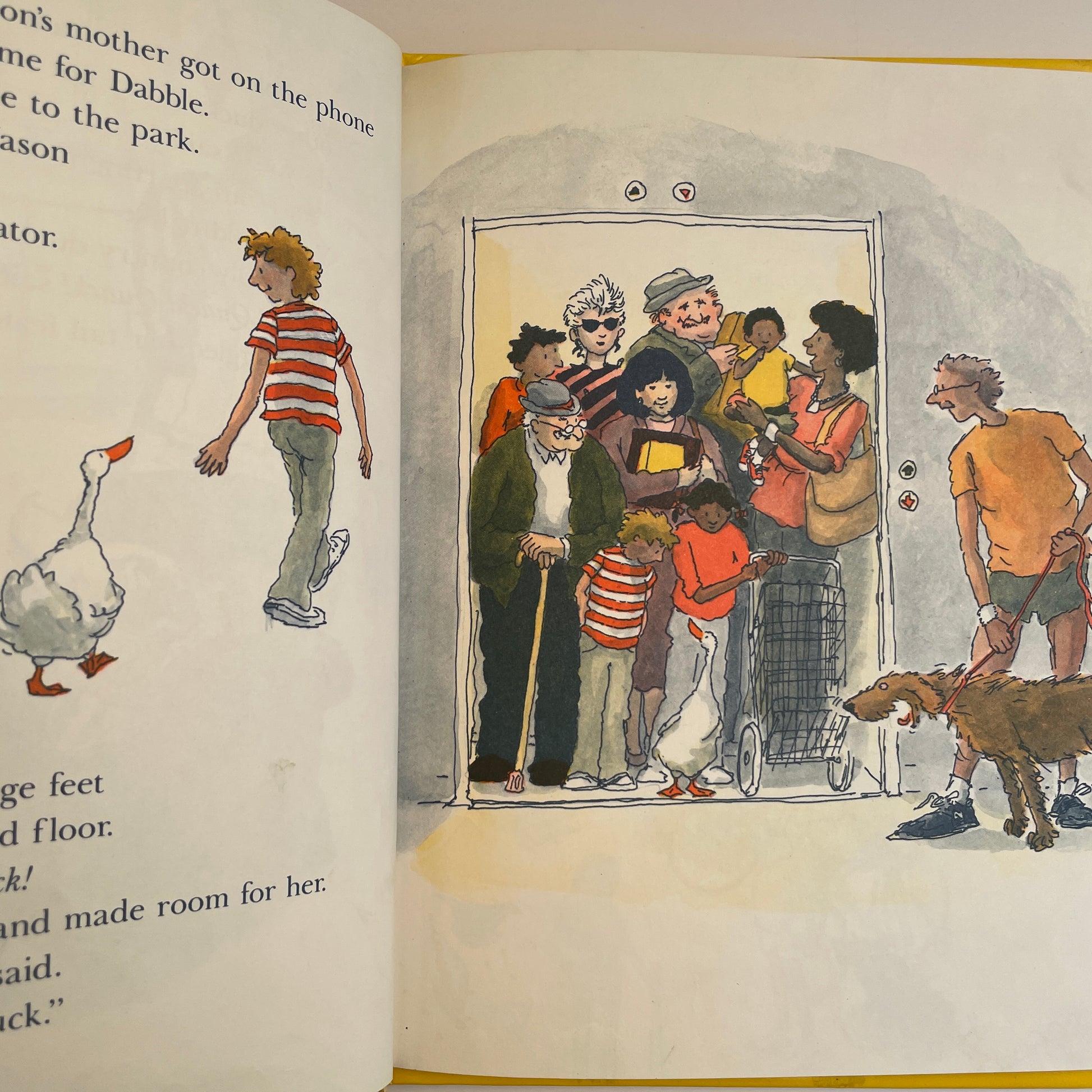 Dabble was a duck. At first, she was tiny and yellow and fluffy. She lived in a cardboard box in Jason's room. As Dabble grew, Jason and Dabble became great pals. They took walks, ran around the apartment, and quacked at each other. But when Jason went to school, Dabble missed him very much. So Jason's mom started thinking that maybe Dabble belonged in the country with other ducks. Jason knew Dabble was an apartment duck. Together, Jason and Dabble had to find the perfect solution for staying together.