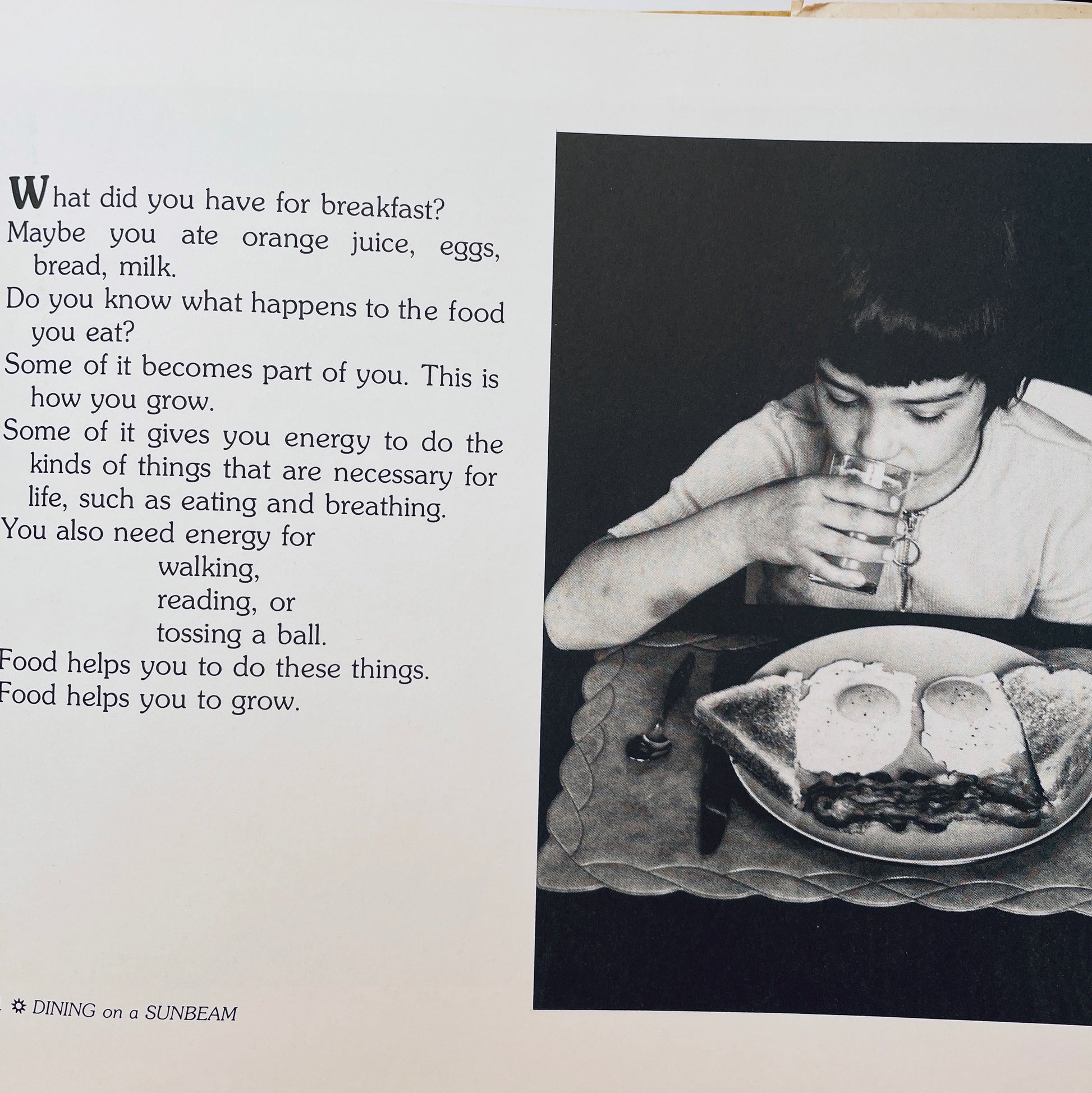 Children will discover that everything they ate for breakfast this morning–even the milk–started with green plants and sunlight. (A cow has to eat fourteen pounds of green grass to produce a quart of milk!)
