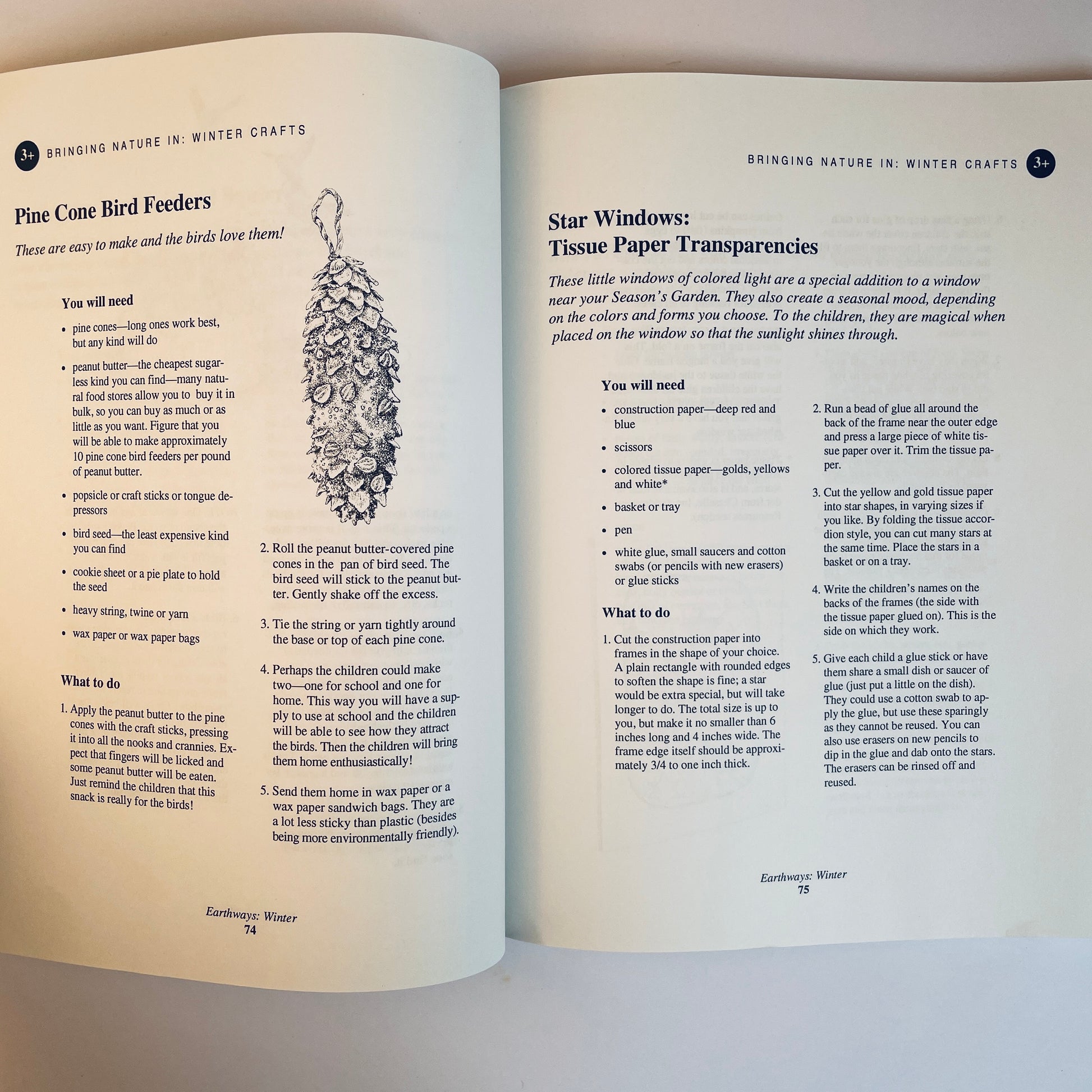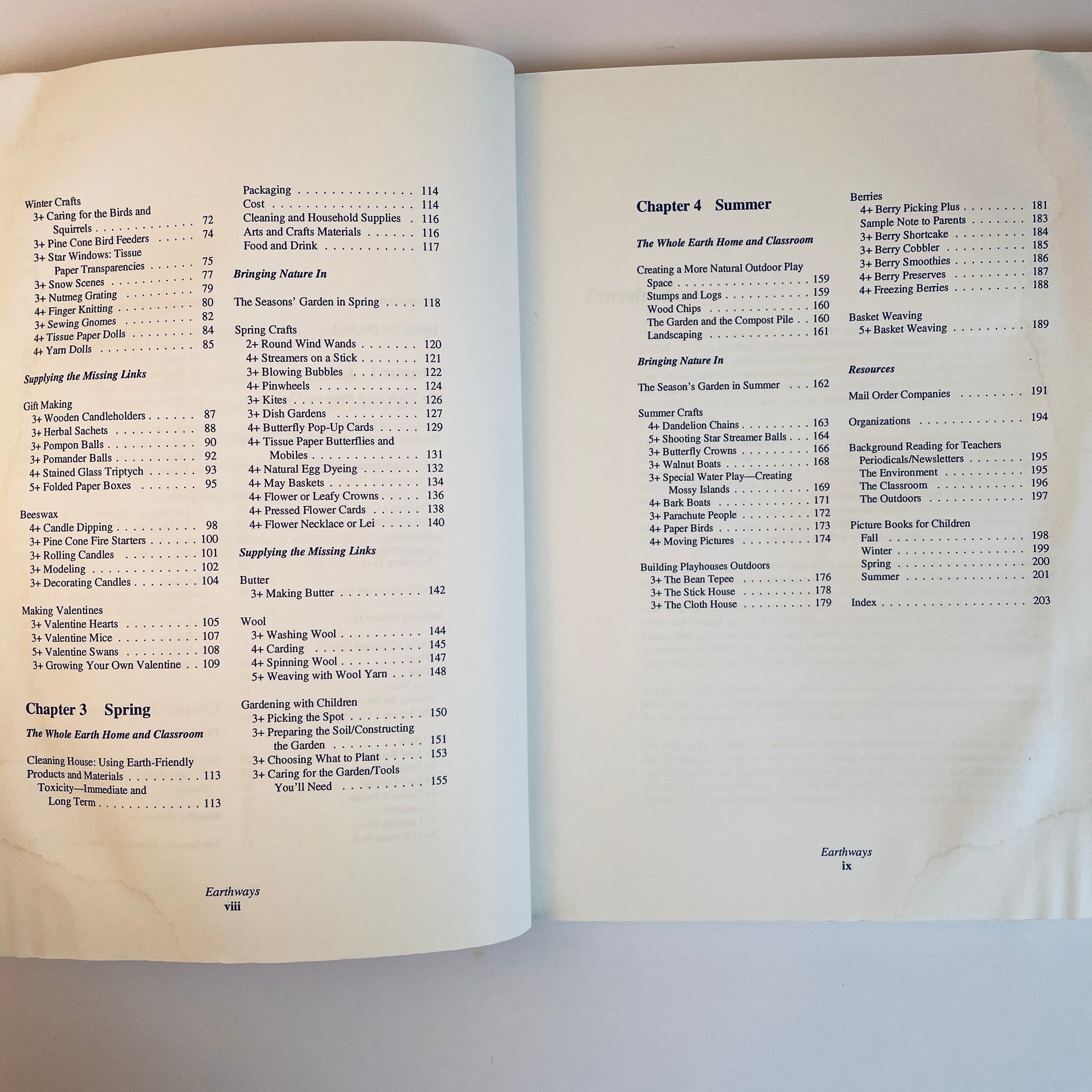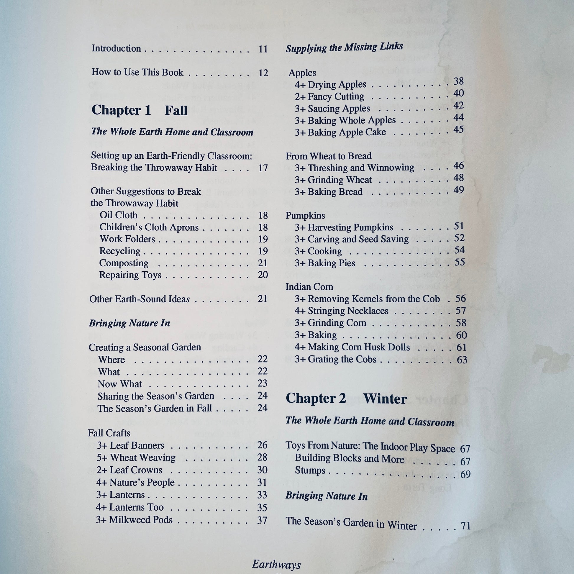 Earthways is filled with hands-on nature crafts and seasonal activities to enhance environmental awareness. The activities are carefully written and beautifully illustrated. Children play with the elements of earth, air and water. They develop respect for nature, for the earth and for all living creatures. They experience the awe and wonder of the world around them. Children learn firsthand about their dependence on the earth. They can learn how to take stalks of wheat and turn them into flour for making bread, how to be a creator and not just a consumer by making gifts, how to make butter and grow food (even in the city), and how to make outdoor playhouses. Seasonal suggestions for creating a more earth-friendly home and classroom are also included, in addition to a comprehensive resource list.