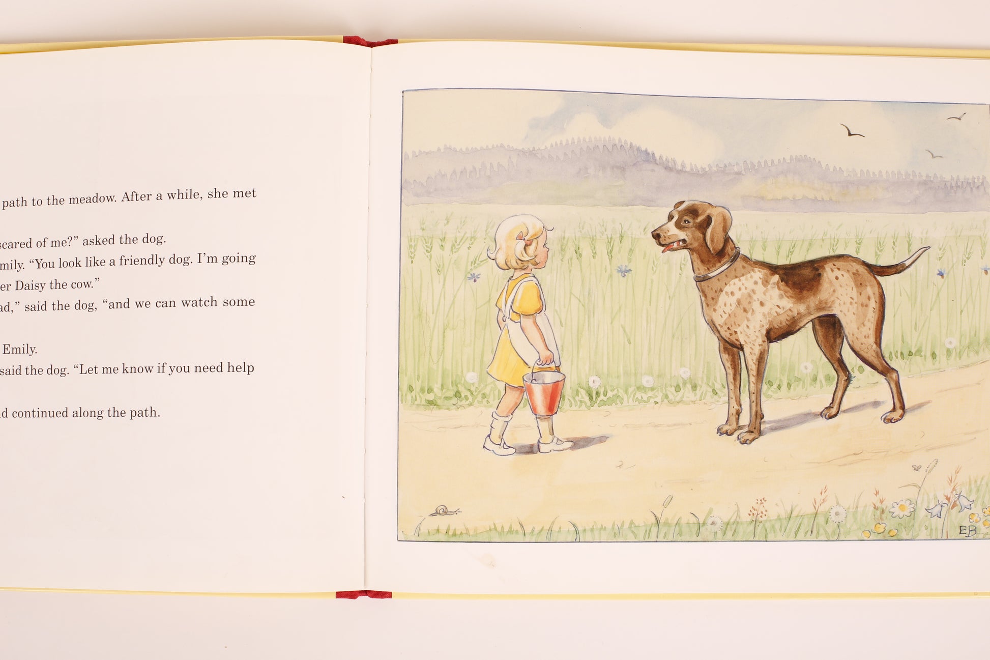 Emily is a helpful little girl, so when her mummy is worried that Daisy the cow will escape into the clover field through a hole in the fence, she offers to go and look after Daisy for the day. On the way, she meets a big dog, a boastful boy and an old man with a sack. But when she gets to the meadow, she realizes she needs help with Daisy, and to mend the fence. Who can she turn to?