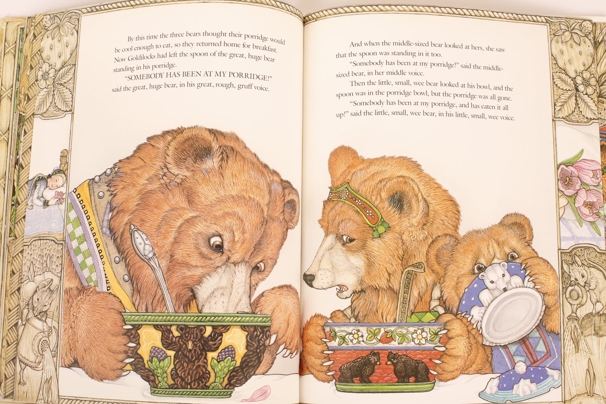 Everybody loves the story of the curious little girl named Goldilocks, who made herself quite at home in the house of the three bears. Jan Brett's lavish illustrations for this classic tale, full of details and surprises, gives this edition a special flair. Children will marvel at the enchanted world created herein.