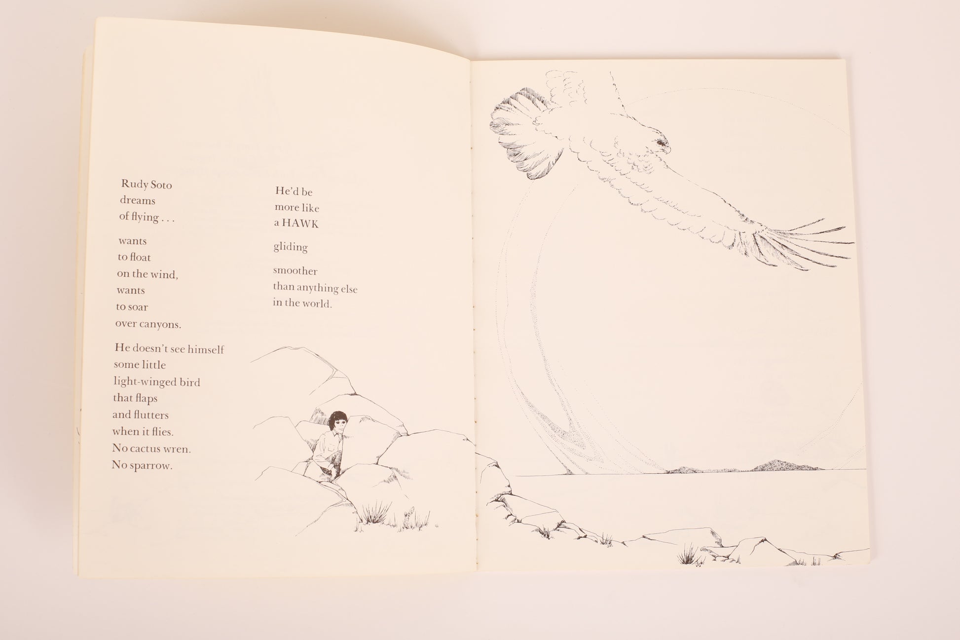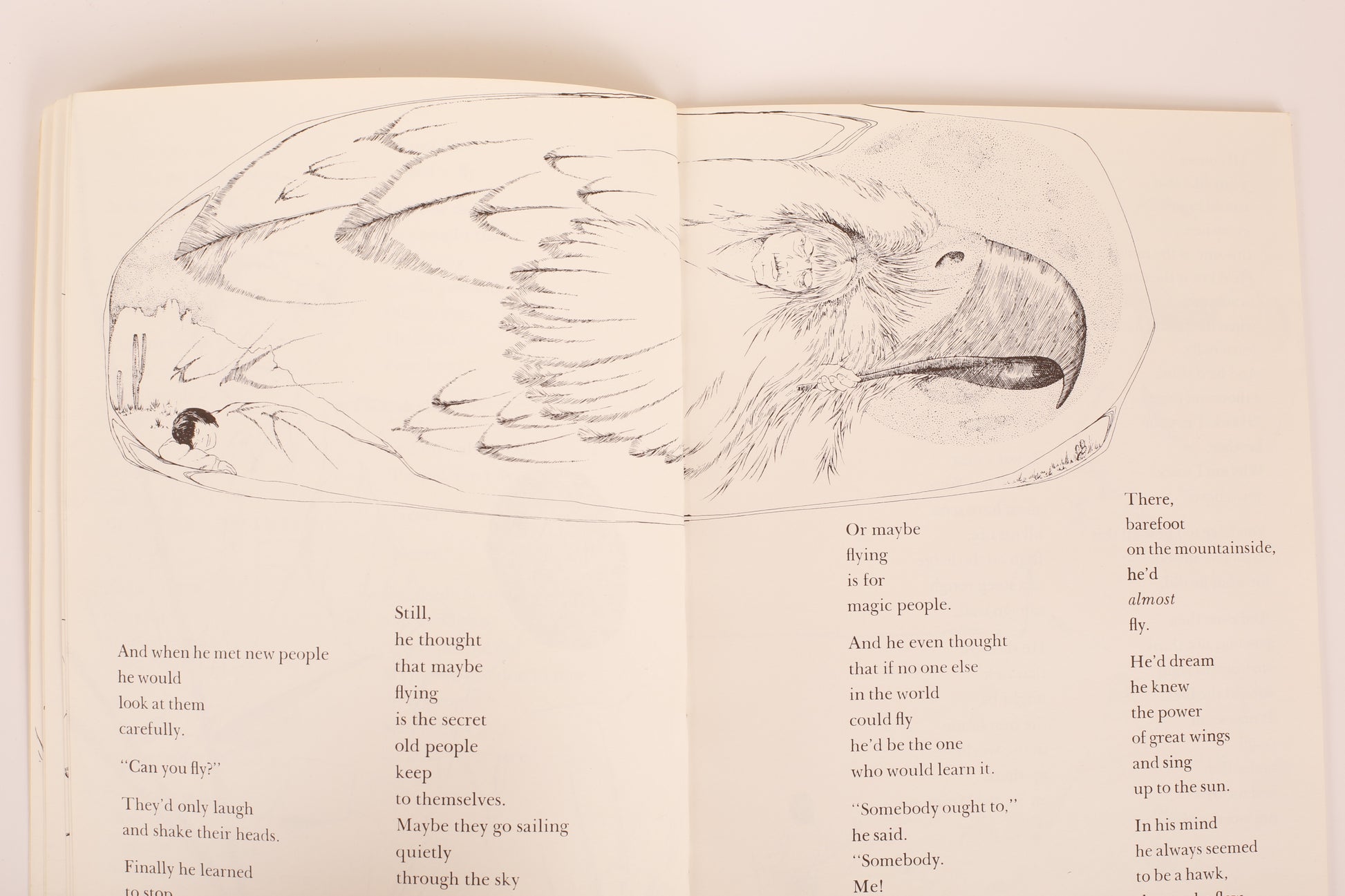 A Native American boy captures a hawk in the hope that he can also capture some sense of its ability to fly….Parnall’s sweeping black-and-white panoramas complement this spare, poetic text.