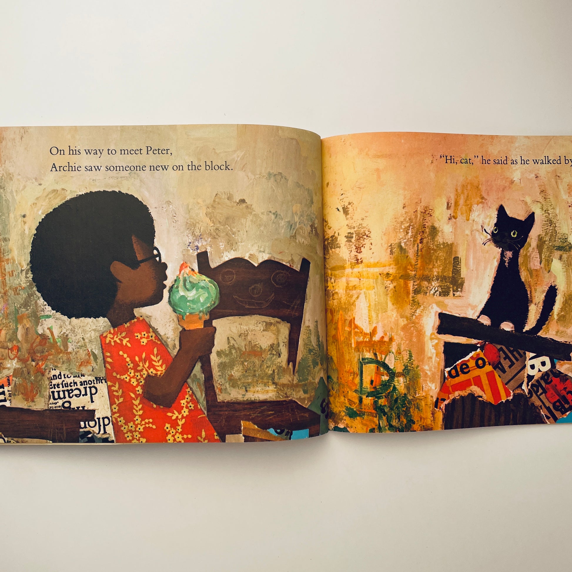 Archie is walking down the street eating an ice cream cone. It’s a beautiful day, and he is on his way to meet his best friend Peter. Suddenly stopped by a newcomer to his neighborhood, Archie says, “Hi, cat!” The cat sits, looks him up and down, and purrs. It turns out to be the beginning of a beautiful friendship.