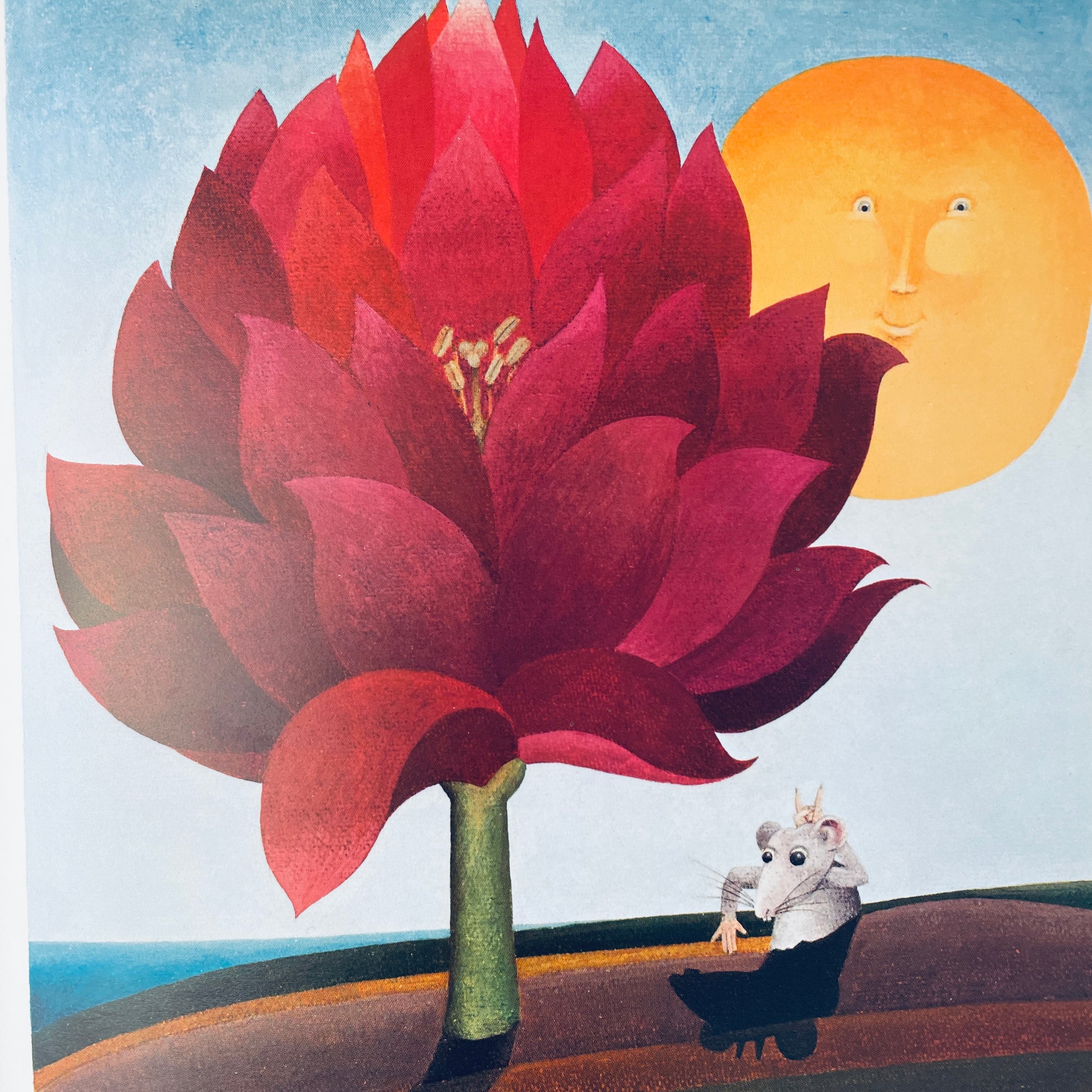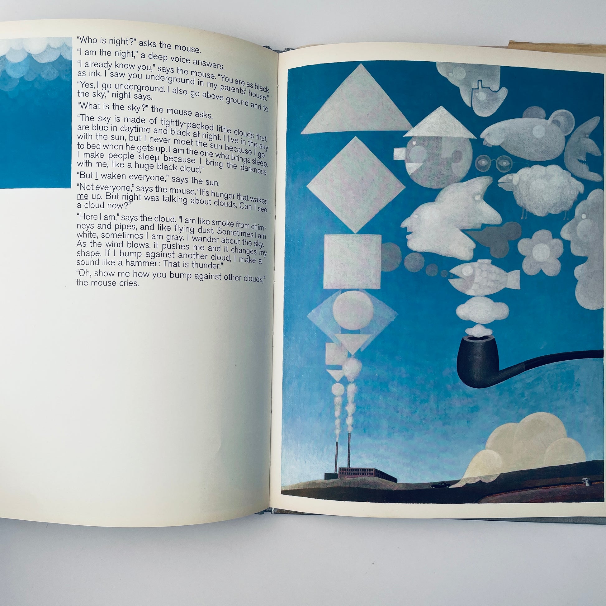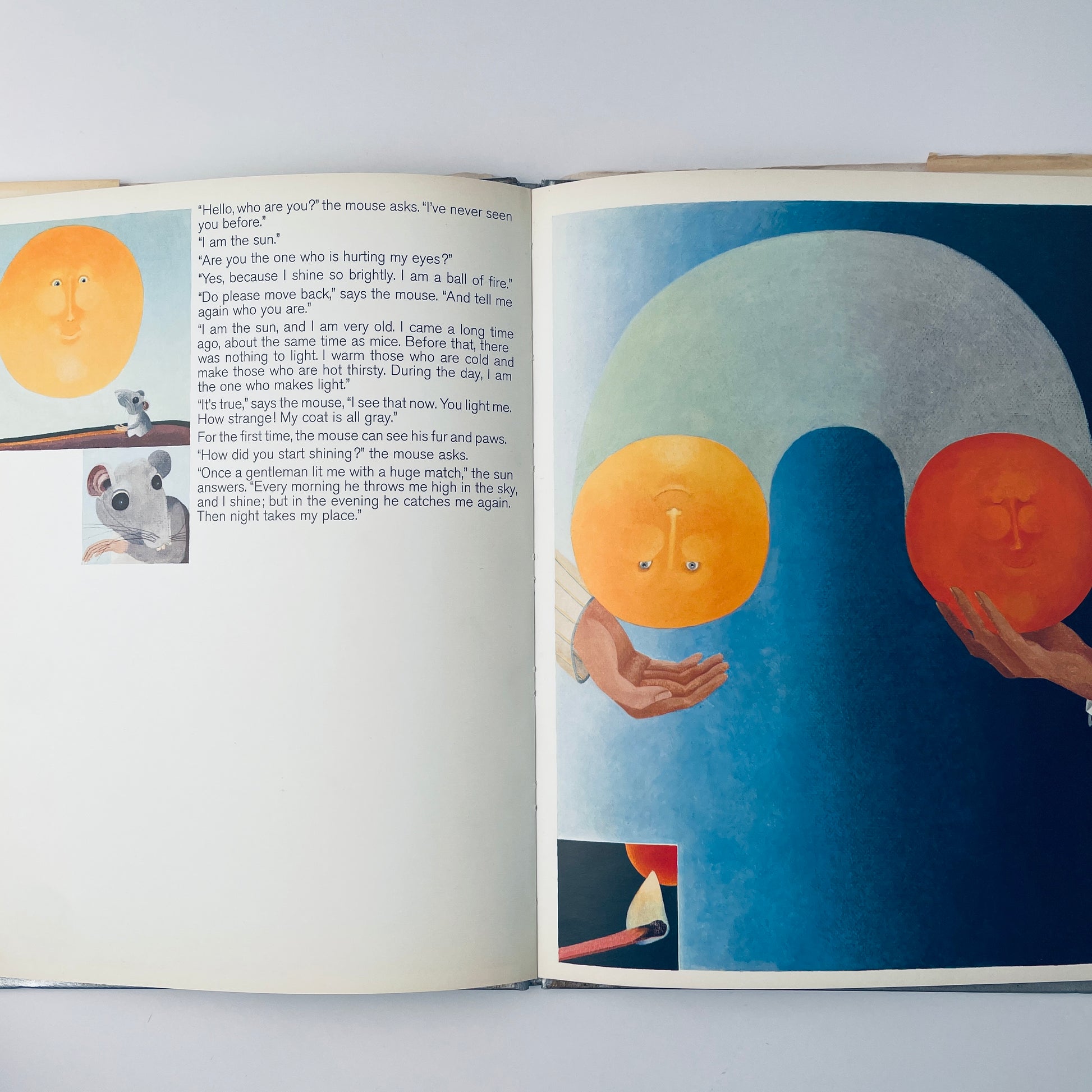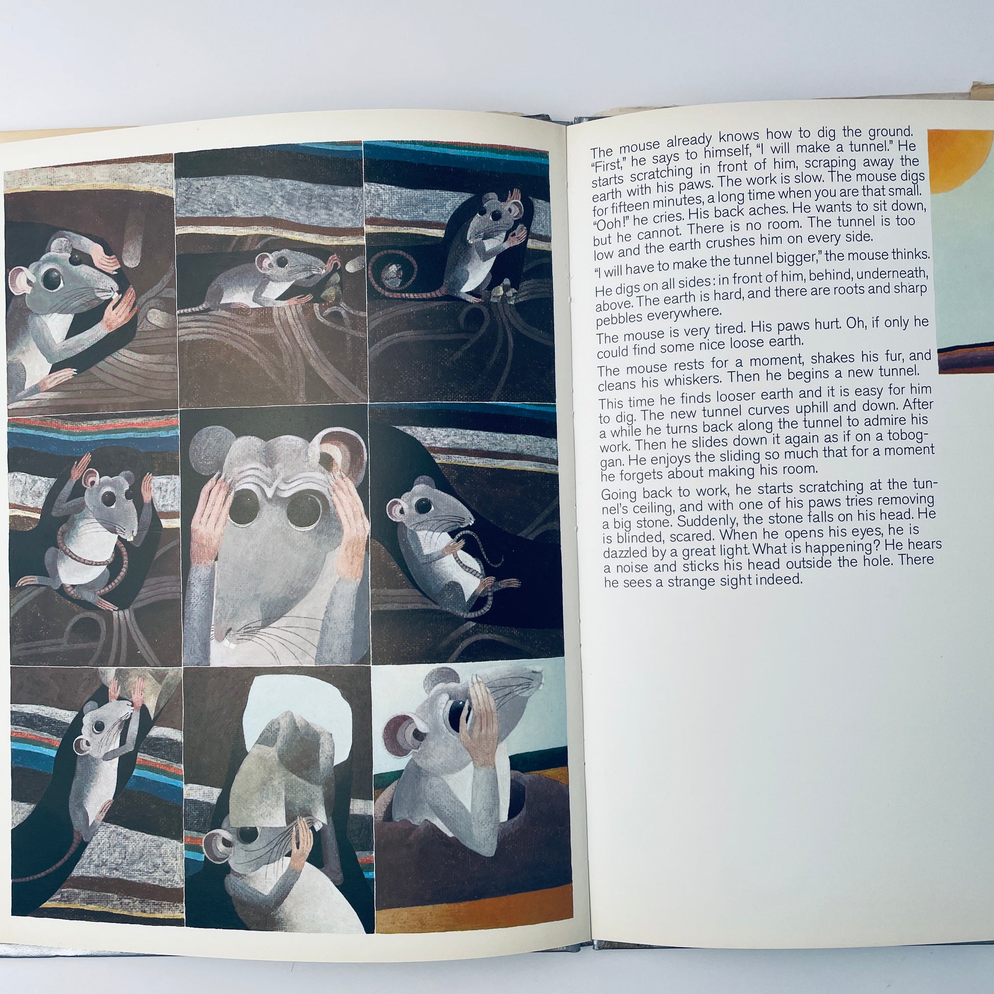 A young mouse unearths the sun, moon, and stars by digging through to the outside world, leading to new insights and a broader understanding of existence. The book explores themes of discovery, perception, and embracing new experiences through its surreal storytelling and striking illustrations, with a foreword by psychologist Jean Piaget.