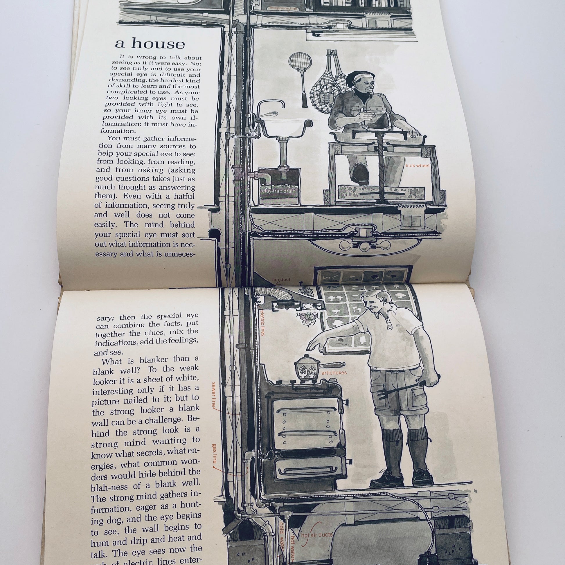 No leap is too mighty, no height too lofty, for the seven-league imagination of Jan Atkins. This master on insight now turns his magical gaze on the everyday world of pencils and pies, and finds a special way of looking at things. In delightfully detailed illustrations and text, he examines what such common and uncommon wonders as city streets, ocean liners, and ballpoint pens look like inside, beneath the surface.