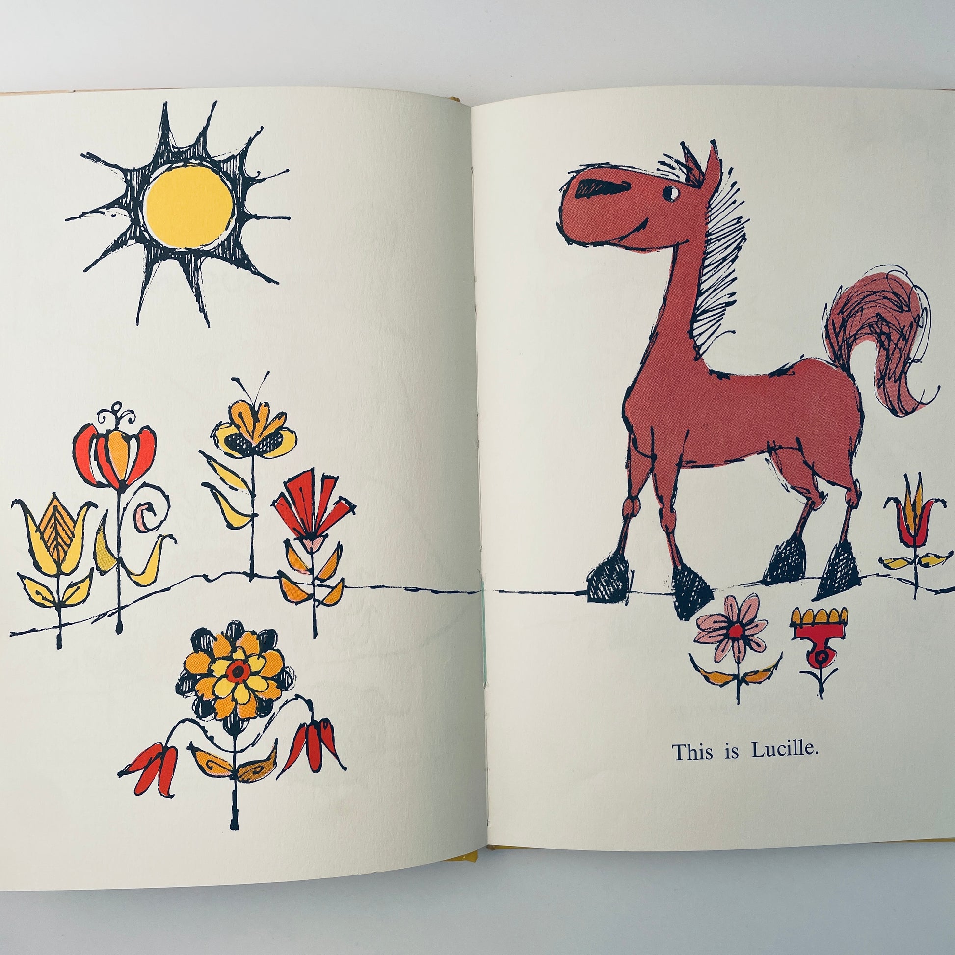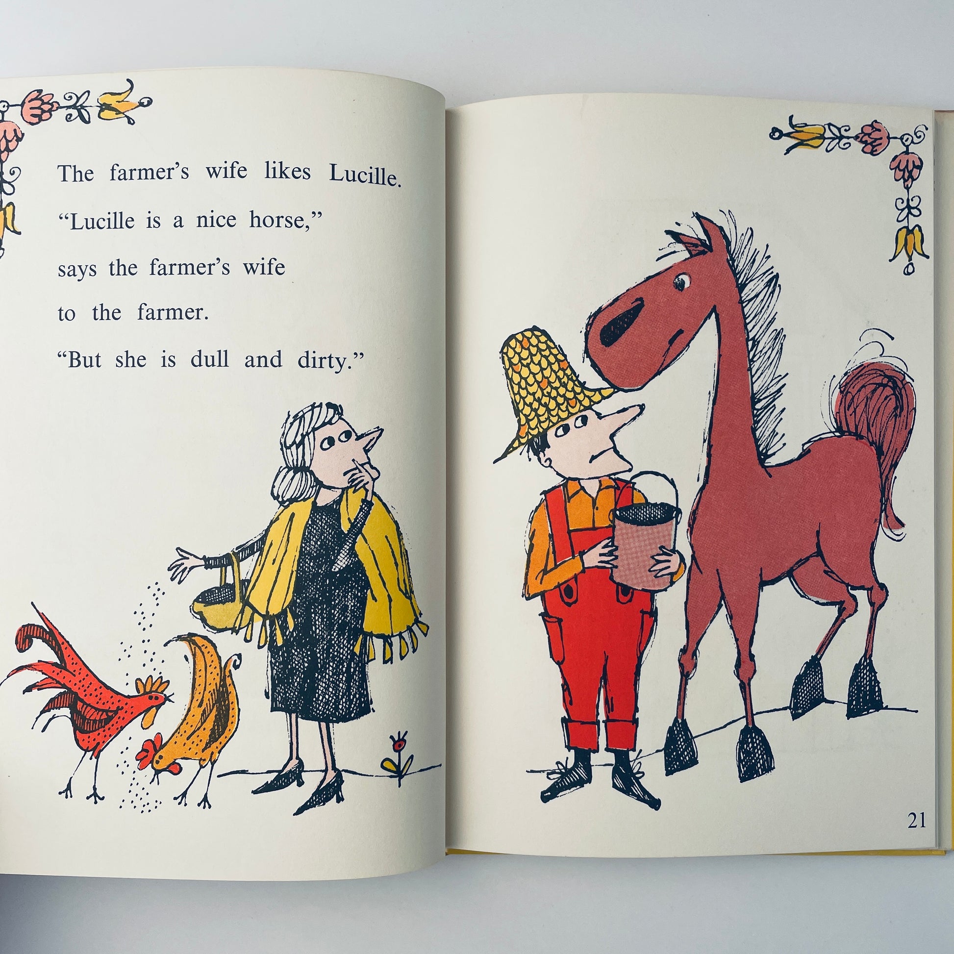 Lucille was a horse. She worked hard in the farmer's fields, pulling his plow. But every time she saw her reflection in a puddle, she was sad. "I am dull and dirty," she would say. And although the small pig assured her this was the proper way to be, Lucille was not consoled.