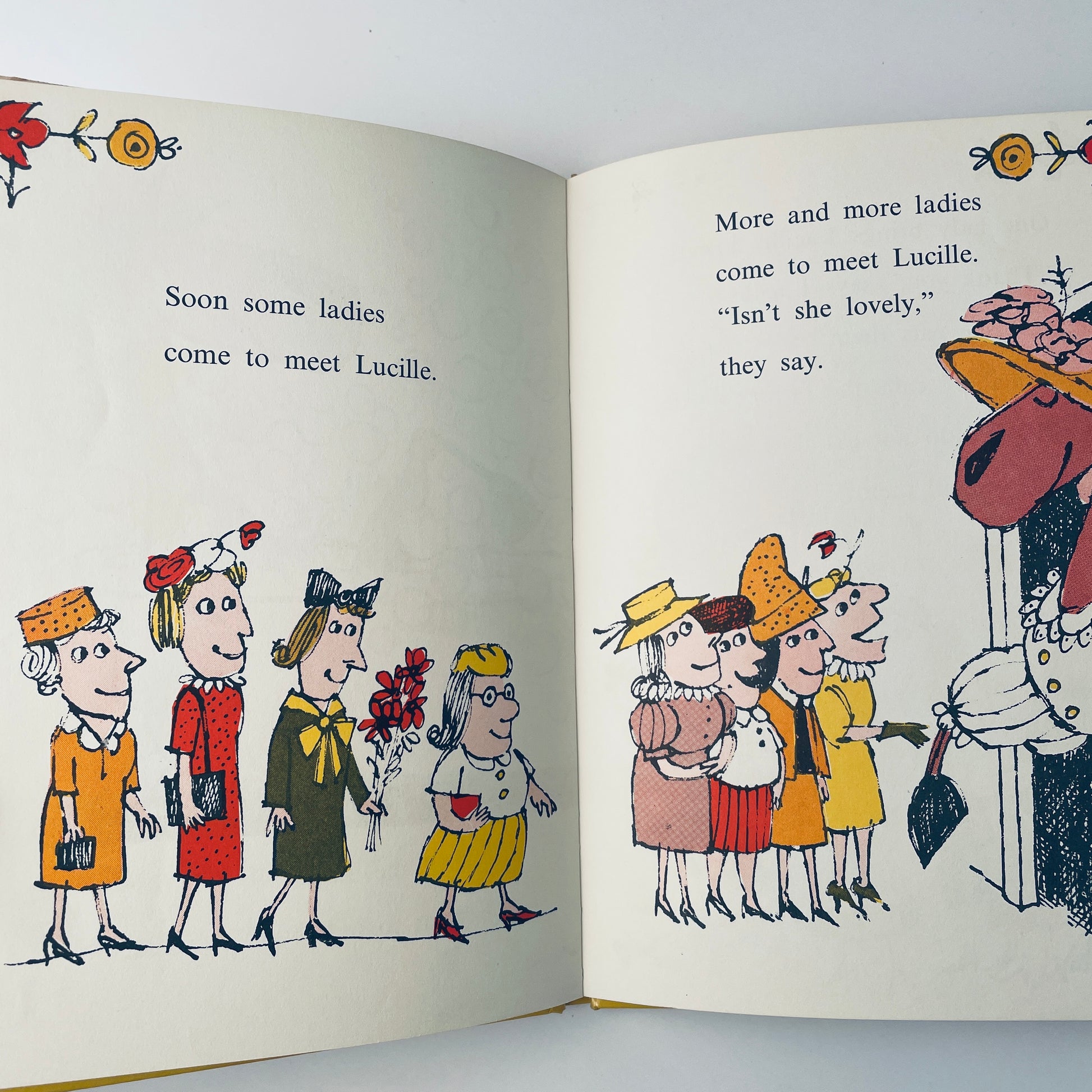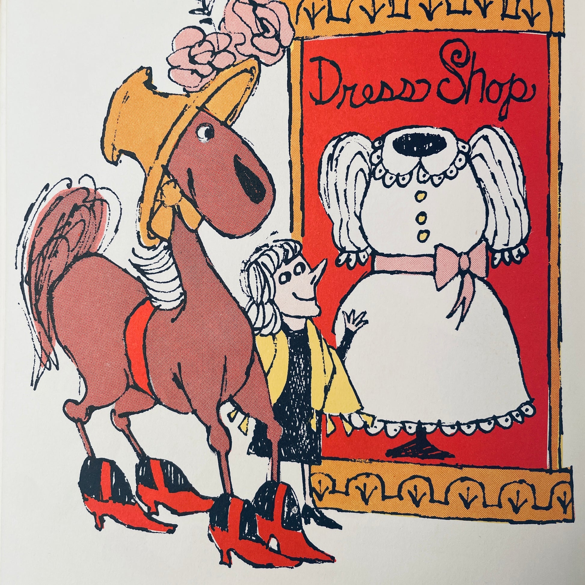 But the farmer's wife agreed with her. And after a shopping spree in town, Lucille wore a hat with a rose, four shiny shoes, and a beautiful white dress. She and the farmer's wife were delighted, but the farmer–and the small pig–were not. They much preferred Lucille-the-horse to Lucille-the-lady.