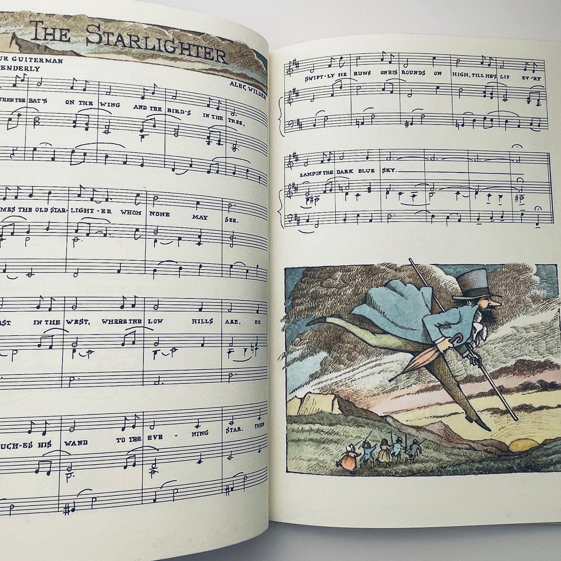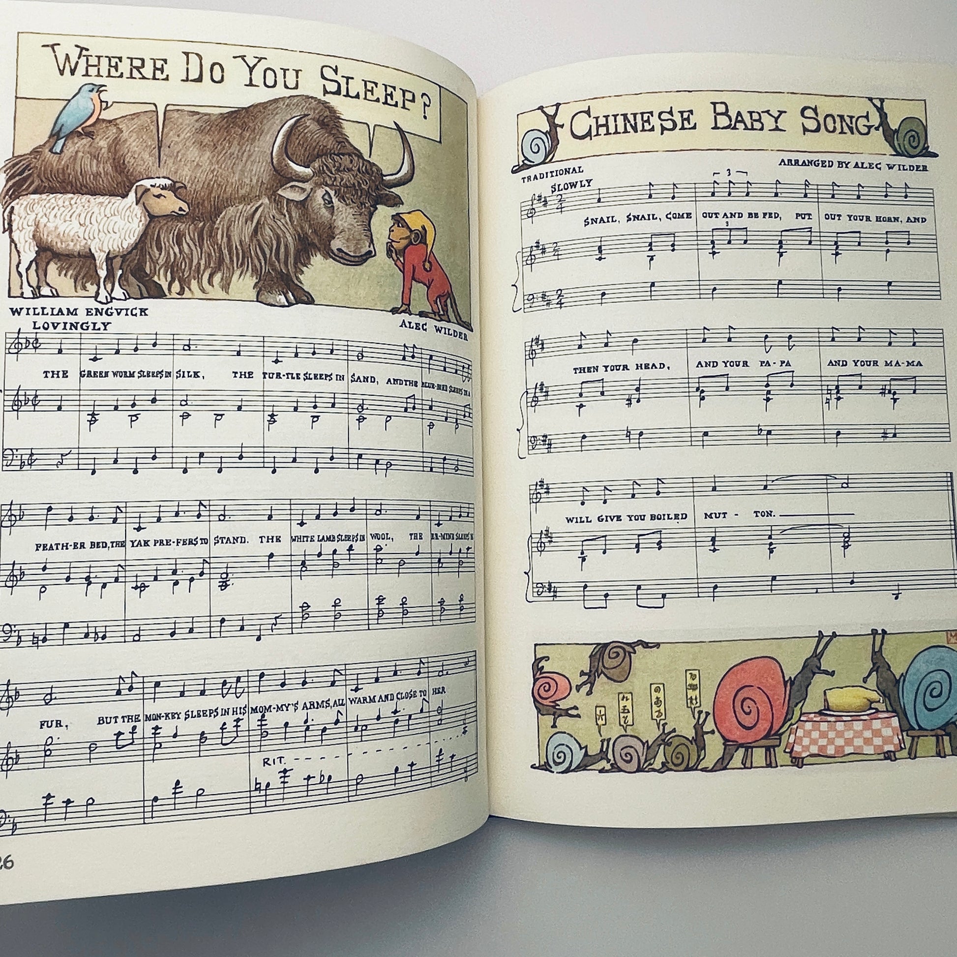 A glacne of the contents page tells everything that need be told about the freshness and originality of the selections. A moment at the piano is enough to confirm the sweetness of the songs and the simplicity of Mr. Wilder's arrangements. And on every page Maurice Sendak's shady pastures, his haunting scenes, his starry night skies, his ruddy-cheeked children and their pillow fights, carry us back to that enchanted land where all lullabies and night songs dwell.