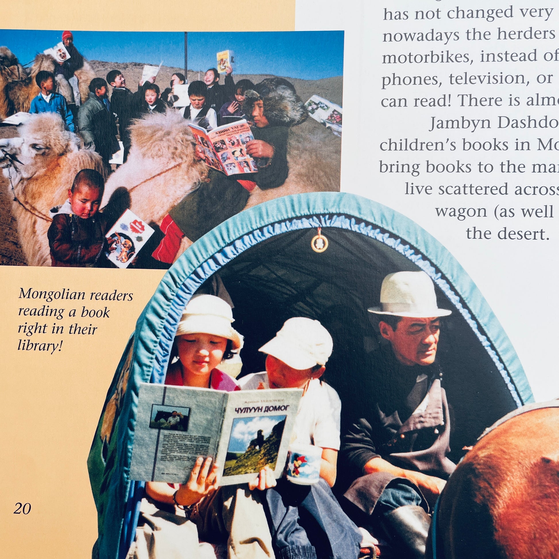 Do you get books from a public library in your town or even in your school library? In many remote areas of the world, there are no library buildings. In many countries, books are delivered in unusual way: by bus, boat, elephant, donkey, train, even by wheelbarrow. Why would librarians go to the trouble of packing books on the backs of elephants or driving miles to deliver books by bus? Because, as one librarian in Azerbaijan says, "Books are as important to us as air or water!" This is the intriguing photo essay, a celebration of books, readers, and libraries.