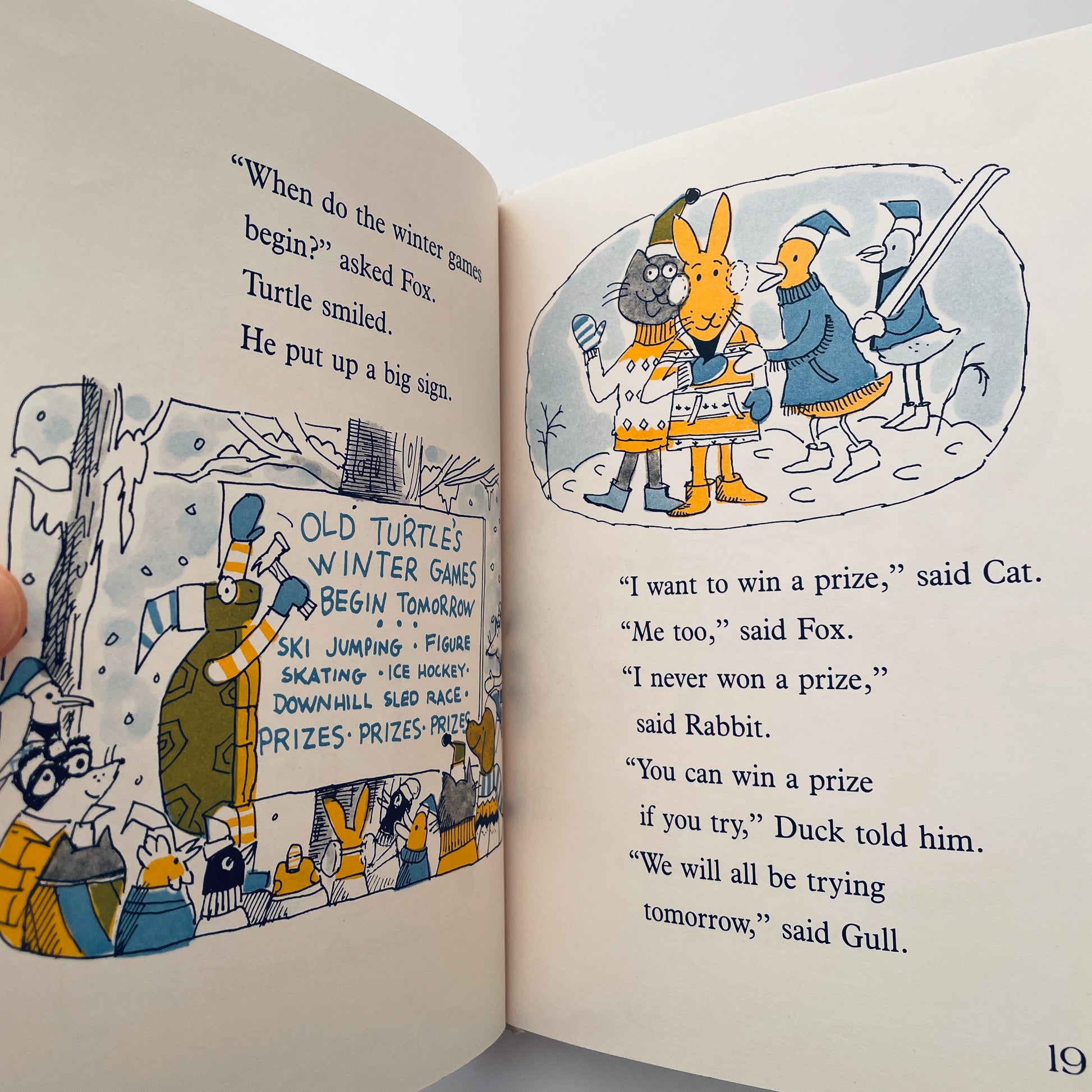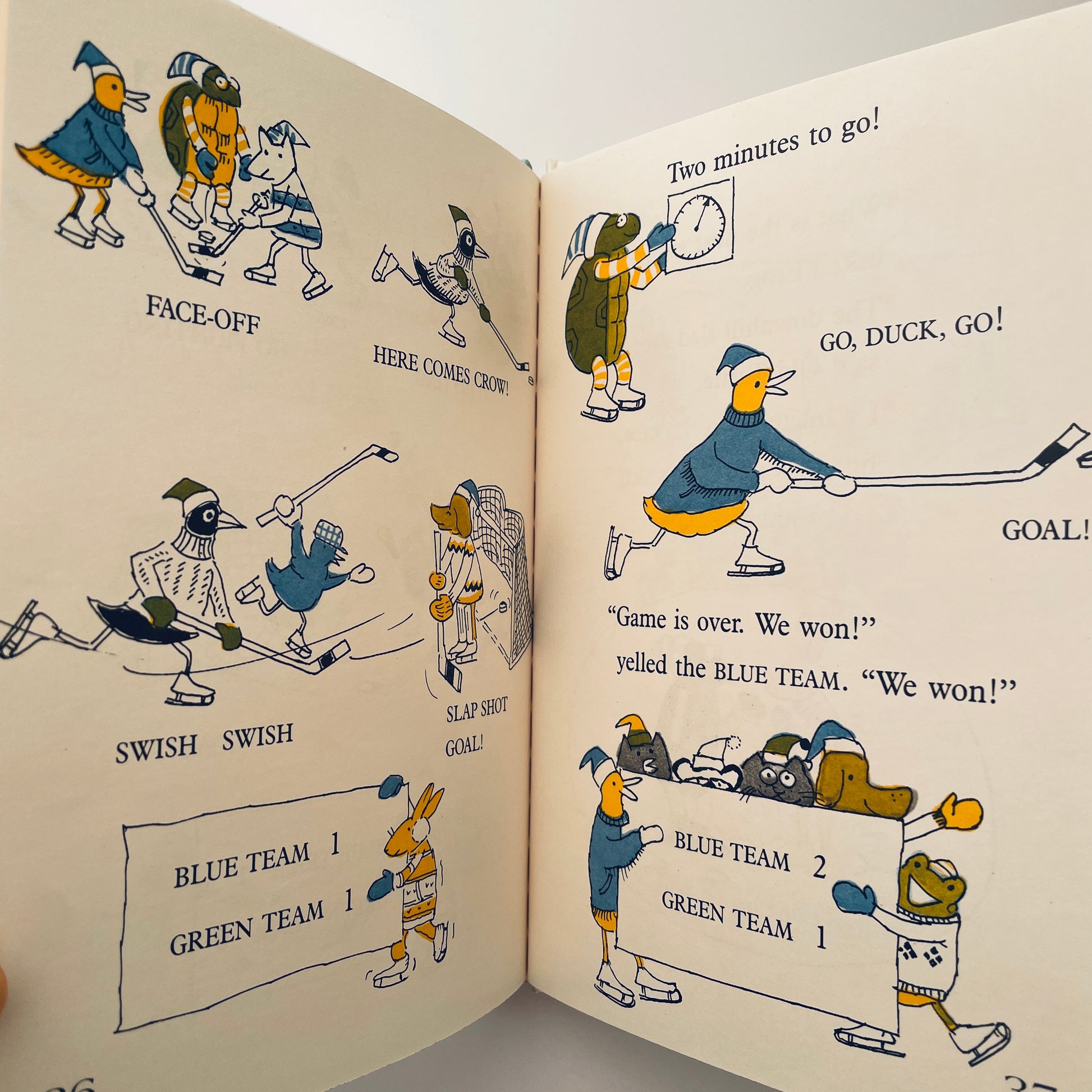 A group of animals organizes winter games, and compete in events such as sled races, skating, skiing, and ice hockey.