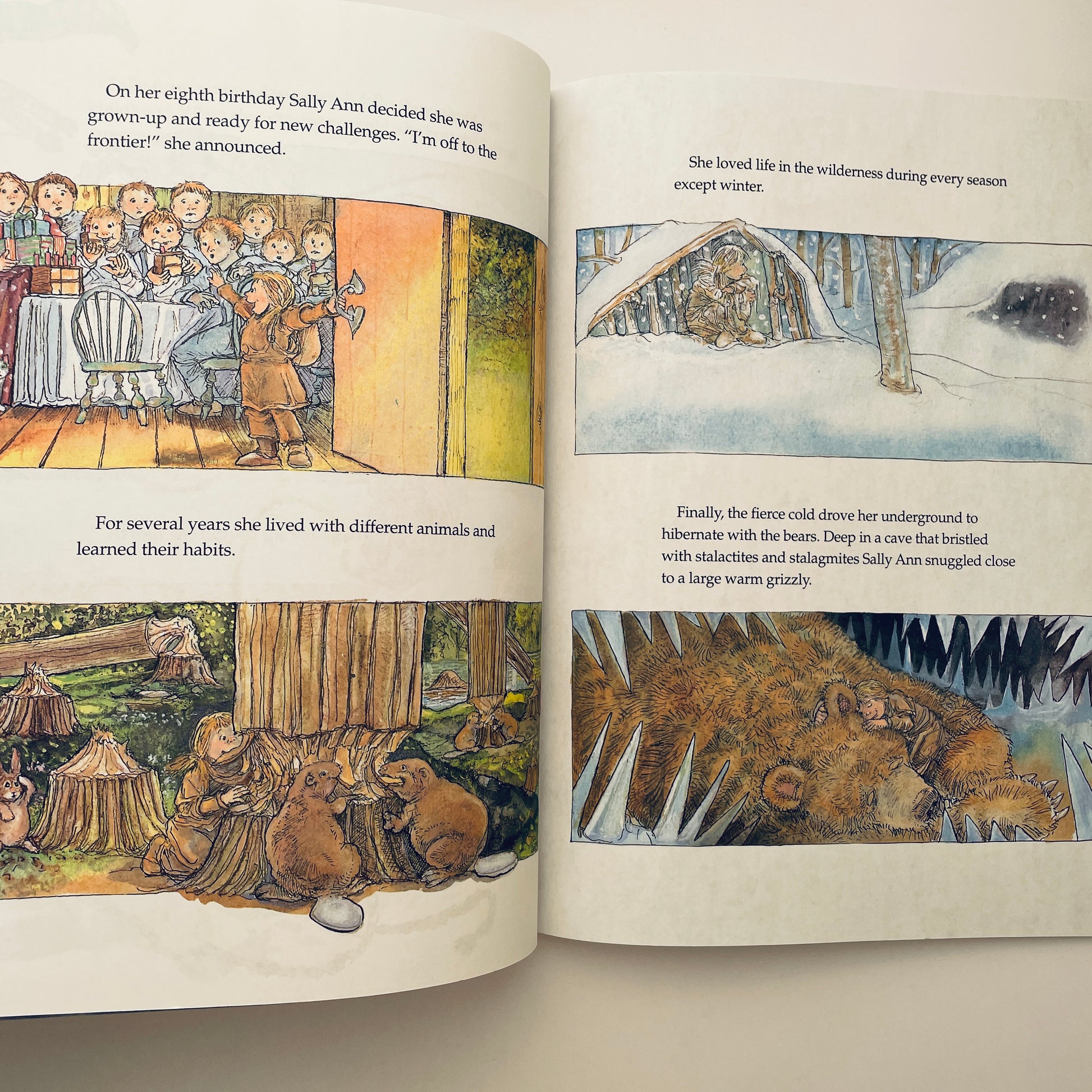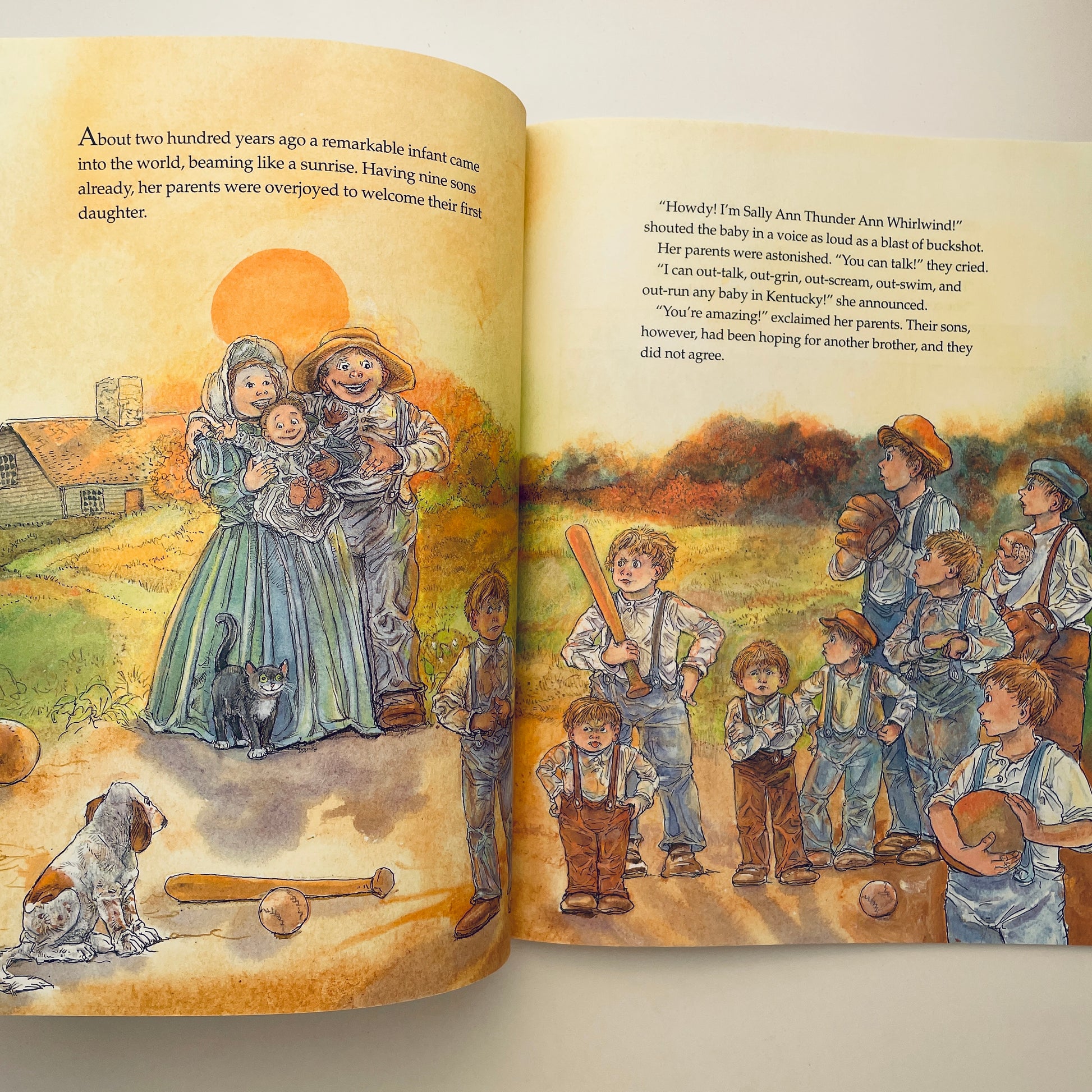 On the day she is born this amazing baby proudly announces she can out-talk, out-grin, out-scream, out-swim, and out-run any baby in Kentucky. Within a few years Sally is off to the frontier, where she stuns a hungry grizzly bear, makes a lasso out of six rattlesnakes, and is more than a match for the mighty Mike Fink. And when Sally Ann rescues Davy Crockett from a pair of ferocious eagles, even her hornet's-nest bonnet and skunk perfume don't stop him from proposing marriage. You won't find Sally Ann in any history book, but that hasn't kept her from becoming an authentic American frontier legend and the unforgettable heroine of Steven Kellogg's most delightfully rip-roaring tall tale.