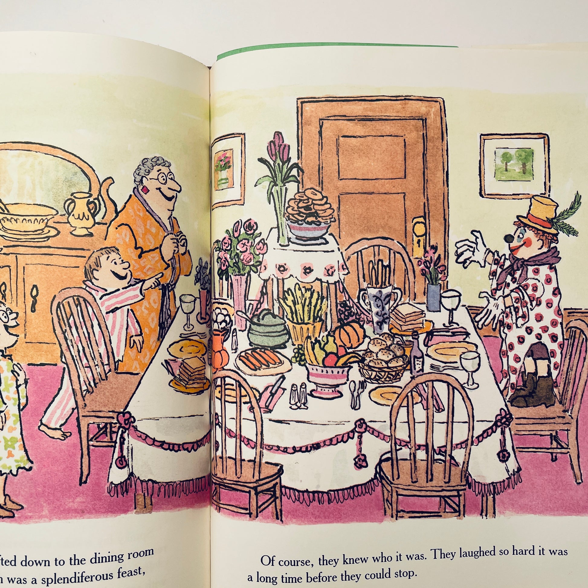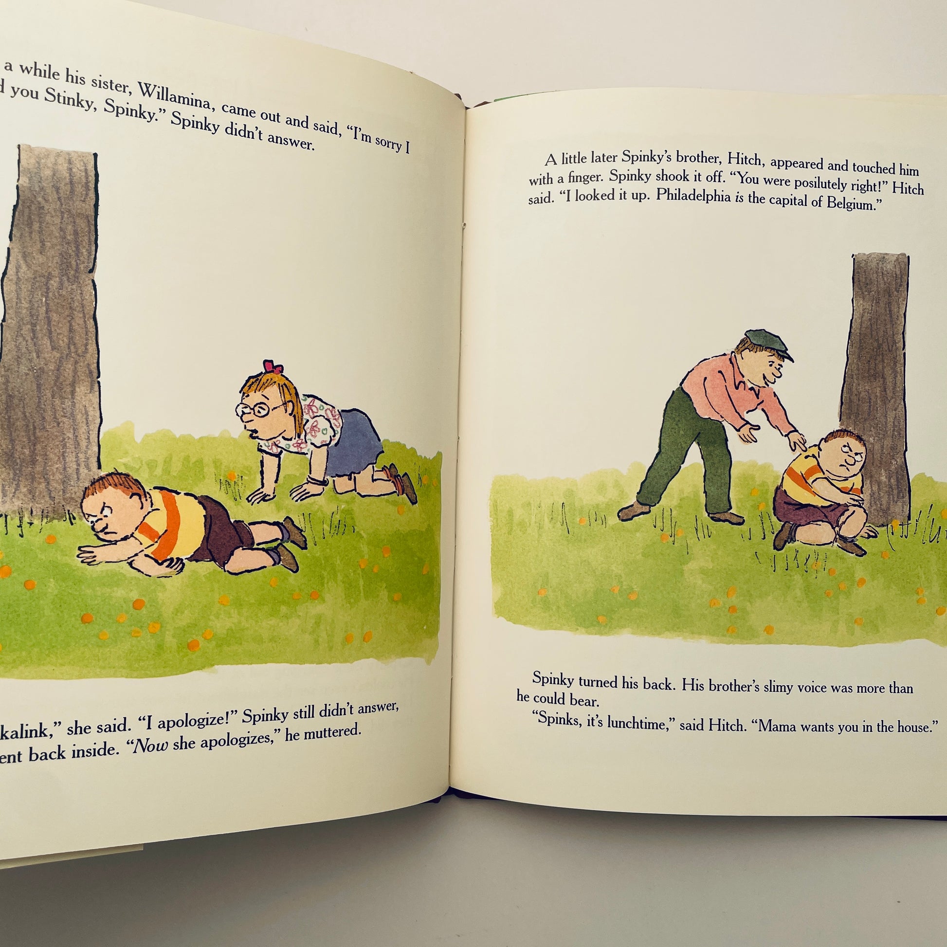 Spinky's awful family! They don't love him, they don't understand him, and nothing any of them can say or do will convince him otherwise. Not his mother's kisses and crullers, not his father's reasonable lecture, not the visits of sister, brother, grandma, and friends. "The world was against him, so he was against the world, and that included all living things–except, of course, animals." What can Spinky possibly do but lie in his hammock "like a pile of laundry," with a blinding case of the sulks? And what can his loving, patient family so to help him out of it?