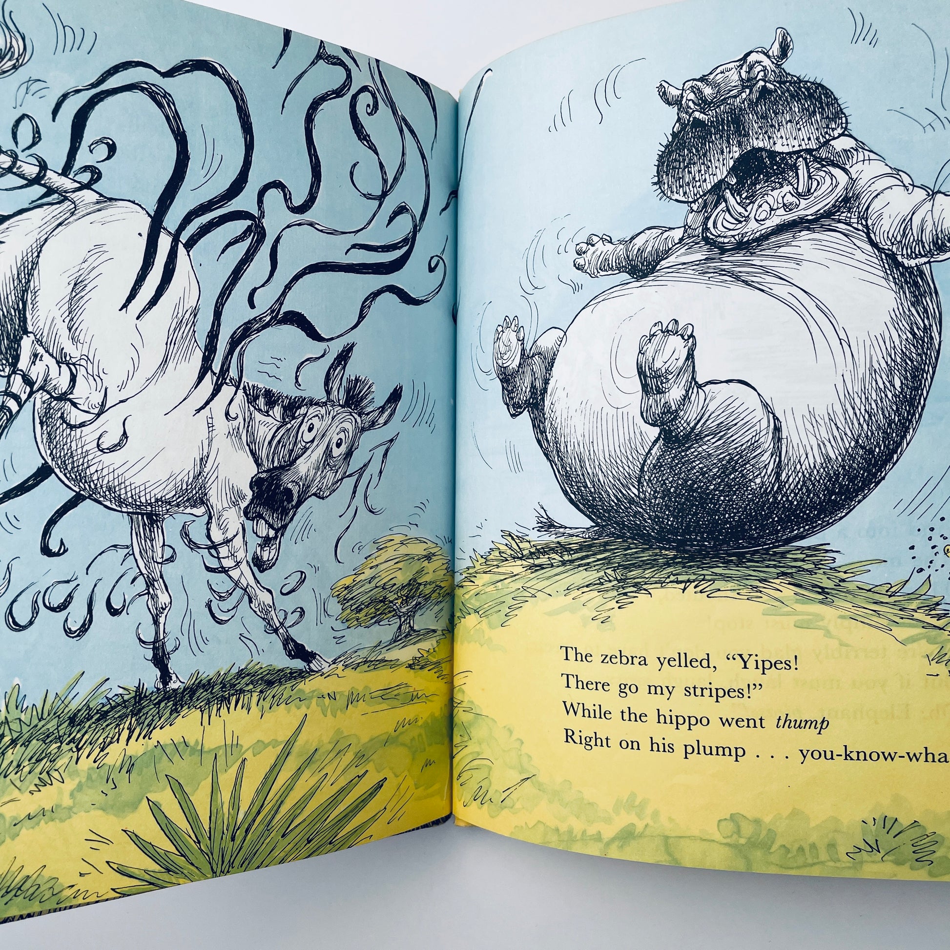 All the animals are in a panic. The elephant's sneeze would blow the monkeys out of the trees, the feathers off the birds, the stripes off the zebra! Even the fish and the fly, the crocodile and the kangaroo know what a catastrophe that sneeze would be. "Please don't sneeze!" they beg....
