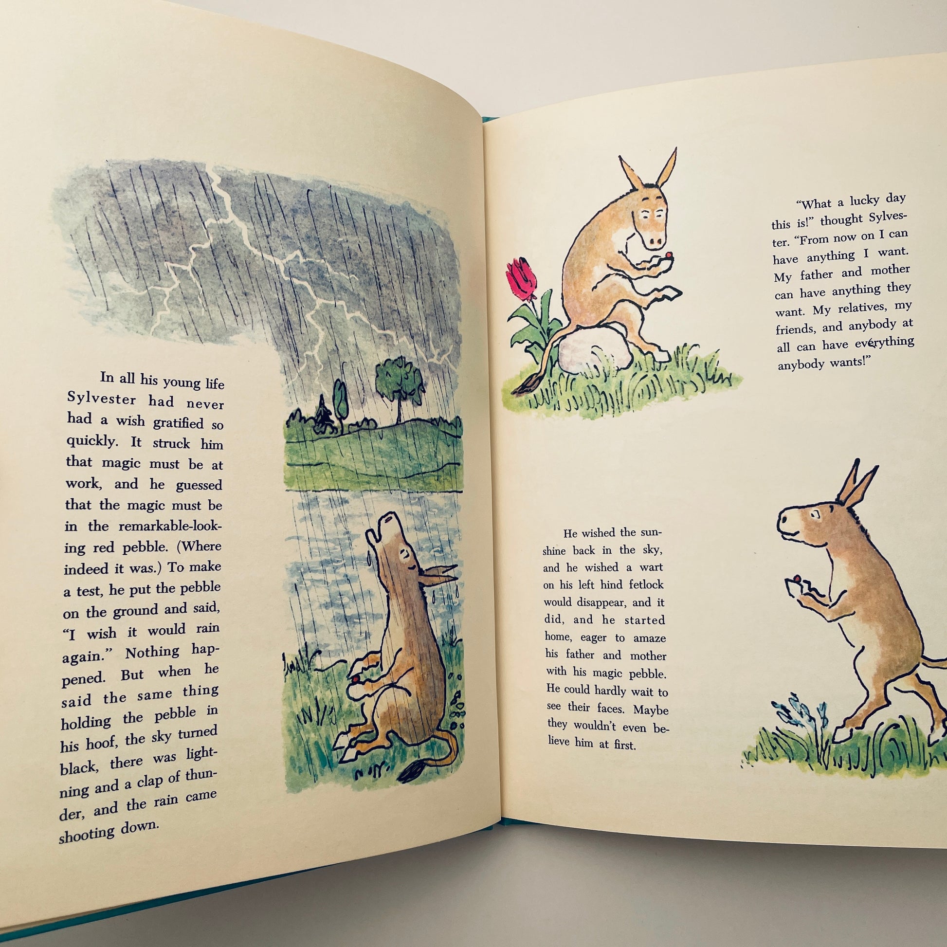 One rainy day, Sylvester finds a magic pebble that can make wishes come true. But when a lion frightens him on his way home, Sylvester makes a wish that brings unexpected results. How Sylvester is eventually reunited with his loving family and restored to his own donkey self makes a story that is beautifully tender and perfectly joyful.