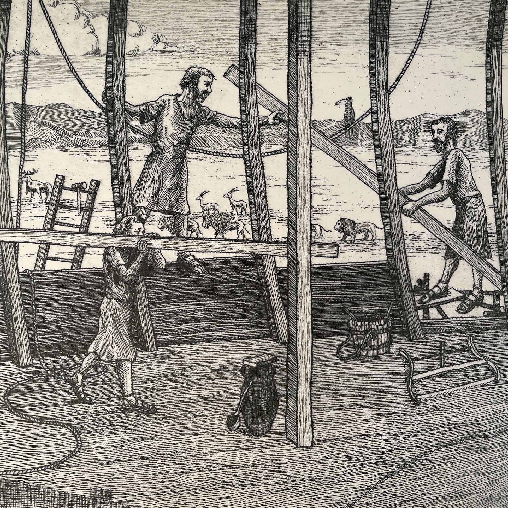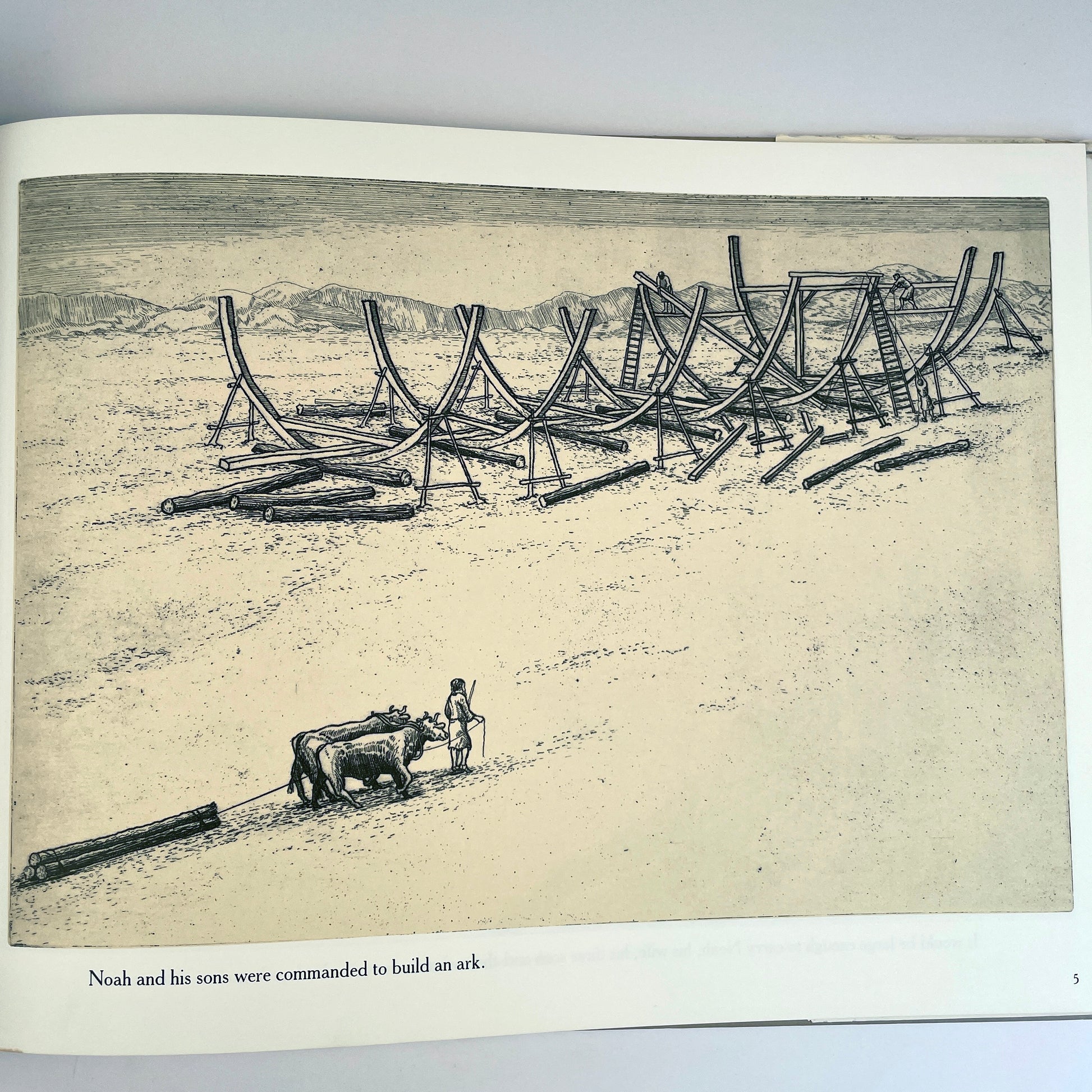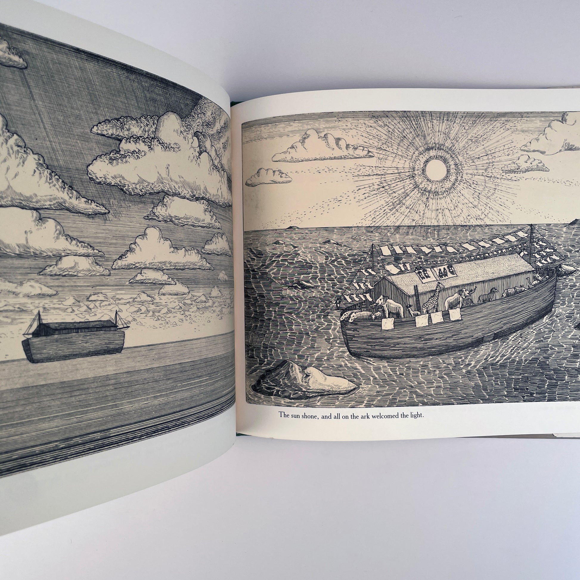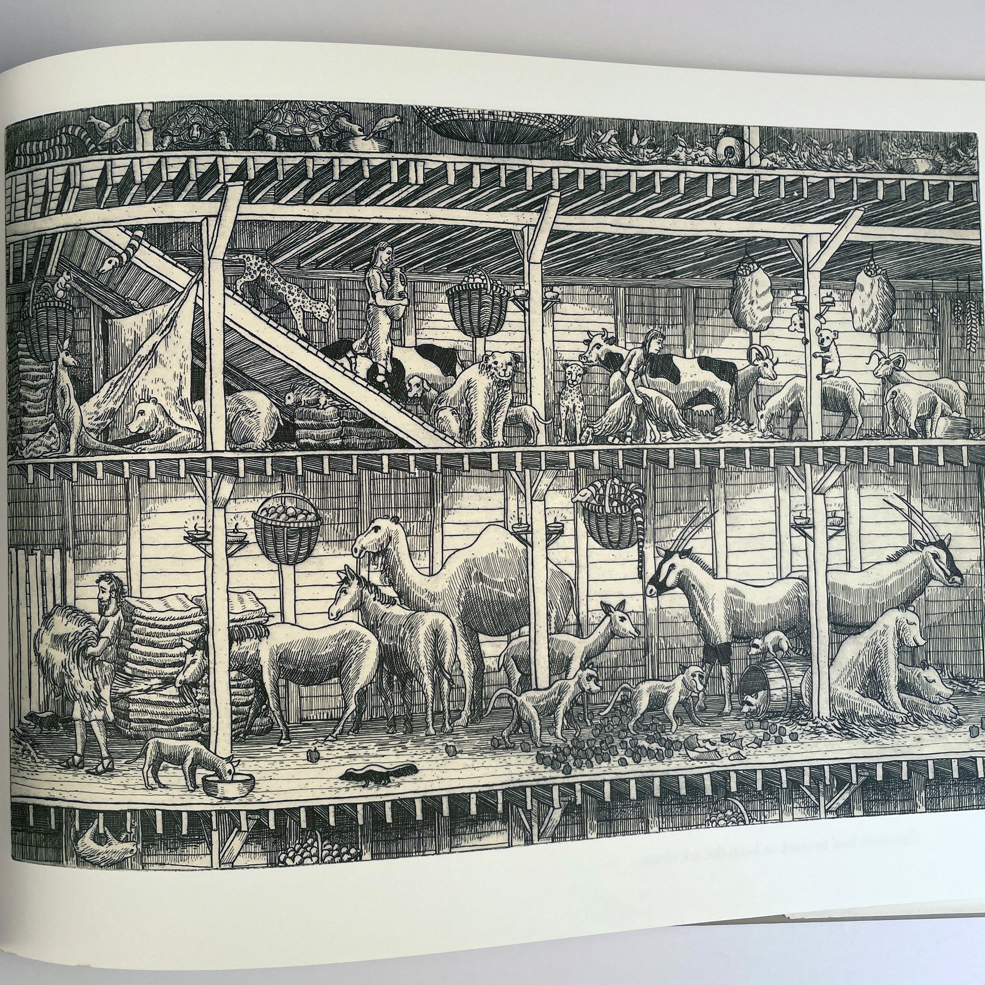 If Noah had been an artist, he might have left us these plans for the building of the ark. With panoramic elevations and gloriously detailed cross sections, we can see how every arrangement is made for the accommodation of the pairs of animals. As the sky darkens and the rains fall, Noah and his family are busied with the care and feeding of all their passengers.