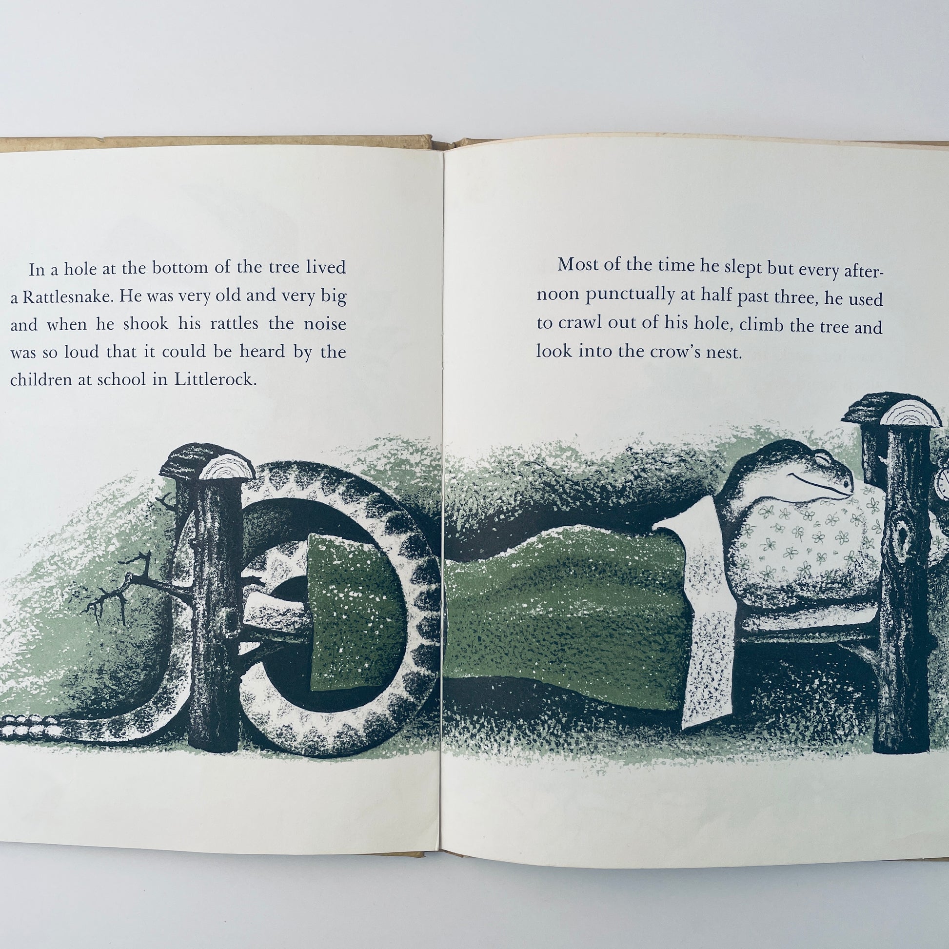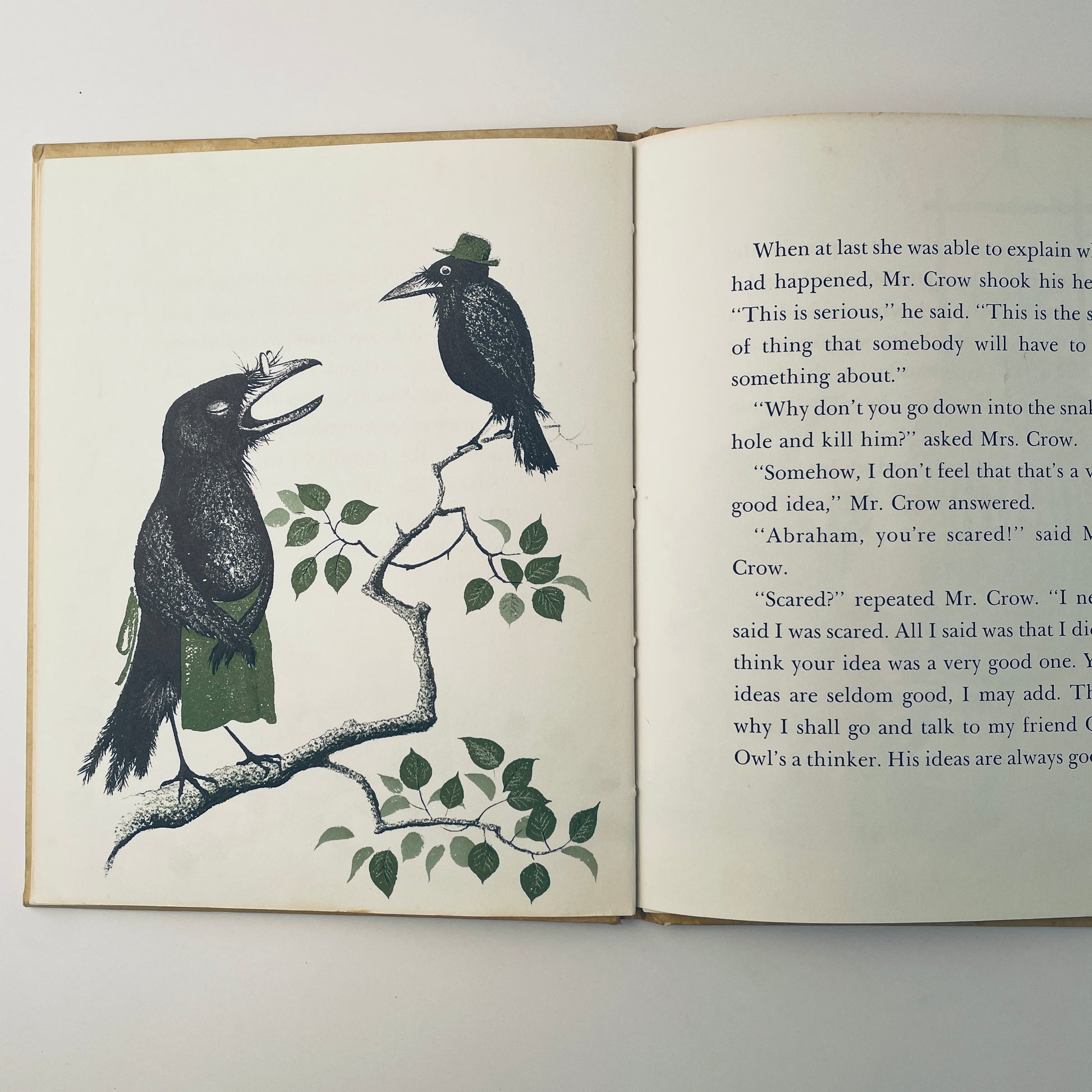This story, written Christmas of 1944, tells the story of Mr. and Mrs. Crow, who live in a cotton-wood tree at Pearblossom. Due to the Rattlesnake living at the bottom of the tree, Mrs. Crow's eggs are never able to hatch. After catching the snake eating her 297th egg that year (she does not work on Sundays), Mrs. Crow requests that Mr. Crow go into the hole and kill the snake. Thinking better of it, Mr. Crow confers with his wise friend, Mr. Owl. Mr. Owl bakes mud into two stone eggs and paints them to resemble Mrs. Crow's eggs. These dummy eggs are left in the nest to trick the Rattlesnake, who unknowingly eats them the next day. When the eggs get to his stomach, they cause the Rattlesnake such pain, that he thrashes about, tying himself in knots around the branches. Mrs. Crow goes on to hatch "four families of seventeen children each" and "uses the snake as a clothesline on which to hang the little crows' diapers".