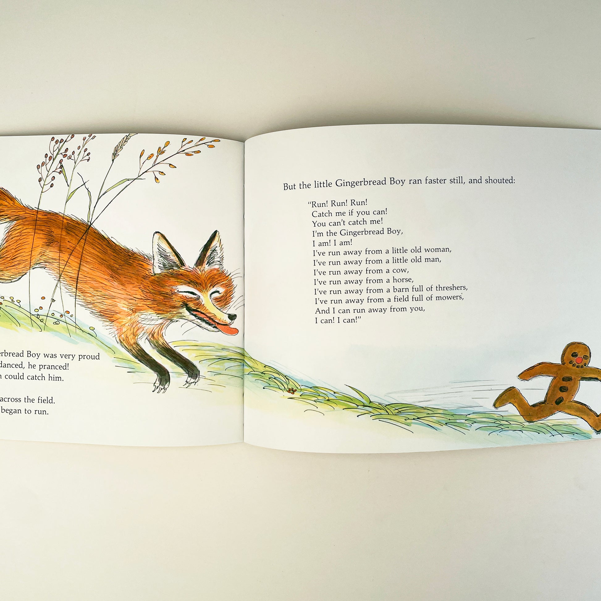 Run! Run! Run! Catch me if you can! See if you can keep up with the Gingerbread Boy as he outruns a little old woman, a cow, and even a field full of mowers. Then watch what happens when he meets up with a clever, and very hungry, fox!