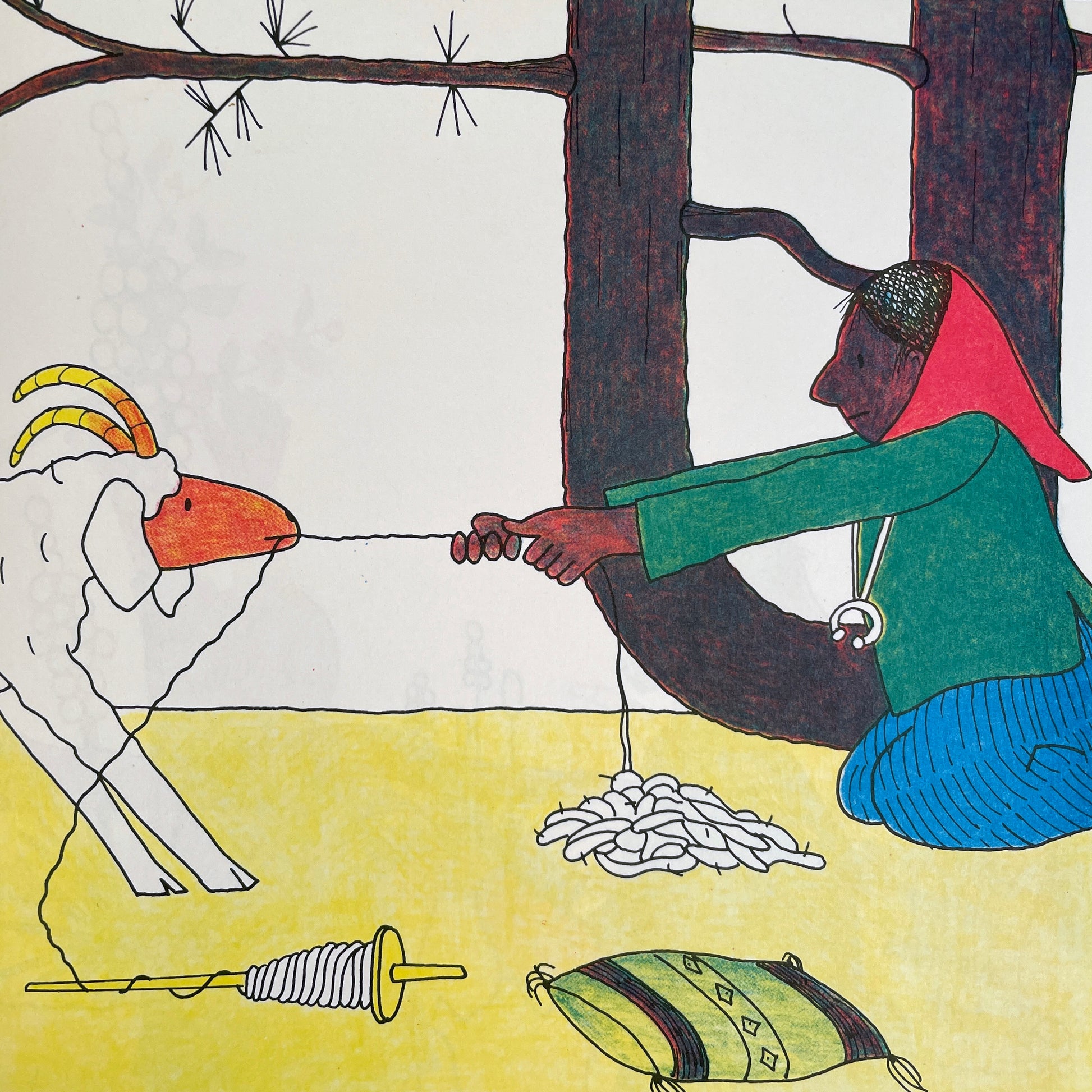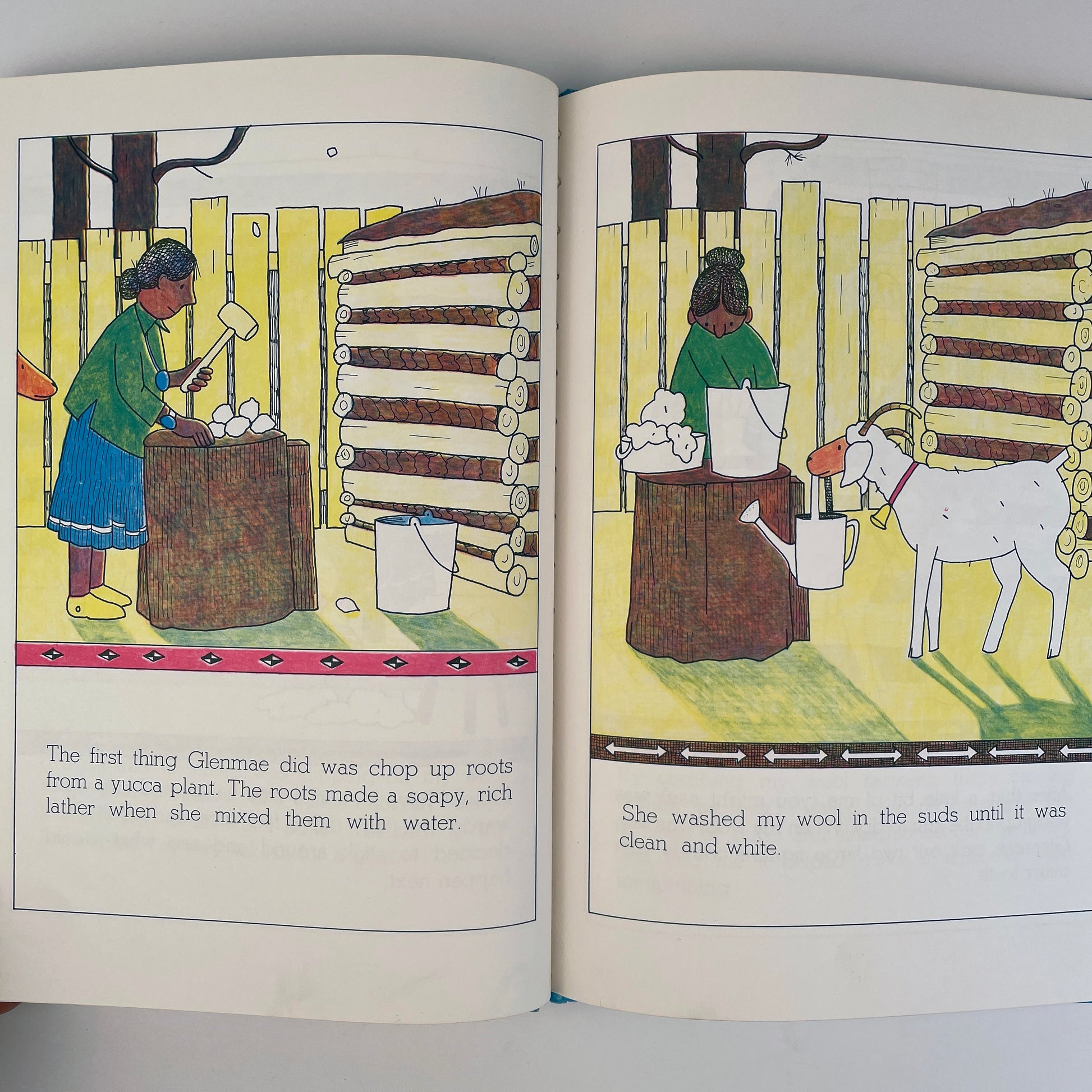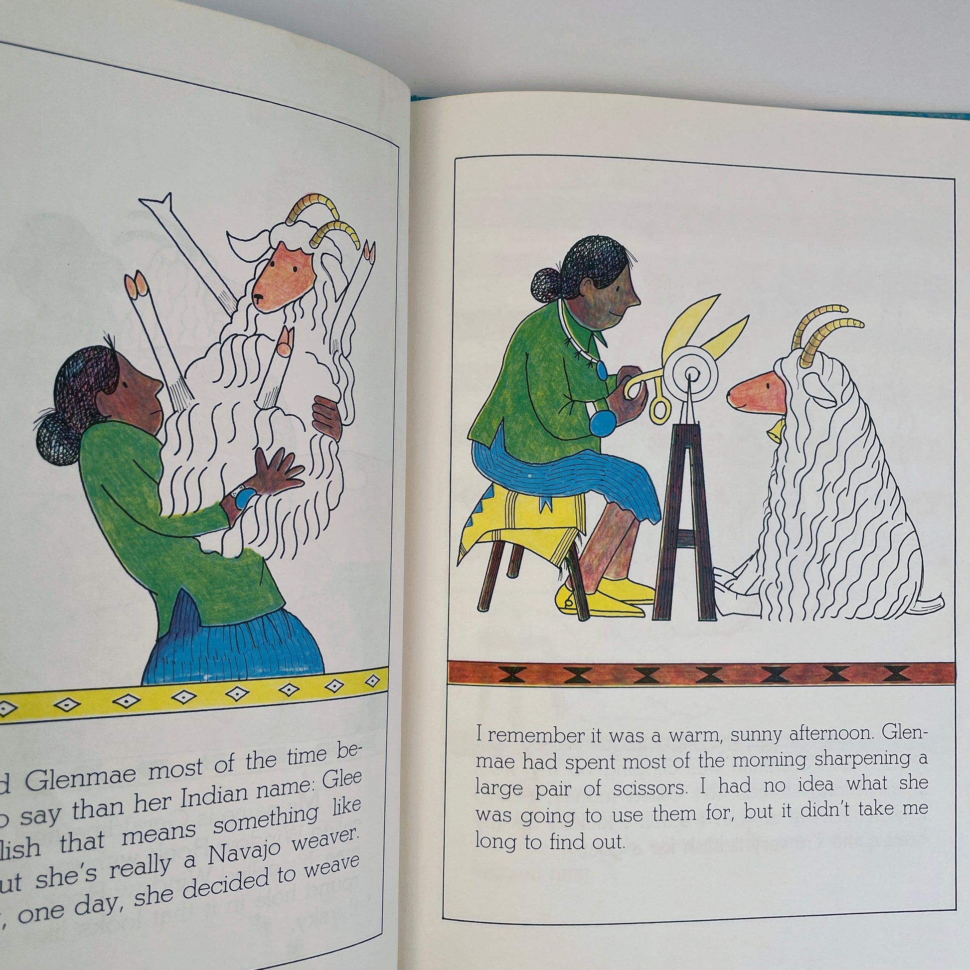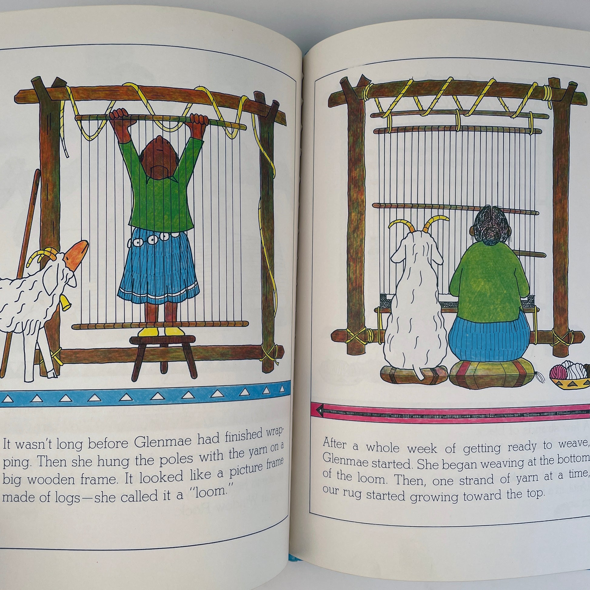 Geraldine is a goat, and Glenmae, a Navajo weaver. One day, Glenmae decides to weave Geraldine into a rug. First Geraldine is clipped. Then her wool is spun into fine, strong yarn. Finally, Glenmae weaves the wool on her loom. They reader learns, along with Geraldine, about the care and pride involved in the weaving of a Navajo rug–and about cooperation between friends.