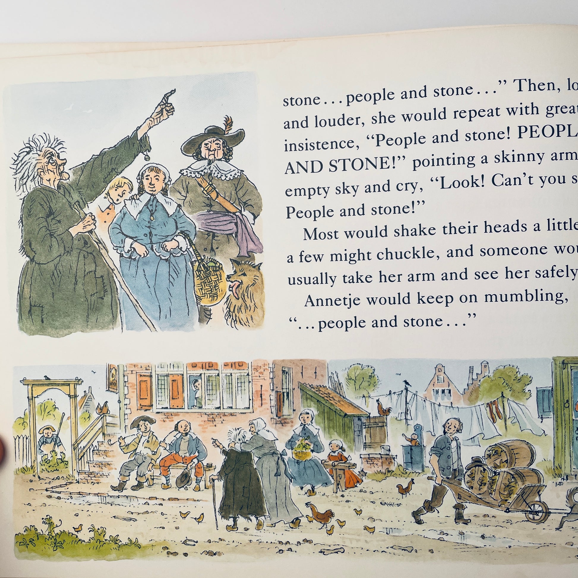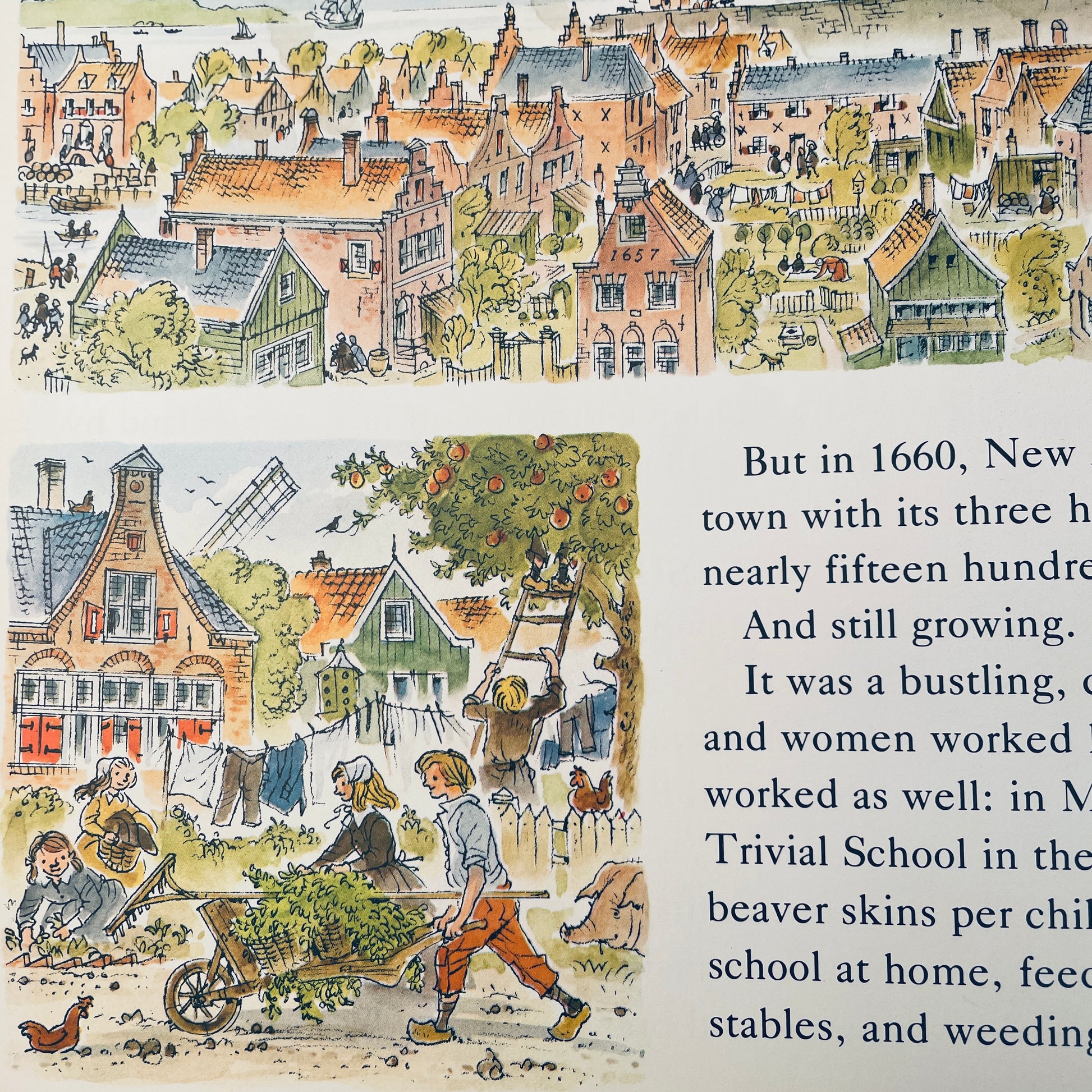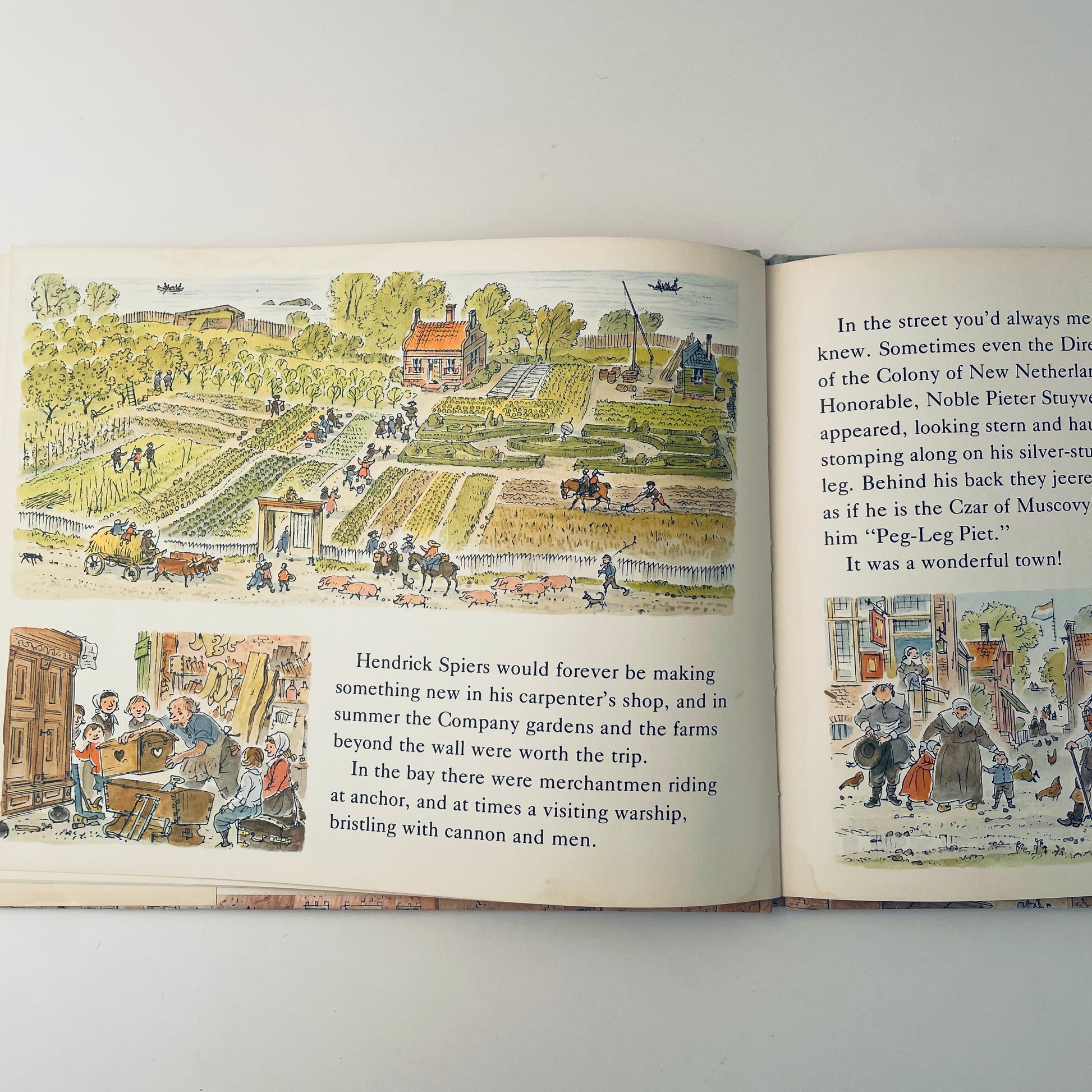 Now Caldecott-winner Peter Spier brings this thriving little metropolis alive for young readers. He takes them through the bustling streets, pointing out the schoolhouse and the market place, the shipyards and the sawmill. He introduces them to the local residents–the glass blower, the smithy, the carpenter, the miller. And he tells them the legend of Crazy Annie Bogardus, a lonely old woman with an uncanny vision of things to come. A charming and colorfully detailed portrait of city life on Manhattan island over 300 years ago.