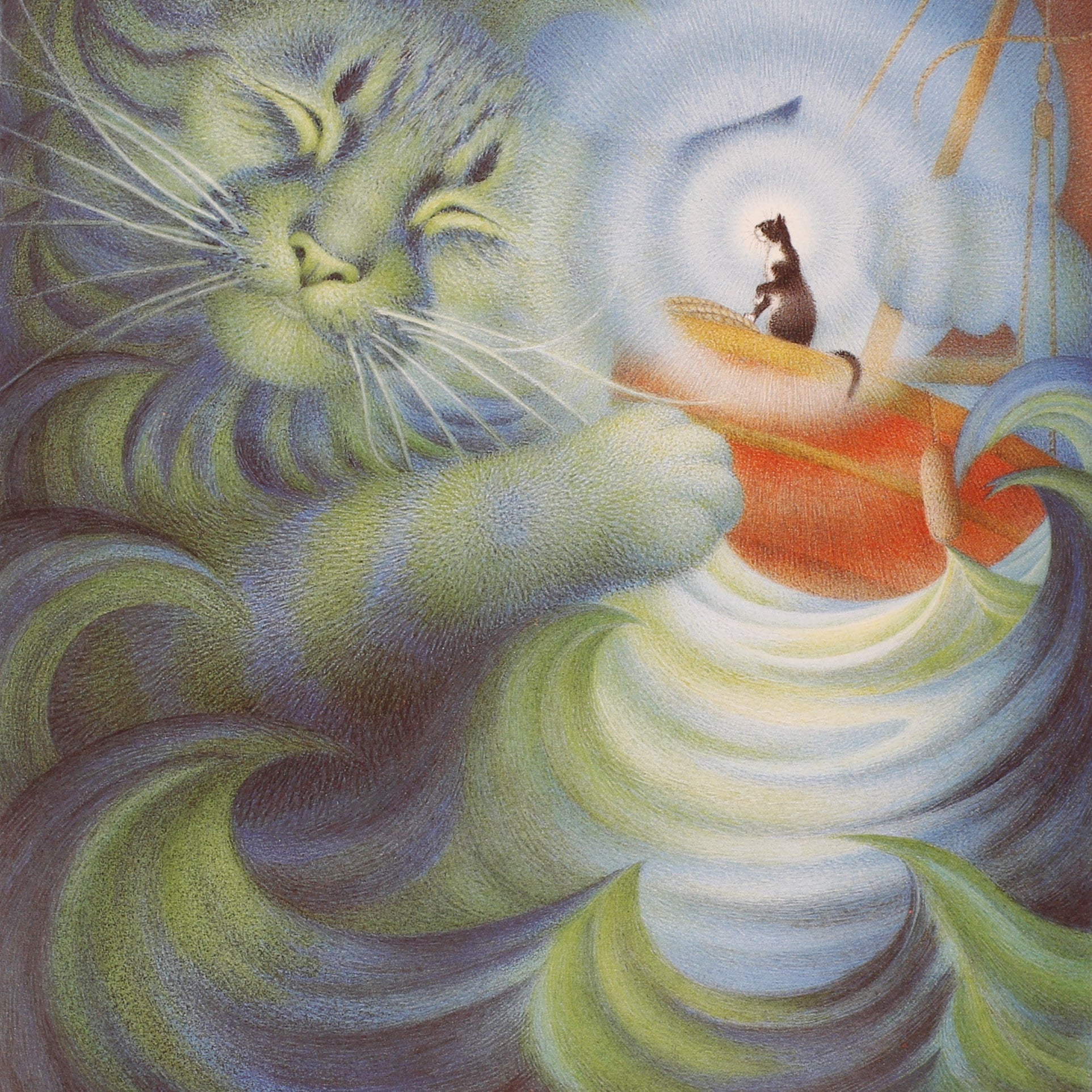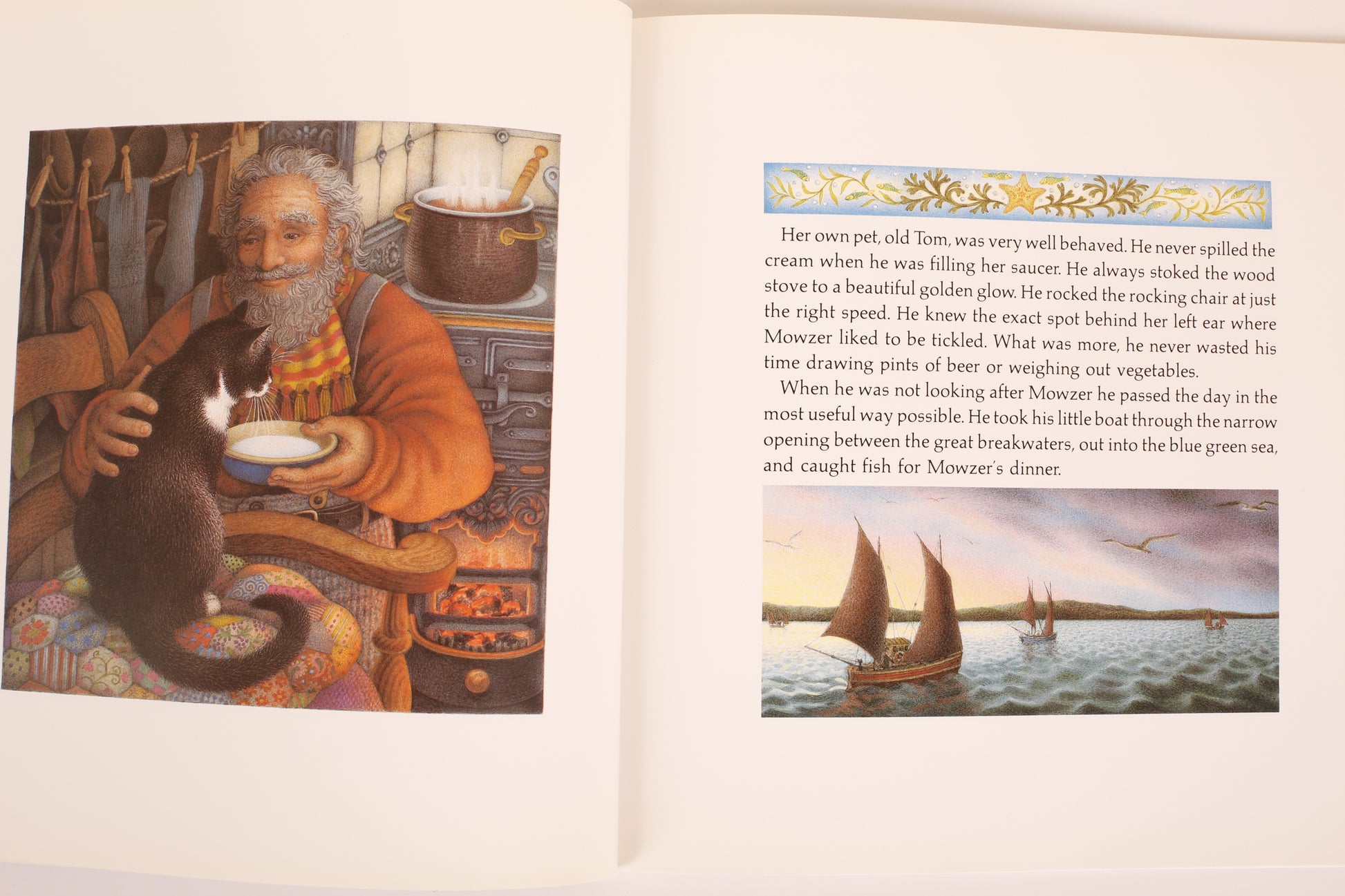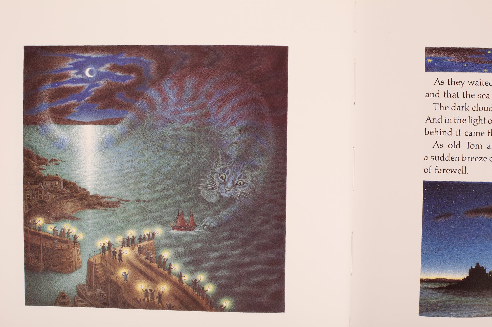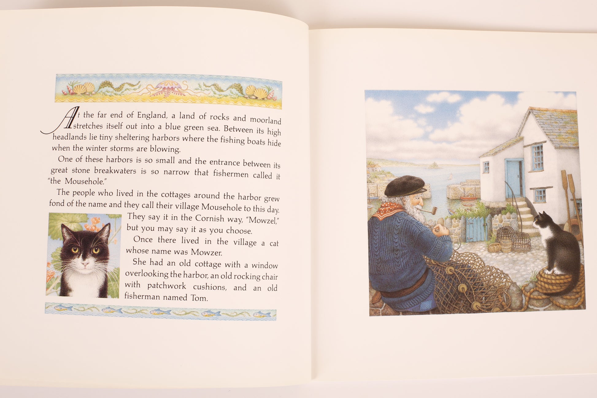 At the far end of England, in the tiny Cornish village of Mousehole, a cat called Mowzer once lived with an old fisherman named Tom. The two led a very pleasant life together, dining every day on mouth-watering meals of fresh fish Tom had caught. But one terrible winter, the Great Storm-Cat came to prowl outside the harbor, snarling and whipping up giant waves, and none of the fishing boats could go out to sea. With Christmas coming, Tom bravely volunteered to risk his life so the children of Mousehole would not go hungry. But Mowzer knew only another cat had the power to soothe the anger of the Great Storm-Cat and bring food to the people of Mousehole at Christmastime.