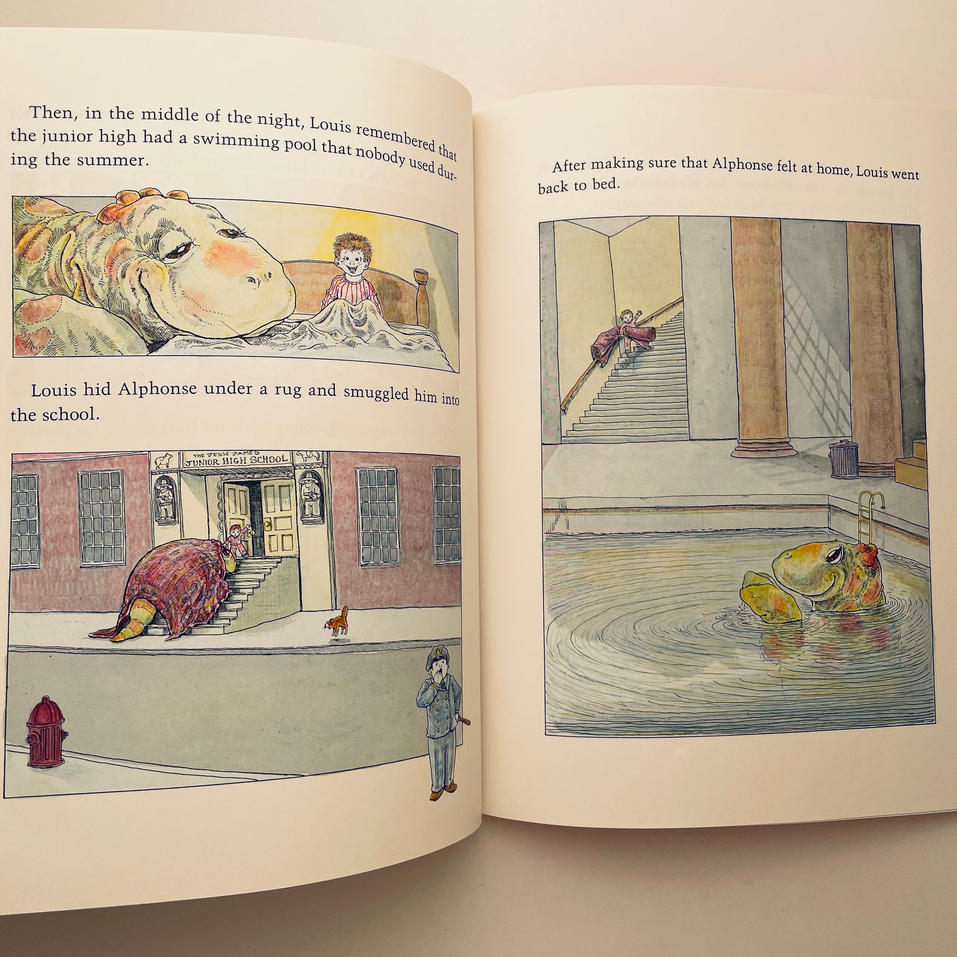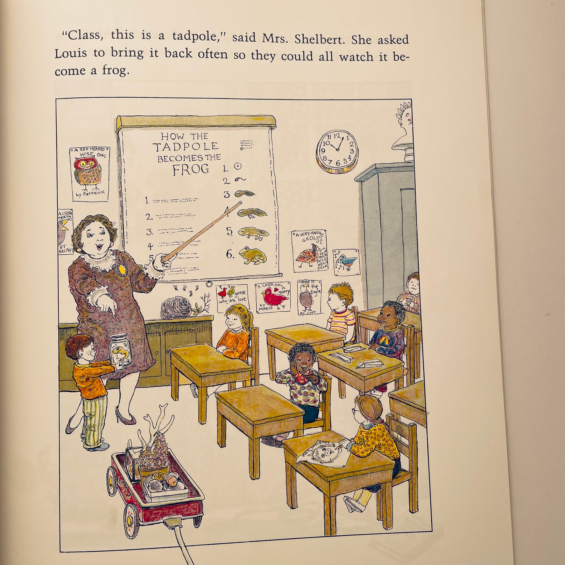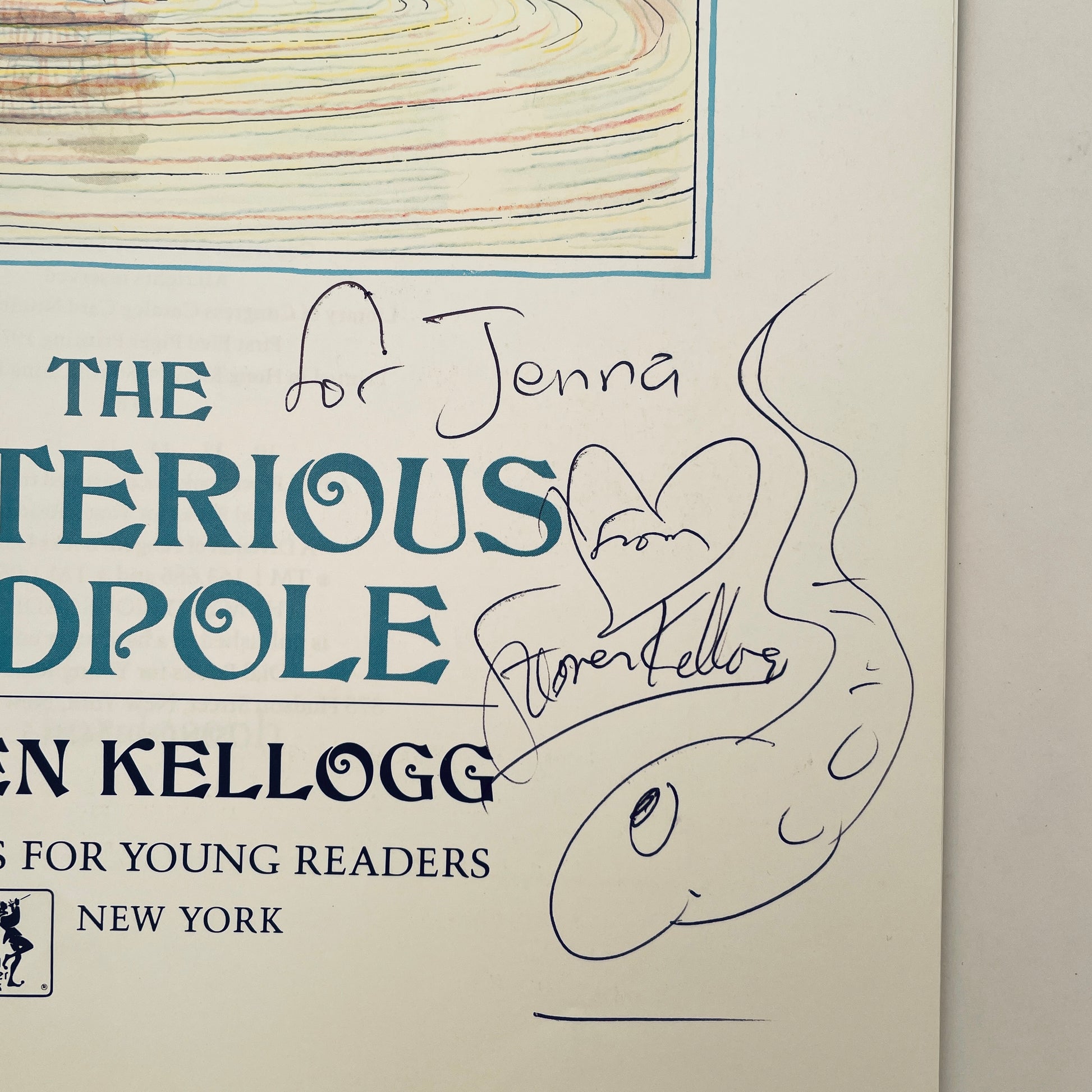 The Mysterious Tadpole concerns a boy who receives a birthday gift from his uncle in Scotland each year. This particular year he receives a tadpole. As the tadpole grows larger and larger, the boy enjoys teaching it to retrieve objects. Eventually, the tadpole grows so large that the boy decides to keep it in the swimming pool of the local junior high school for the summer. When school resumes, the boy must find a new home for his enormous pet. The boy pleads with the librarian to help him raise money to buy the parking lot near his home where a pool can be constructed for the creature. The librarian recalls that a pirate treasure ship was sunk long ago in the local harbor. Since the boy's pet had become so good at retrieving things, it just might be able to uncover the treasure. Sure enough, the creature retrieves the treasure and a pool is constructed for him in the parking lot. The story ends with the boy's uncle arriving at his home with a new birthday present the following year...