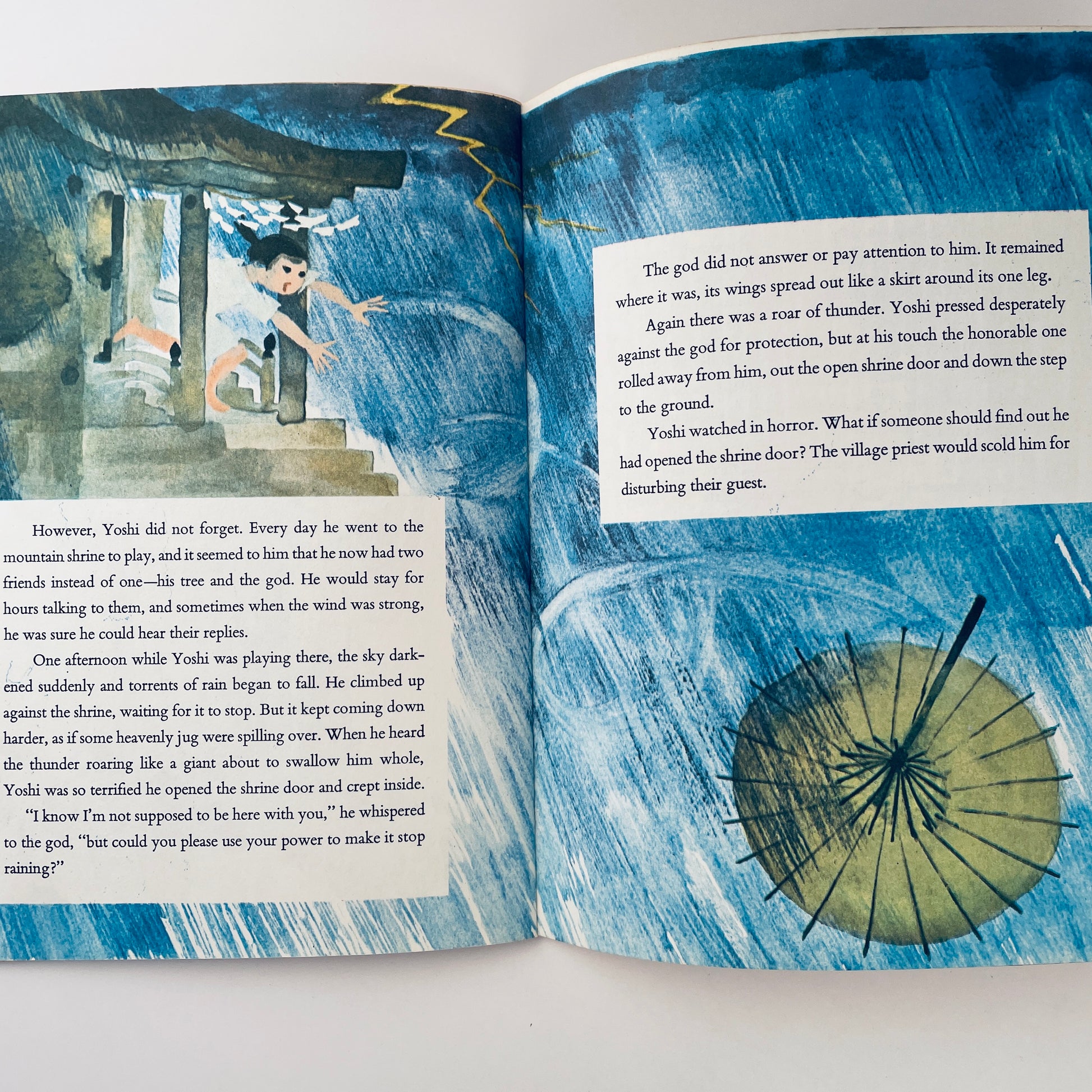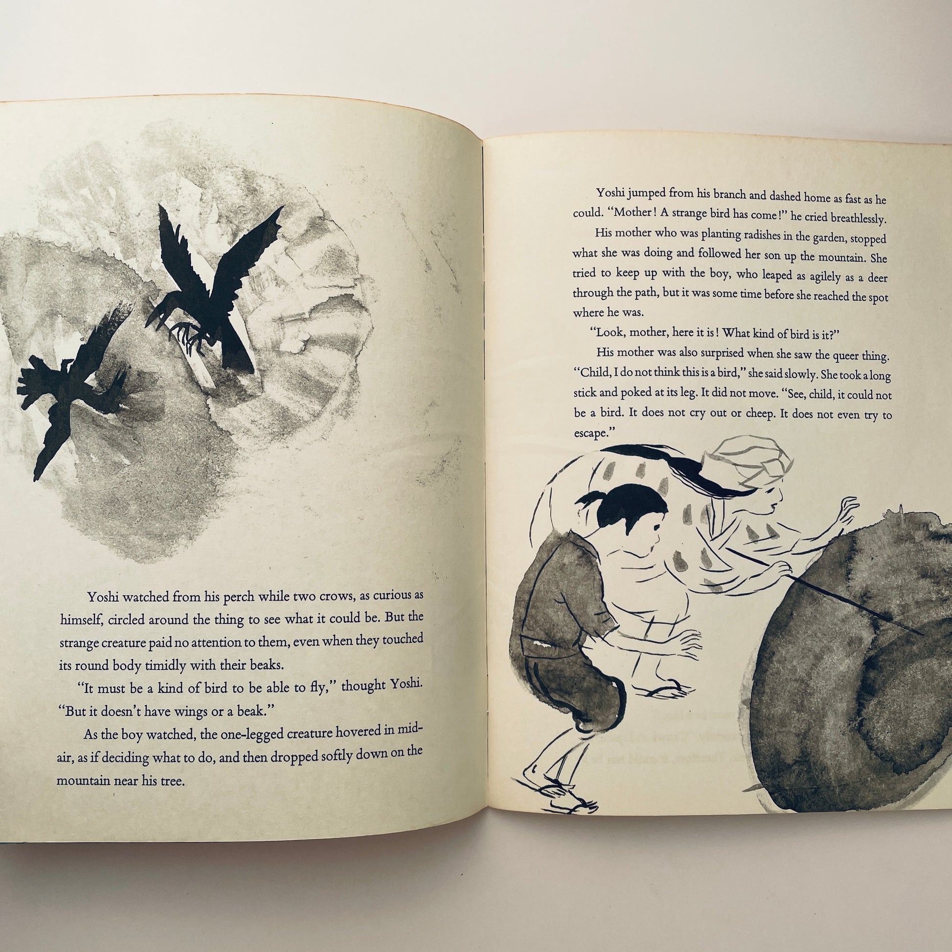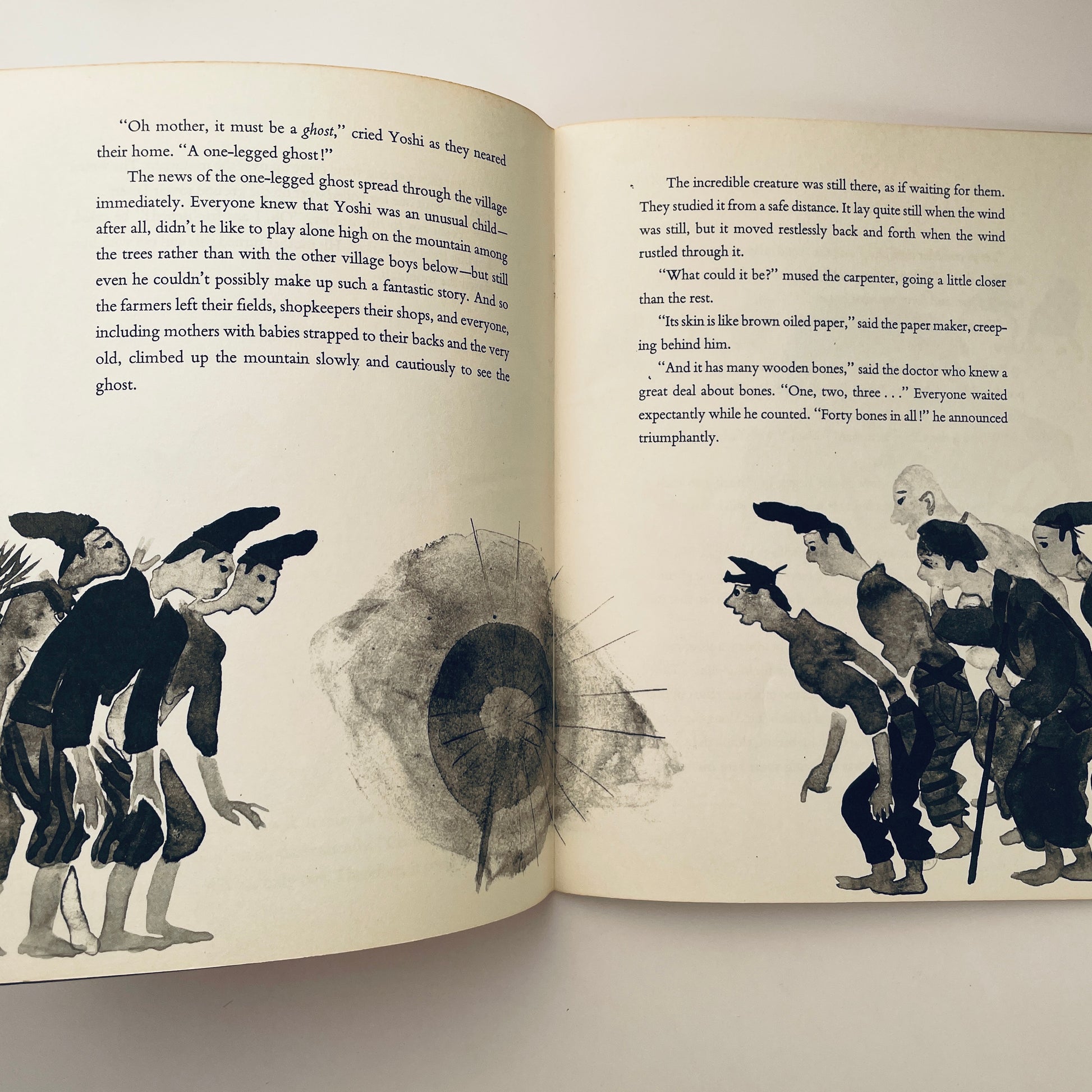 One day a Japanese boy sees a strange one-legged creature fly over the mountain. All the villagers gather around it but no one knows what it is. This is a legend from the old days of Japan. But it is also a story of people everywhere confronted by a new and strange thing.