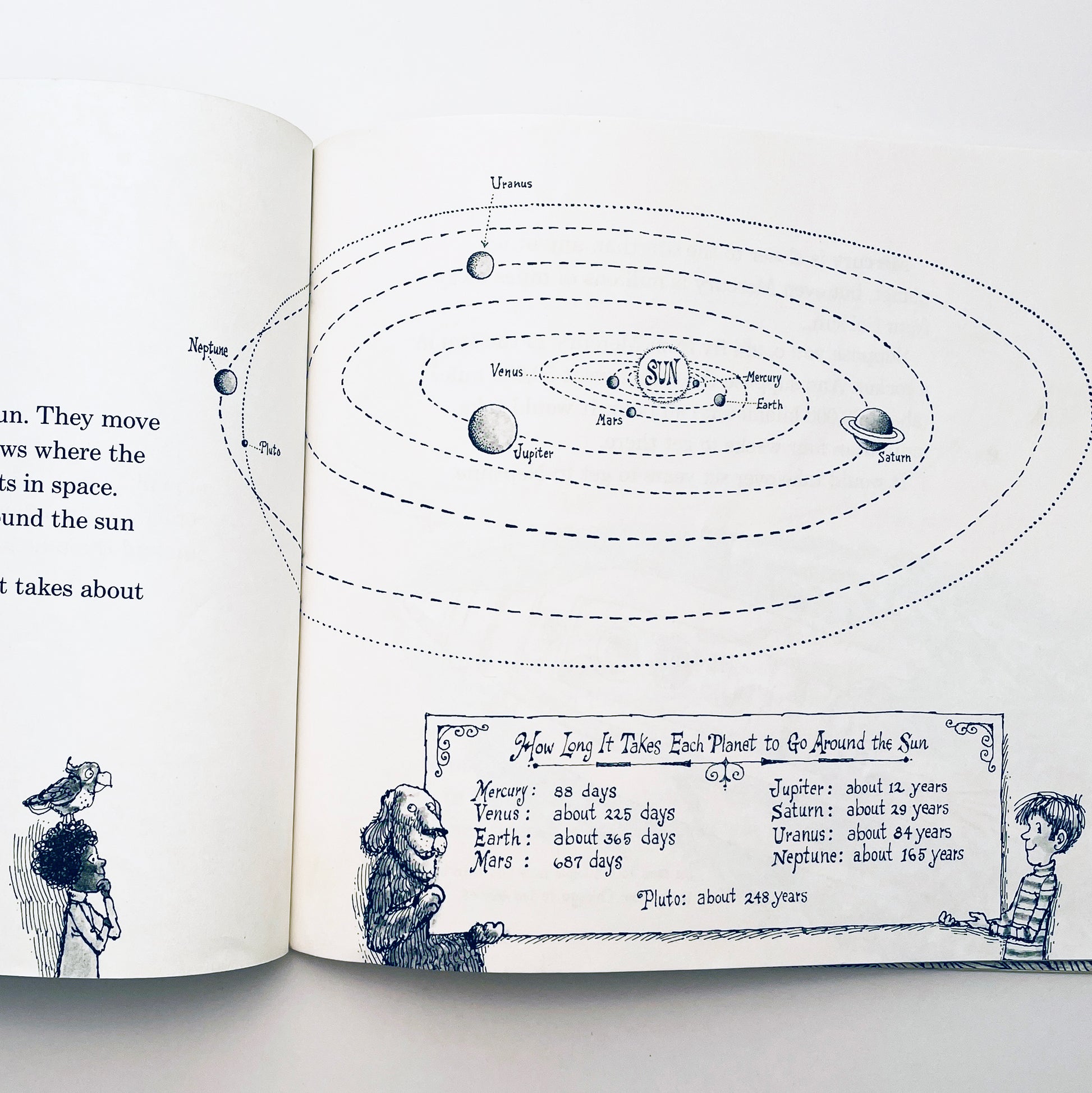Out planet Earth takes 365 days to go around the sun. The planet Pluto takes almost 248 years! The planet Jupiter is so big that if it were a large, hollow ball, over 100 Earths could fit inside. The planet Mercury is so hot that plants and animals cannot live on it–they would burn up.