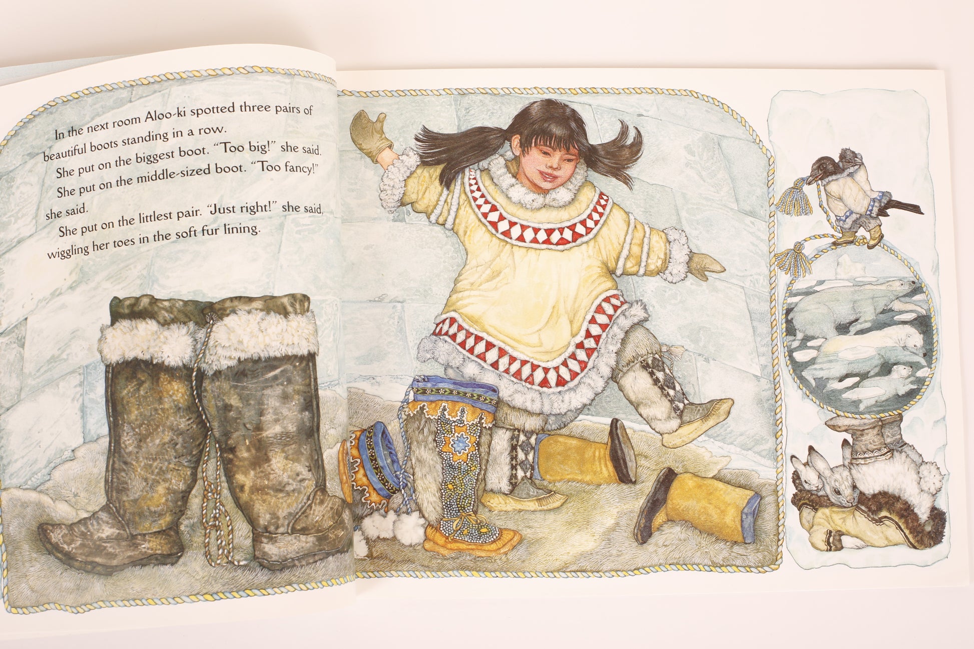 When Aloo-ki's sled dogs float away on an ice floe, she goes looking for them. She comes upon an igloo with no one home and goes inside. In the meantime, Mama, Papa and Baby Bear swim out and rescue Aloo-ki's dogs. They all go home for breakfast to find a surprise visitor curled up in Baby Bear's bed for a nap.