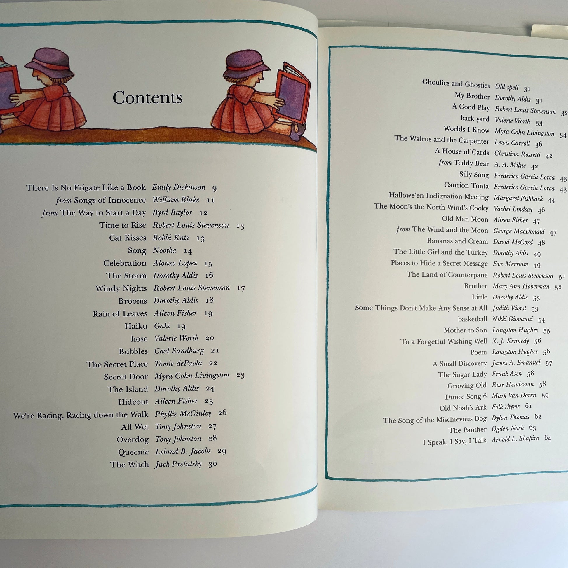 With accompanying illustrations by Tomie dePaola, here are poems ranging from classics by such esteemed poets as Lewis Carroll, William Blake, Robert Louis Stevenson, Langston Hughes and Robert Frost, to selections from such acclaimed modern poets as Jack Prelutsky, Nikki Giovanni, X. J. Kennedy, Eve Merriam and Byrd Baylor. There are poems just right for any mood, including funny nonsense poems, poems about animals and parents and friends, and quiet bedtime poems to read just before sleep. With each new page comes another joyful surprise to win children's hearts in this wonderfully inspired introduction to poetry.