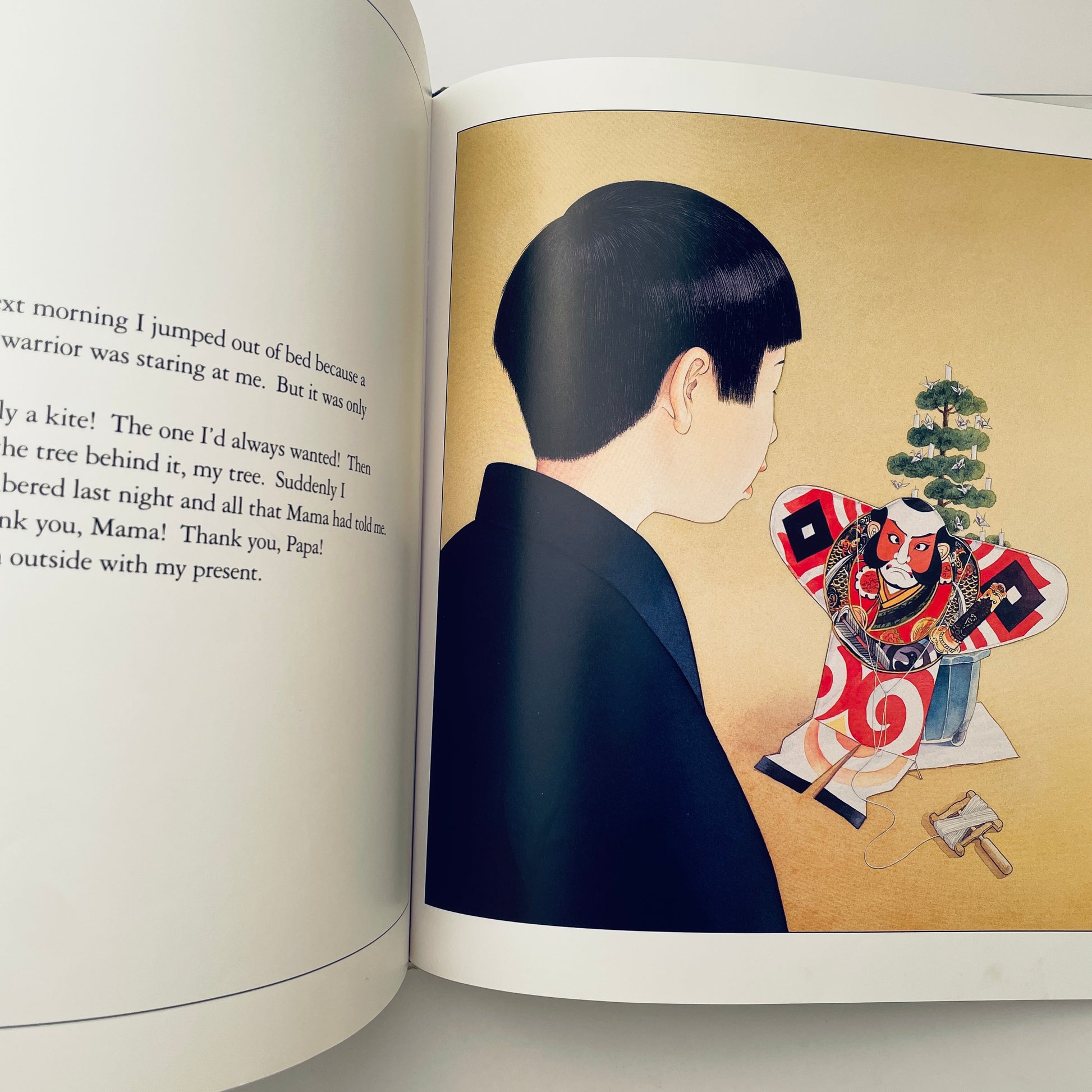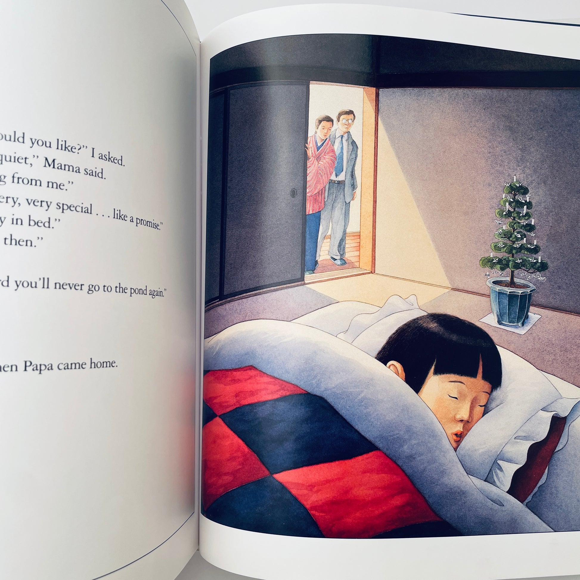 As a young Japanese boy recovers from a bad chill, his mother busily folds origami paper into delicate silver cranes in preparation for the boy's very first Christmas.