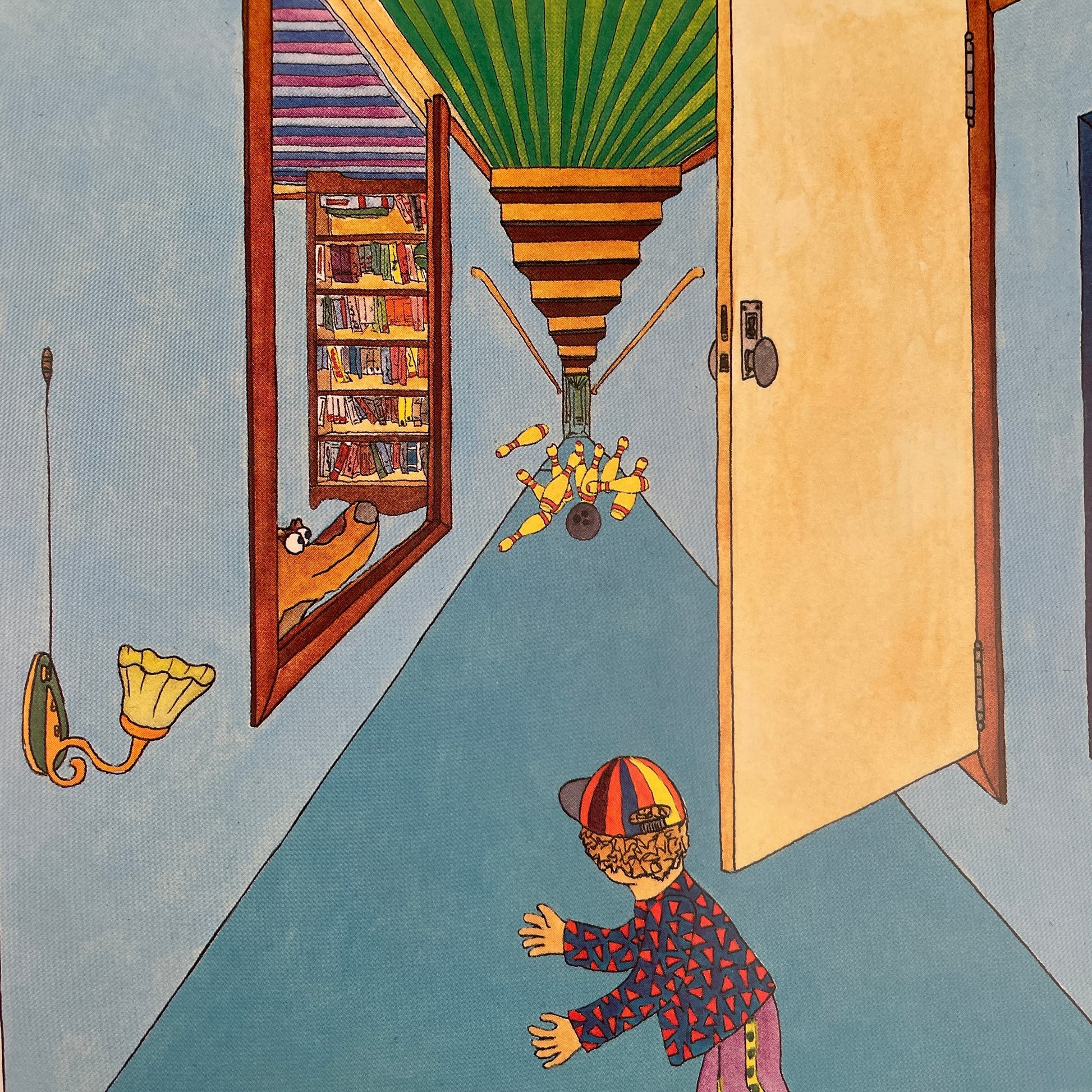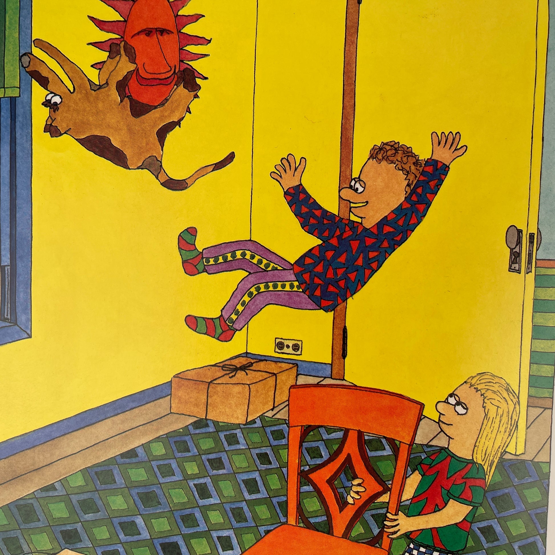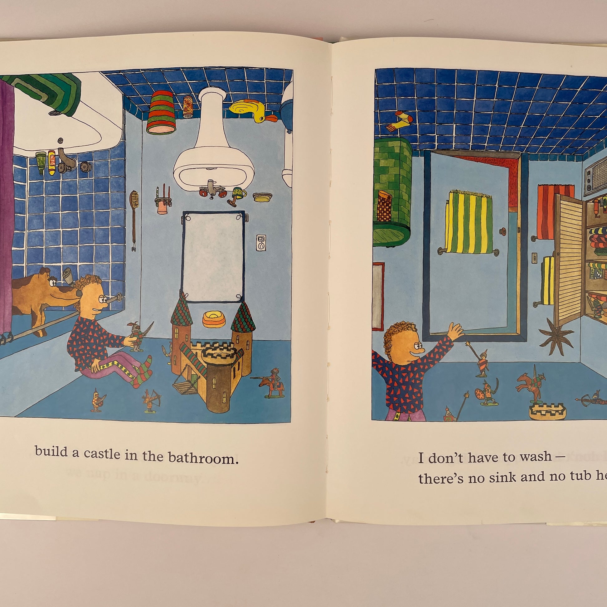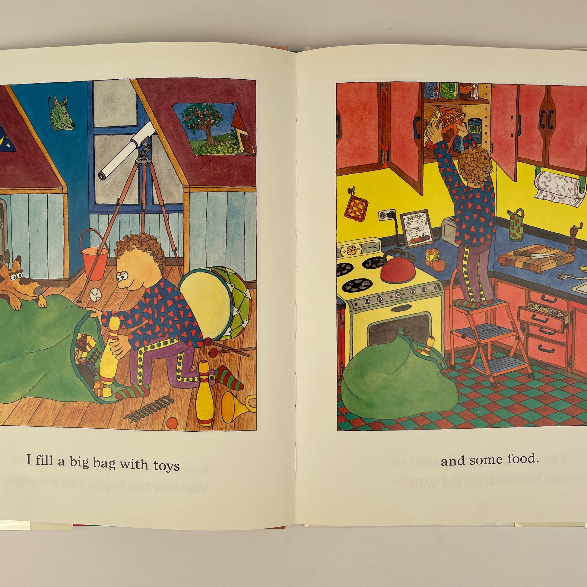 Kirkus Review from 1992: Everywhere the small narrator goes, someone in his family is busy and asking him to be quiet. Resourcefully, he packs a big green sack with food and toys and, with his dog, walks up the wall to the ceiling, which provides ample uncluttered space for skateboarding, bowling, or spreading out belongings. Heller visualizes this pleasing fantasy in vibrant, sophisticated colors and perspectives so precise that the pictures can be read either right-side up—so that everyday life and objects hang from a floor that's now overhead—or upside-down, with boy and dog defying gravity. A novel notion, elaborated with imagination and style. This is a first edition of the book in mint condition.
