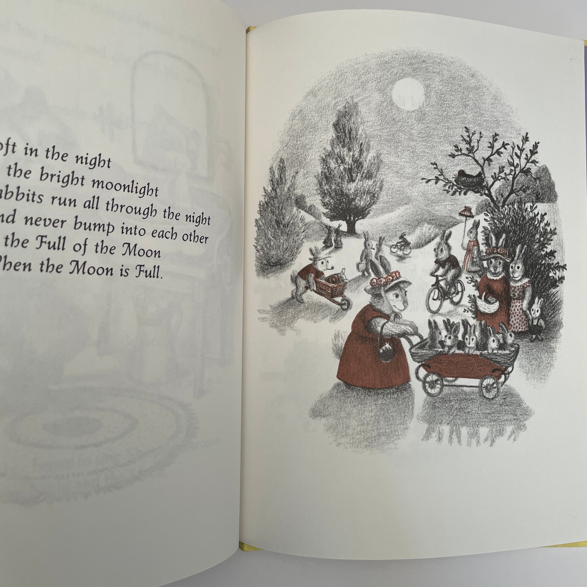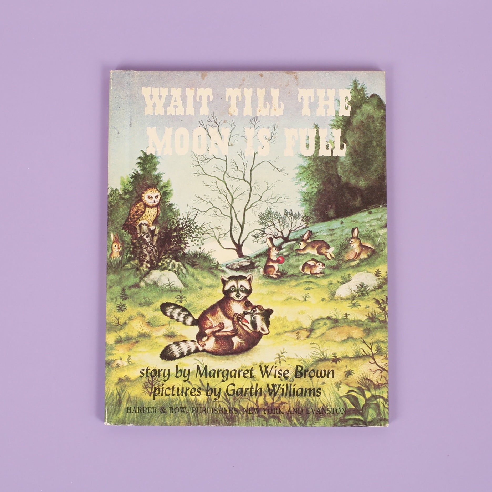 There was once a little raccoon who wanted to go out in the night – to know an owl, to see if the moon is a rabbit, and to find out how dark is the dark. But his mother said, "Wait. Wait till the moon is full." So the little raccoon waited and wondered, while the moon got bigger and bigger and bigger. Until at last, on a very special evening, the moon was full.