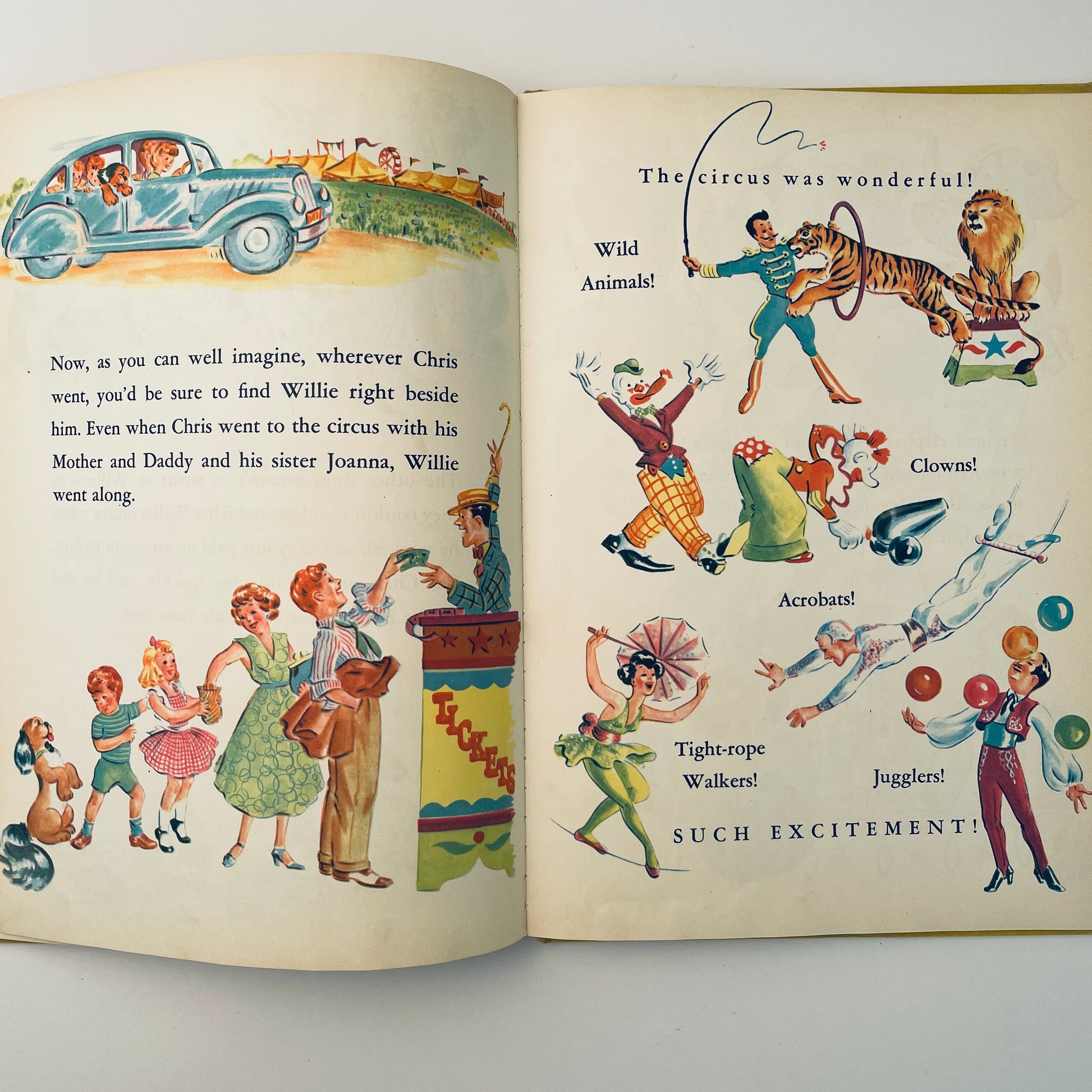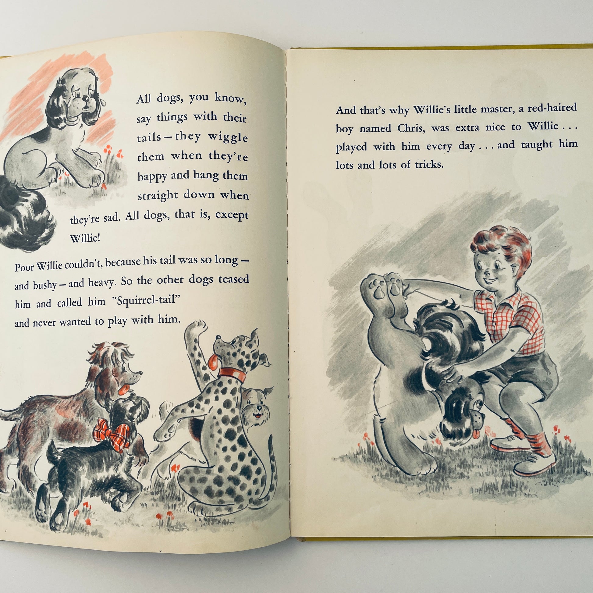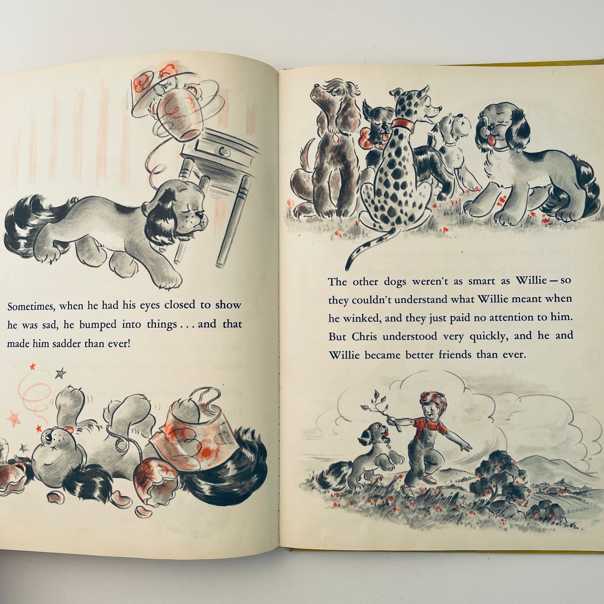 Dartmouth Alumni Review 12/1948: Proceeding on the assumption that the "proof of the pudding is in the eating," we have spoonfed a copy of Robert L. May's Winking Willie on our three unsuspecting juveniles, and the eating thereof proved to be good. Winking Willie is the familiar story of the social pariah, in this instance about a little dog with an out-size tail. The way in which Willie overcomes his disability and triumphs over his uncharitable friends is animated, colorful and satisfying to the child's fast developing regard for achievement. Marion Guild's illustrations are bright, frequent and abetting.