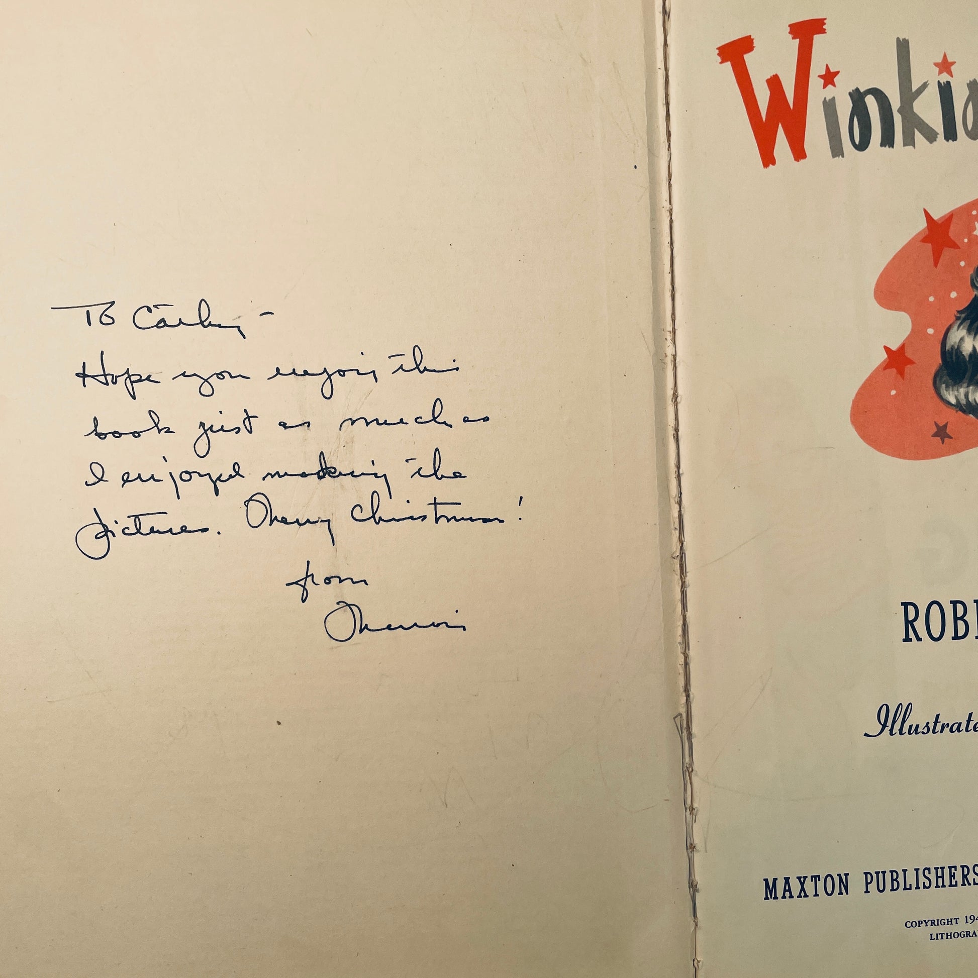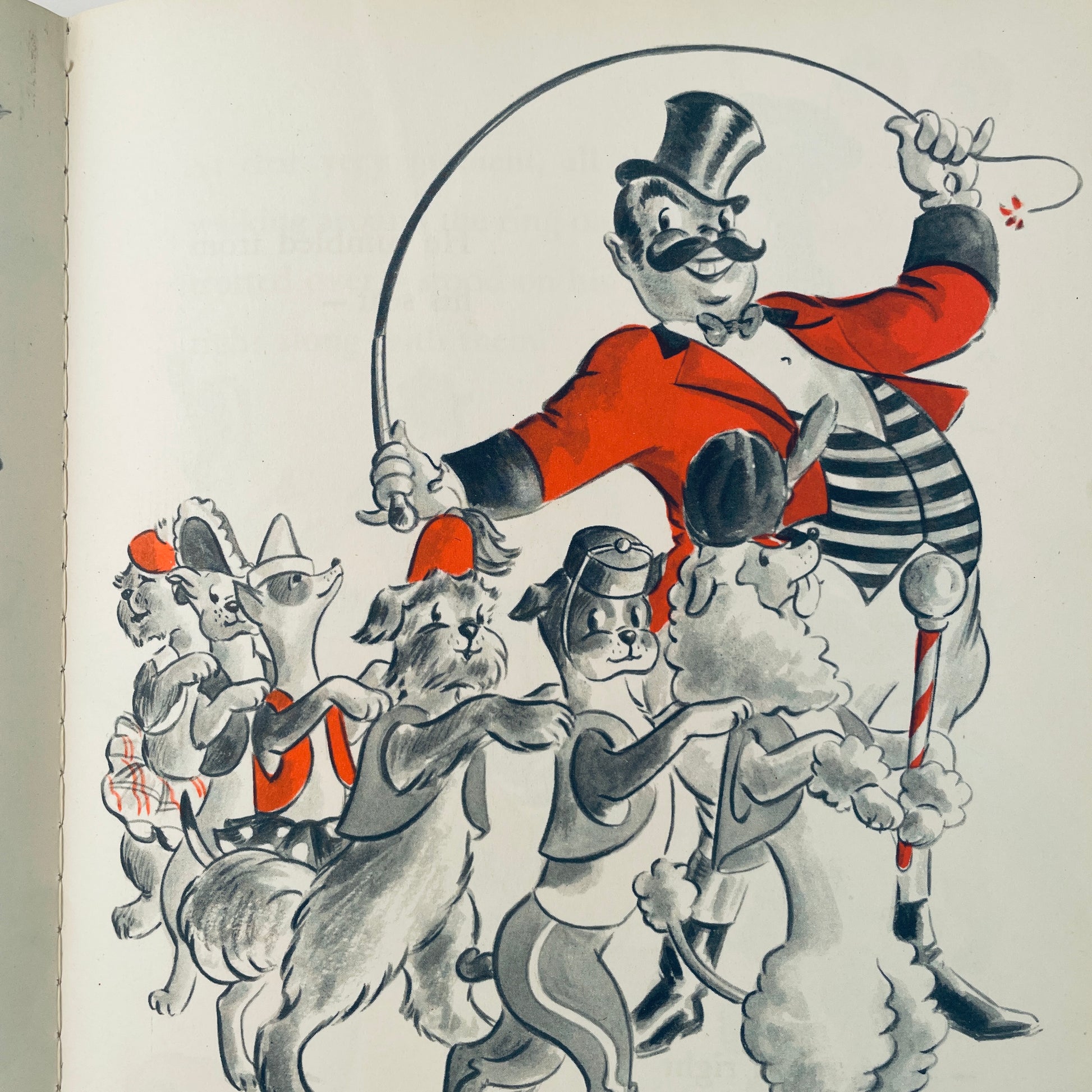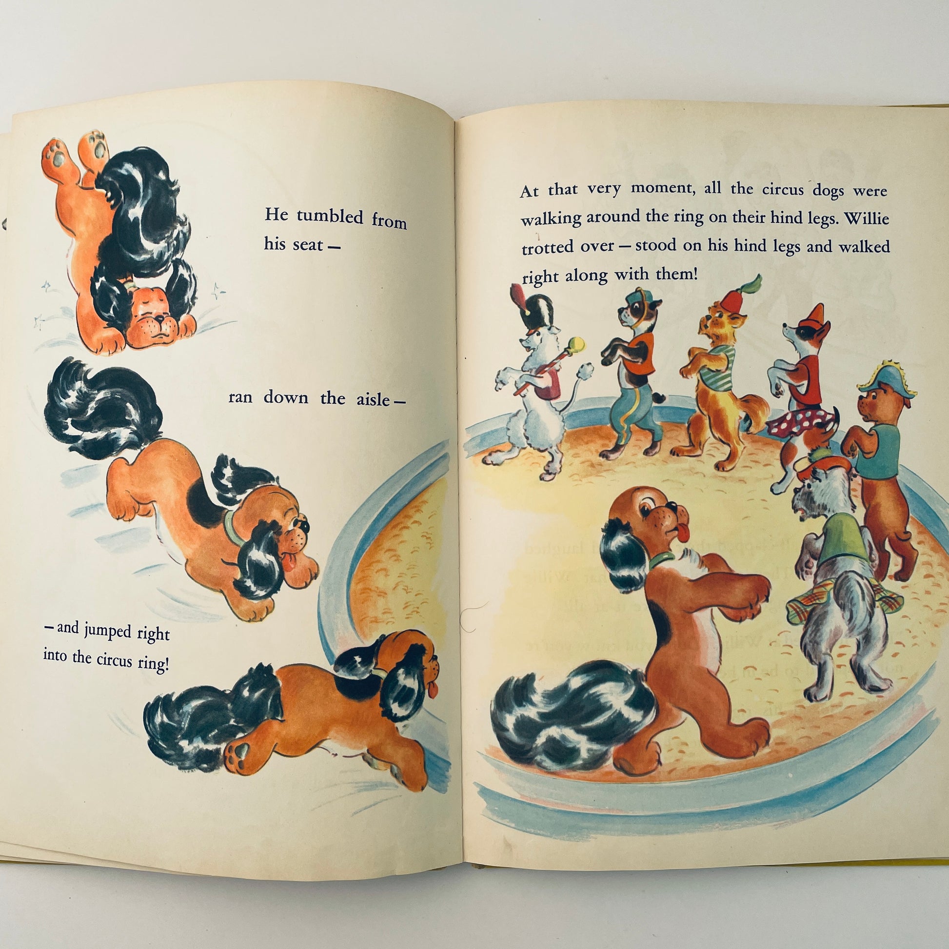 Dartmouth Alumni Review 12/1948: Proceeding on the assumption that the "proof of the pudding is in the eating," we have spoonfed a copy of Robert L. May's Winking Willie on our three unsuspecting juveniles, and the eating thereof proved to be good. Winking Willie is the familiar story of the social pariah, in this instance about a little dog with an out-size tail. The way in which Willie overcomes his disability and triumphs over his uncharitable friends is animated, colorful and satisfying to the child's fast developing regard for achievement. Marion Guild's illustrations are bright, frequent and abetting.
